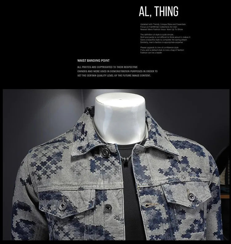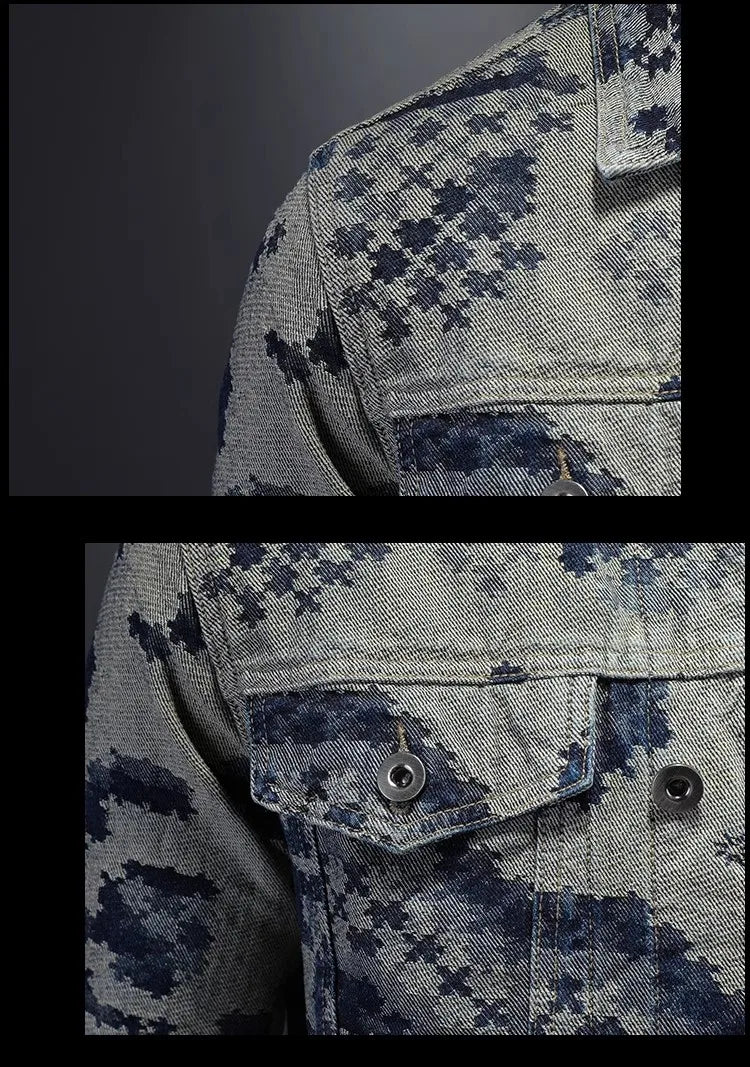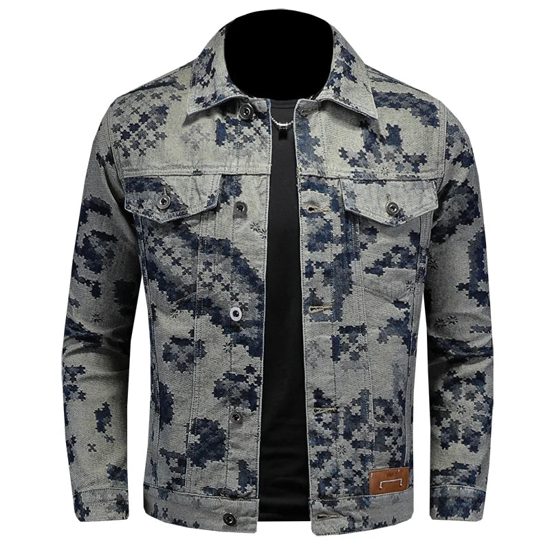 Casual Streetwear Slim Cotton Denim Turndown Collar Abstract Print Jacket for Men
