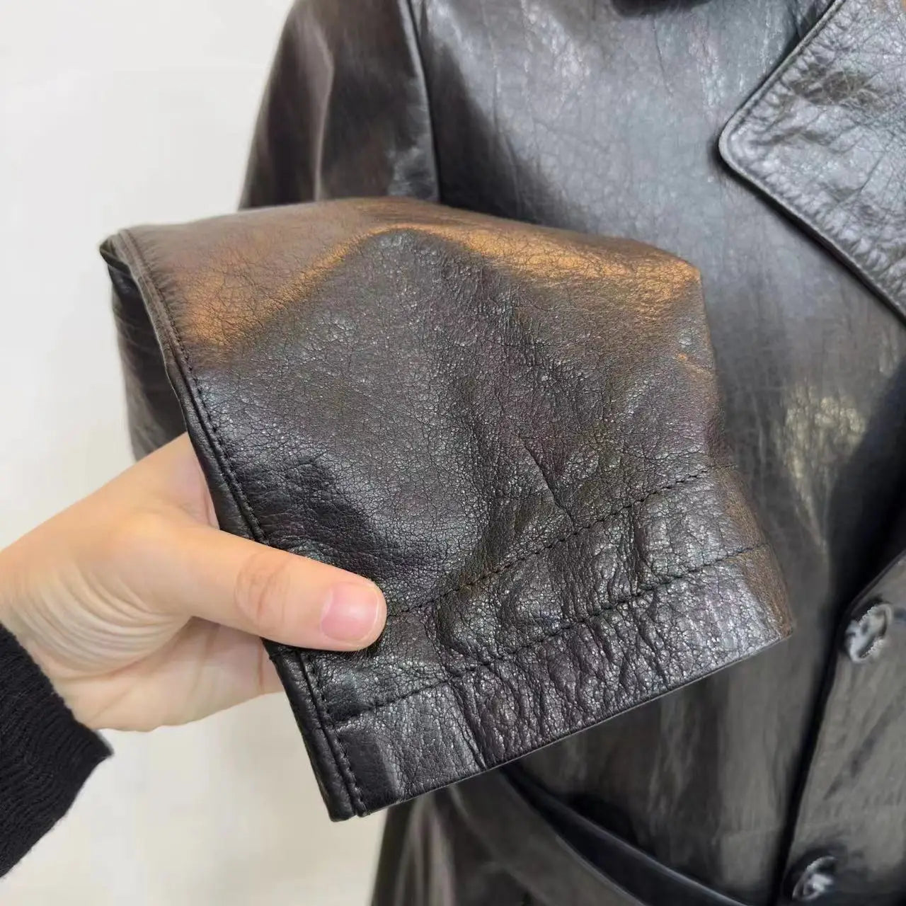 Genuine Leather Turndown Collar Solid Color Belted Trench Coat for Men