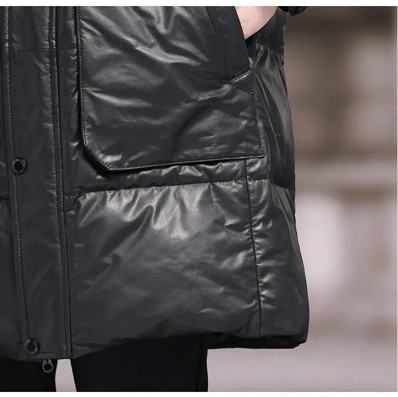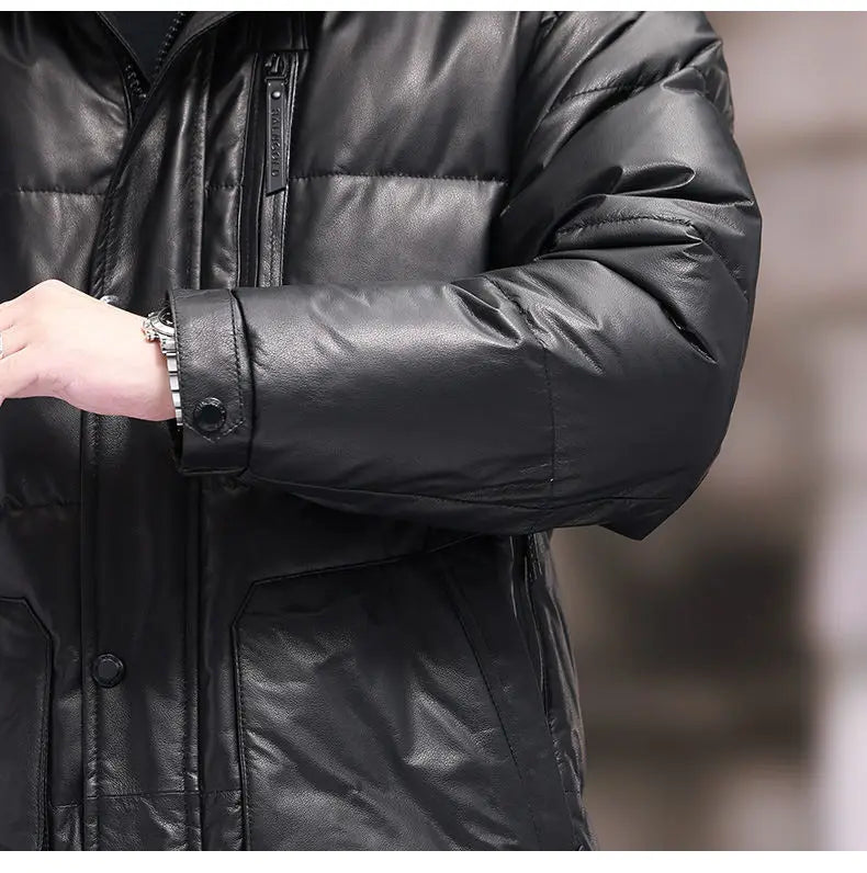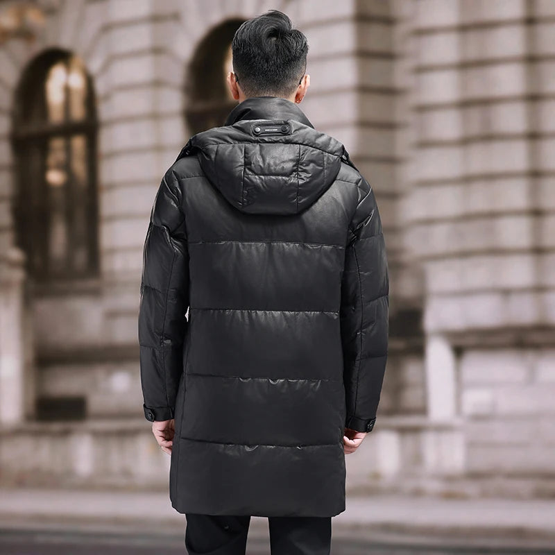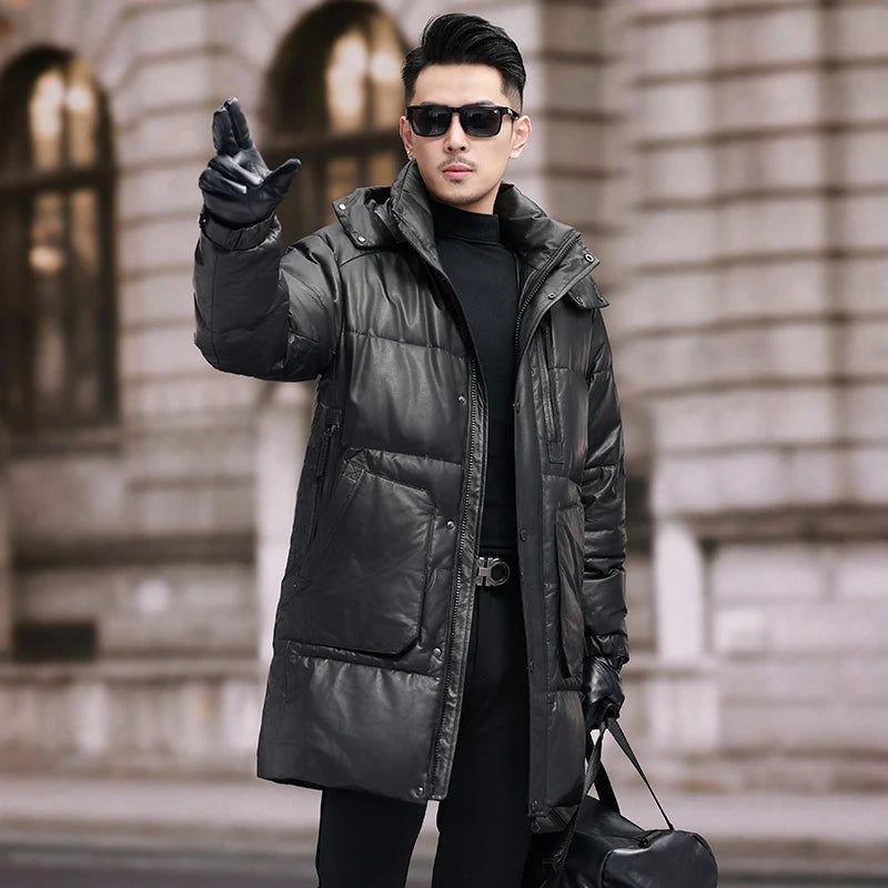 Men's 100% Natural Cow Leather White Duck Down Detachable Hood Trench Coat