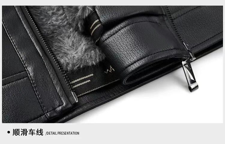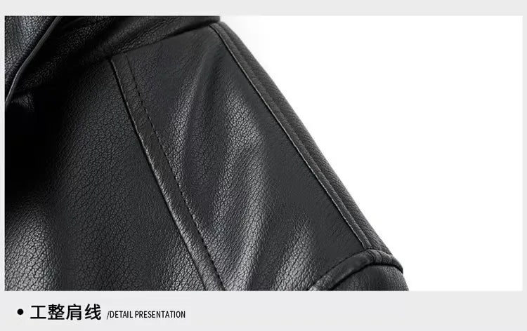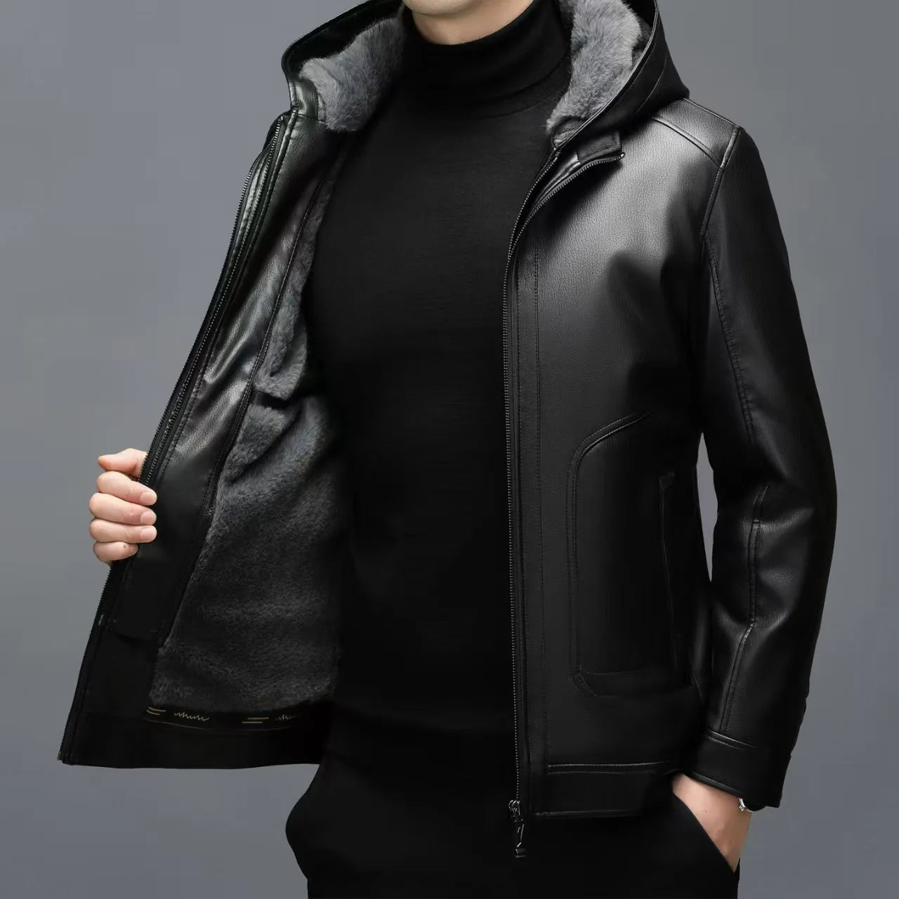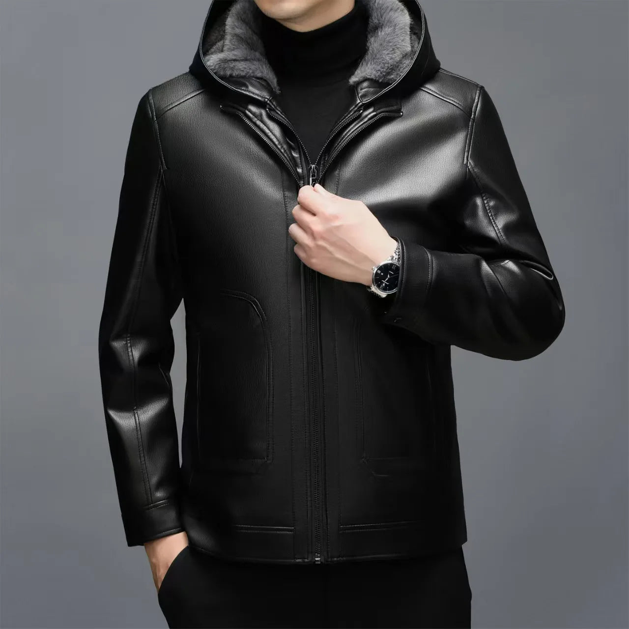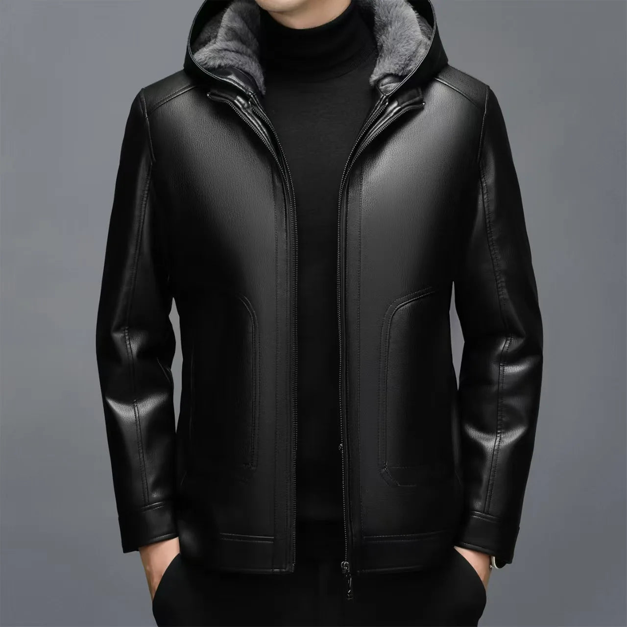Men's Winter Luxury Black Smooth Texture Synthetic Leather Hooded Jacket