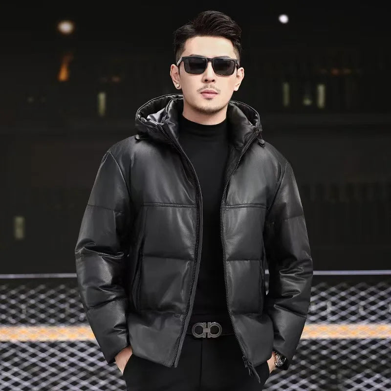 Men's Winter Natural Leather 90% White Goose Down Hooded Jacket