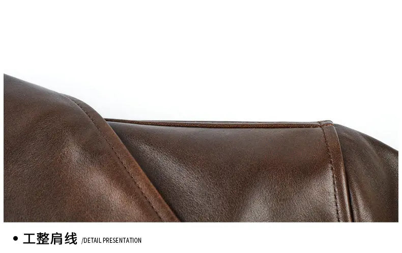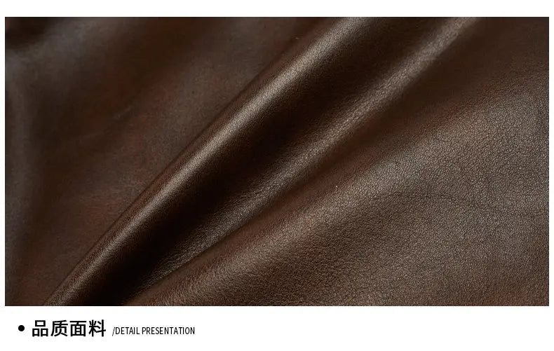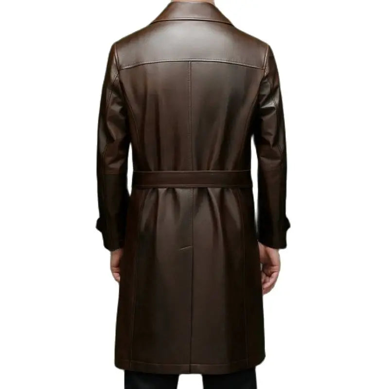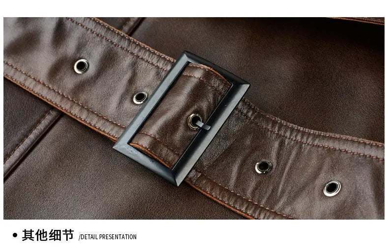 Natural Cow Leather Solid Pattern Button Decor Long Trench Coat for Men