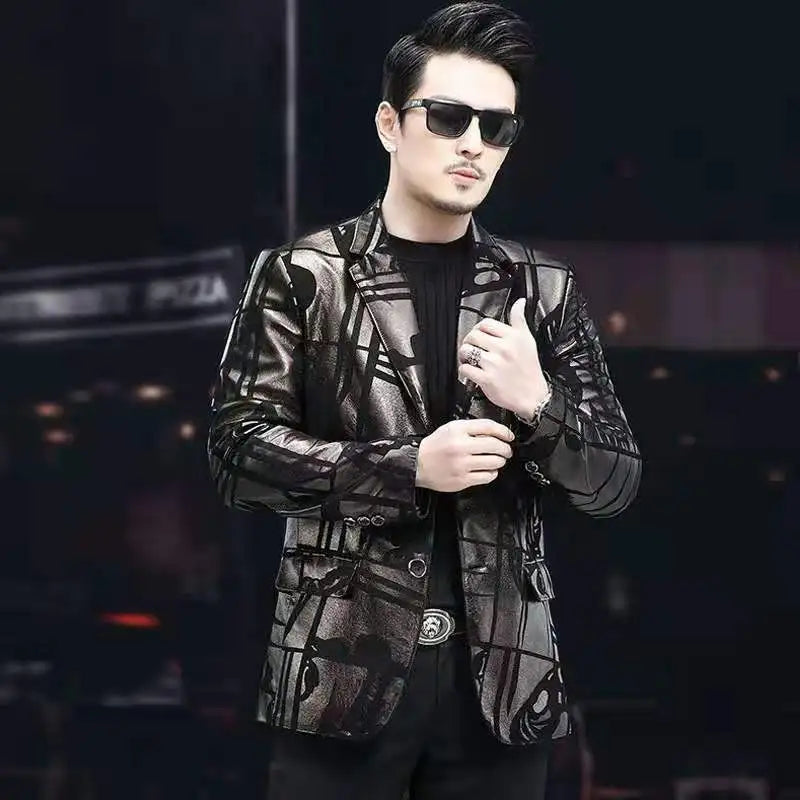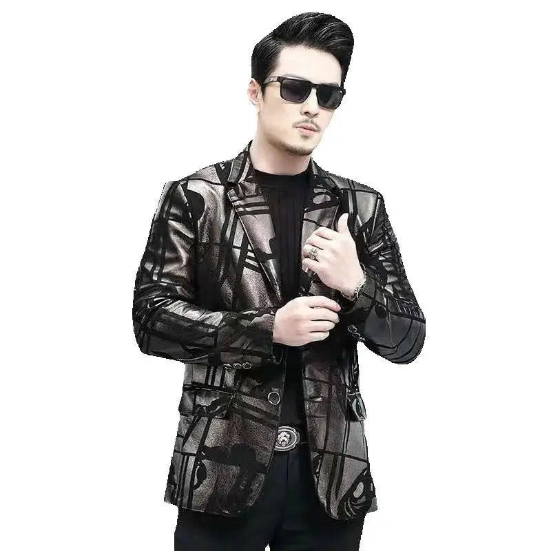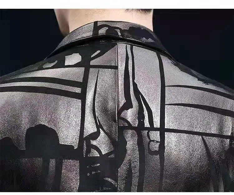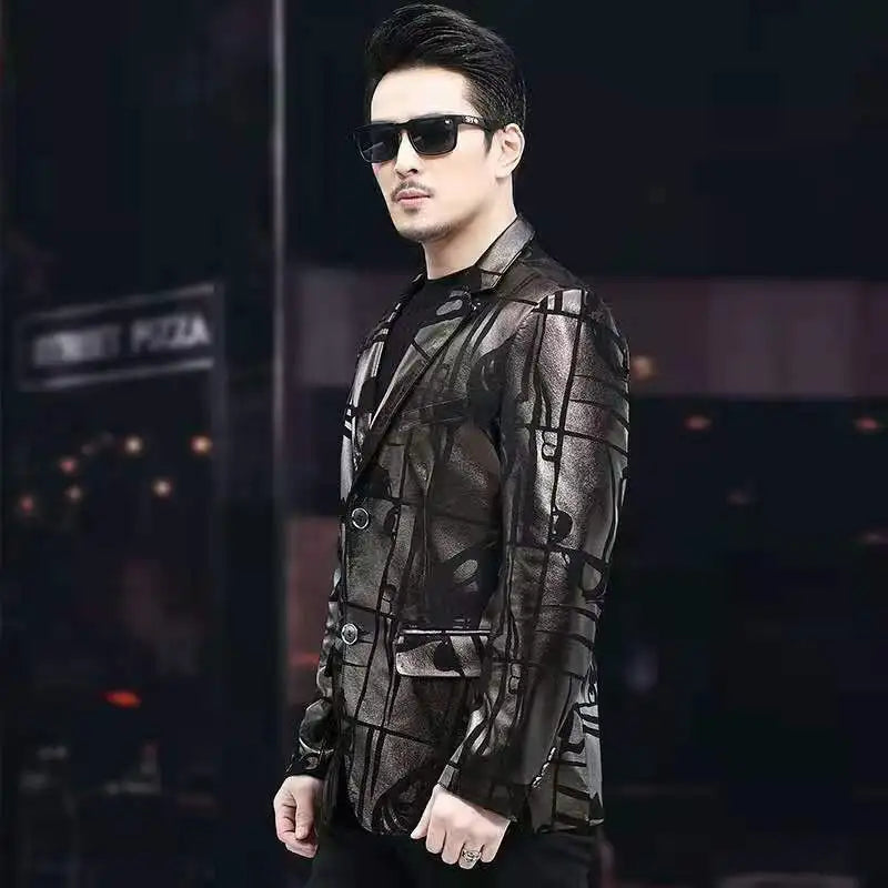 Natural Sheepskin Leather Irregular Stripe Pattern Blazer Jacket for Men
