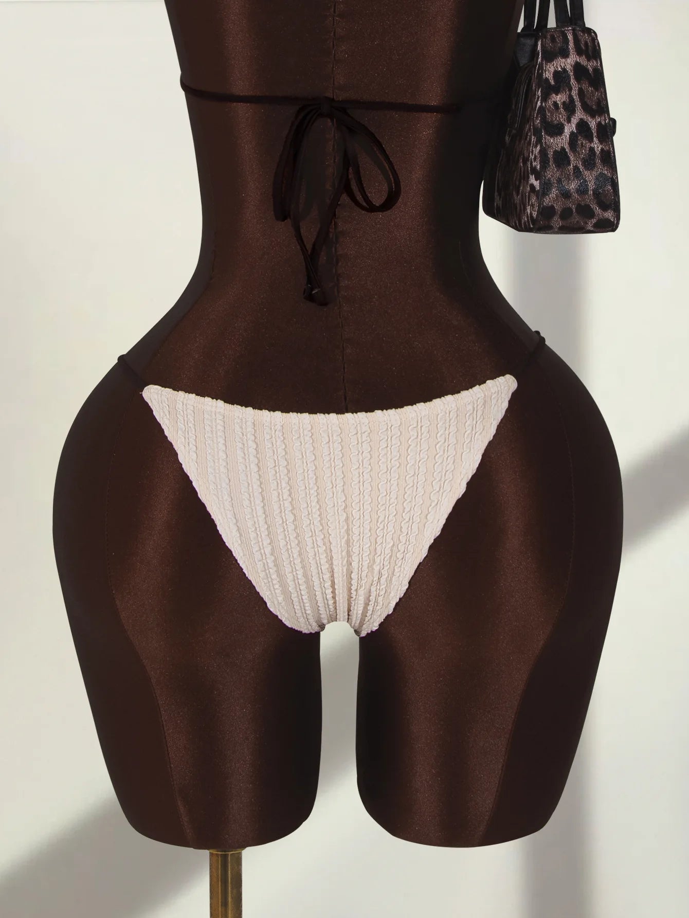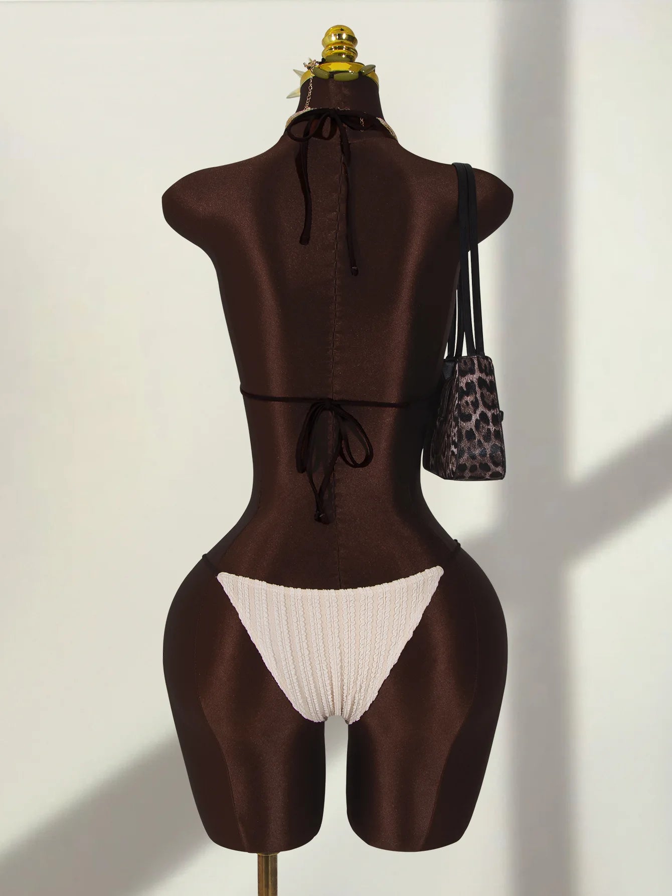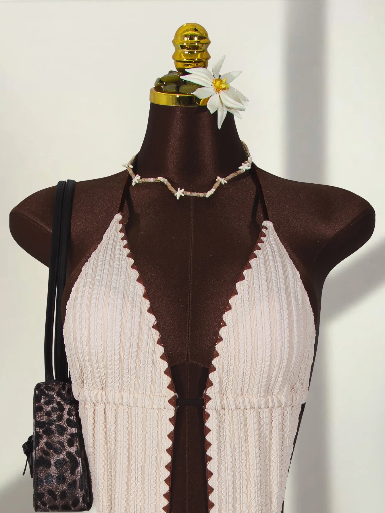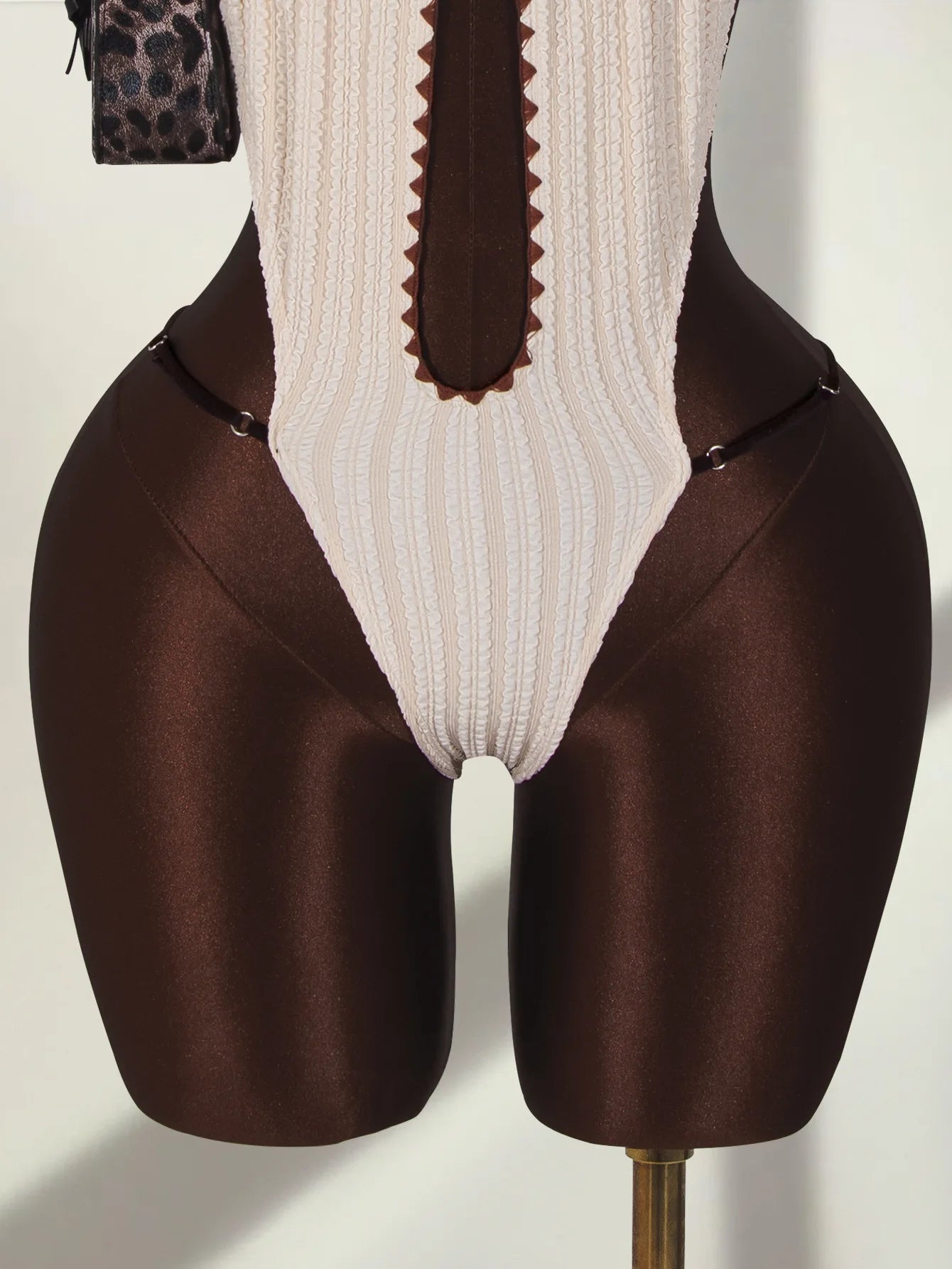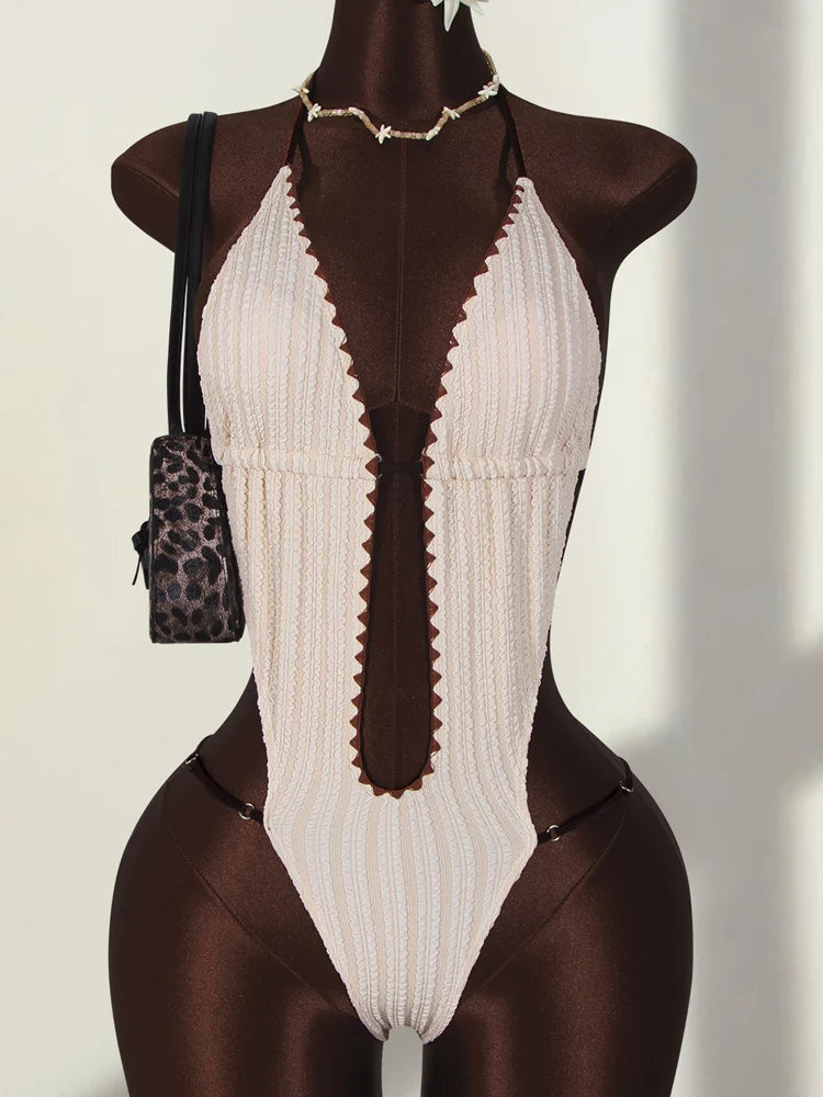 Crafted from nylon and spandex, this swimwear offers both comfort and style. The material feels soft and smooth when worn. The comfortable fit with a hollowout pattern makes it suitable for swimming or relaxing by the water. The beige color with black details adds elegance to your beach look. The stylish shape gives a modern and flattering look.