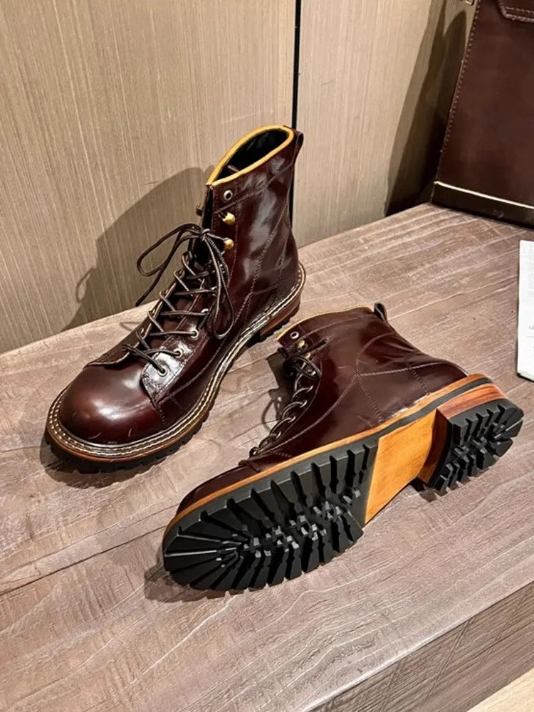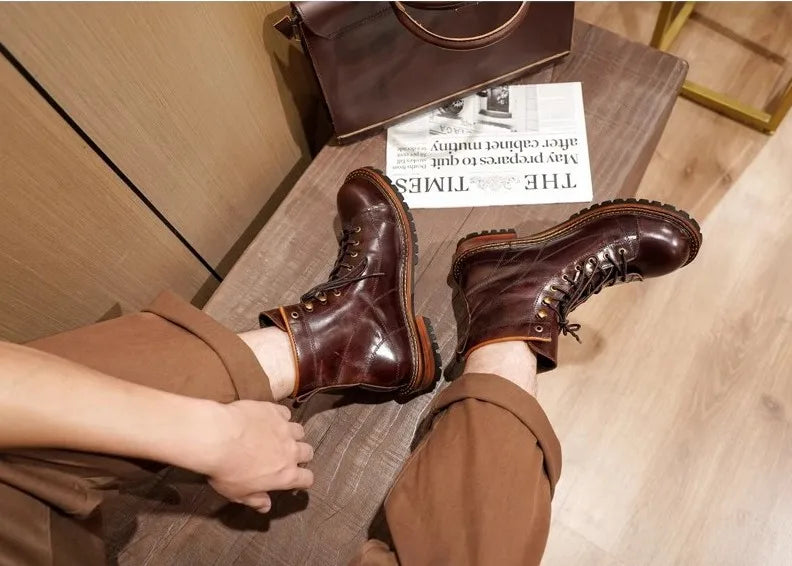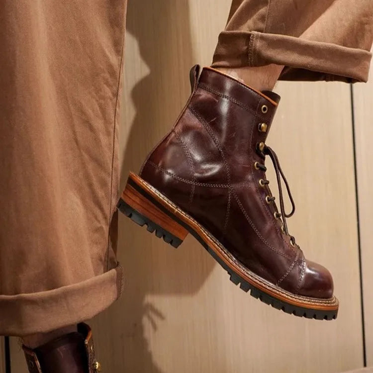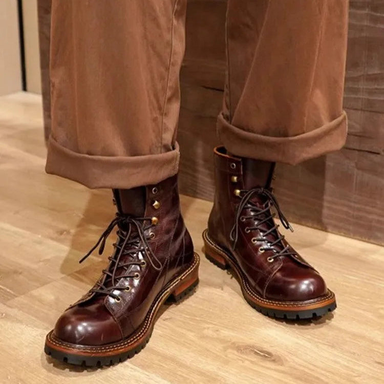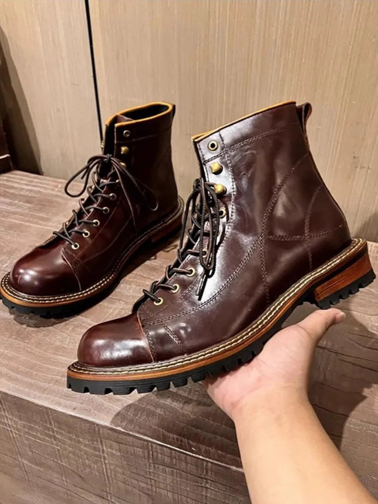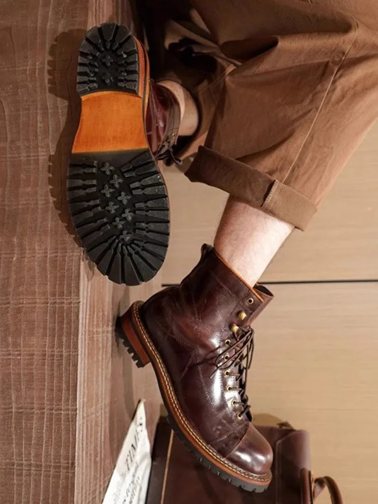 Men's Lace Up High Top Vintage Oil Wax Cowhide Genuine Leather Ankle Boots