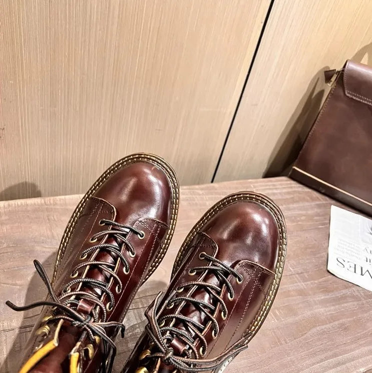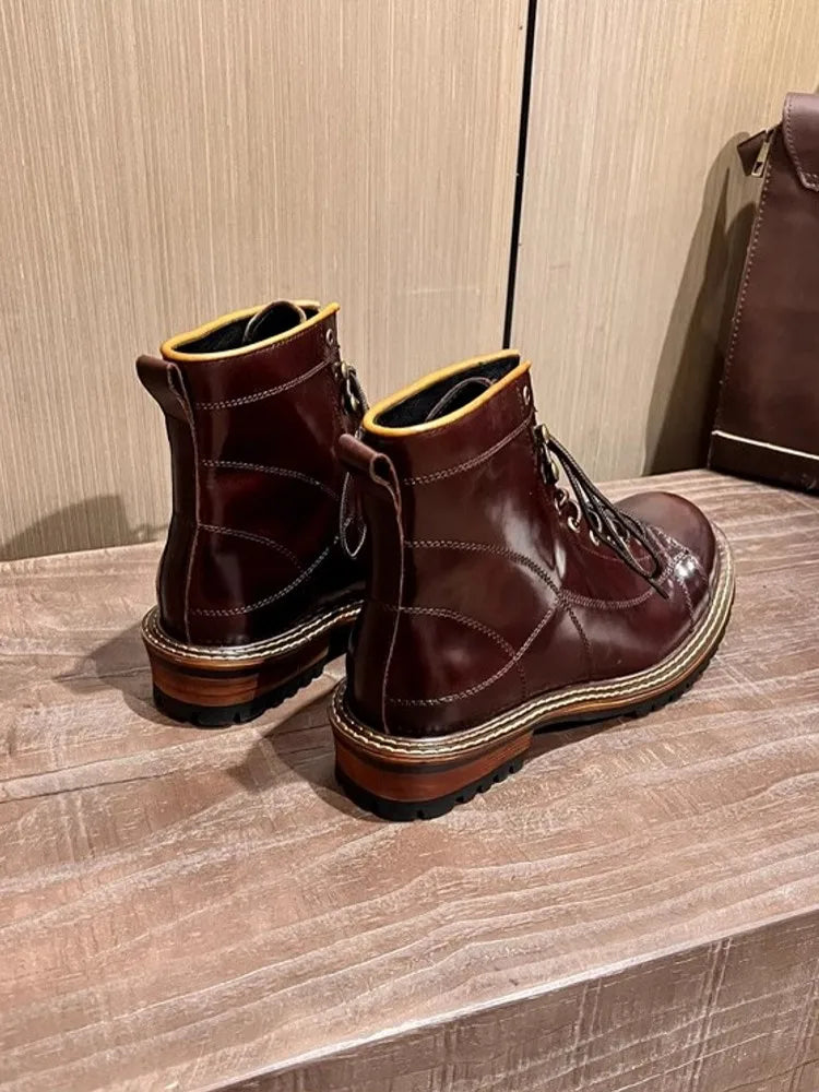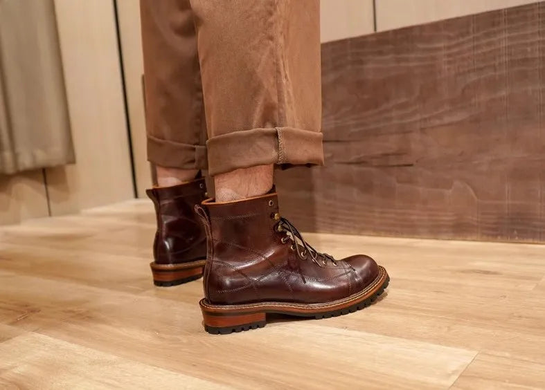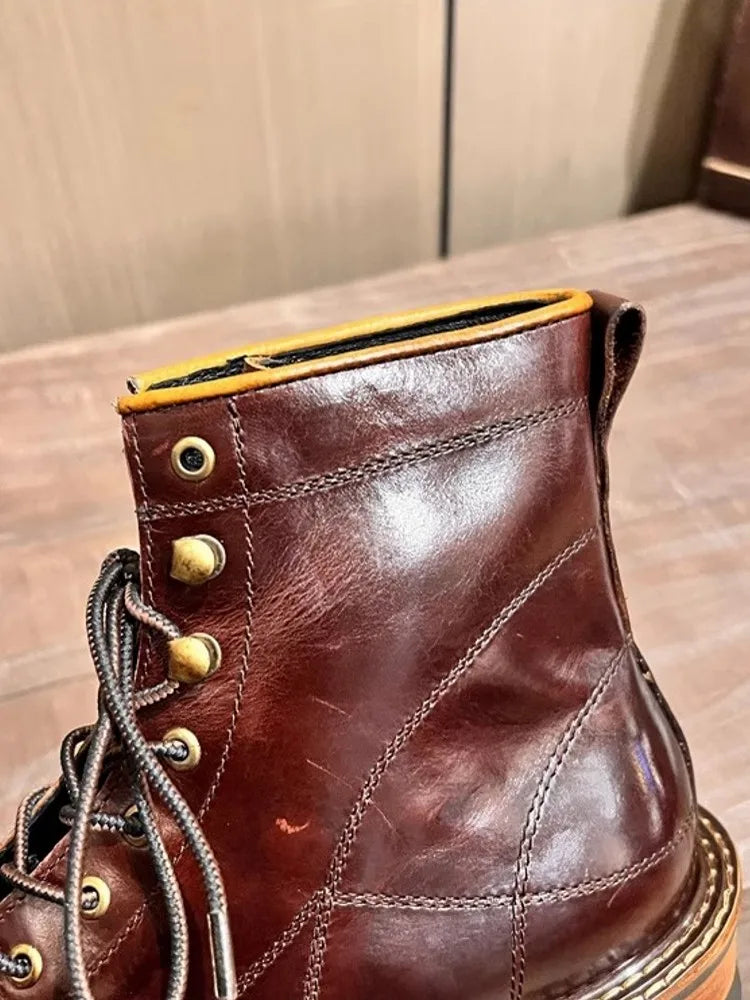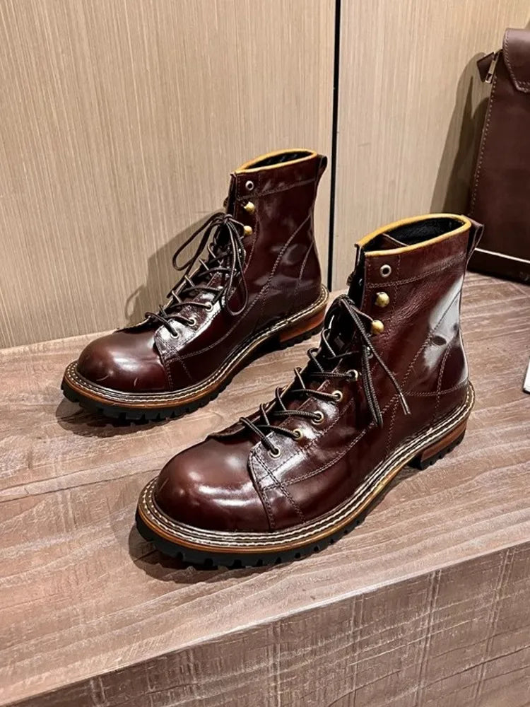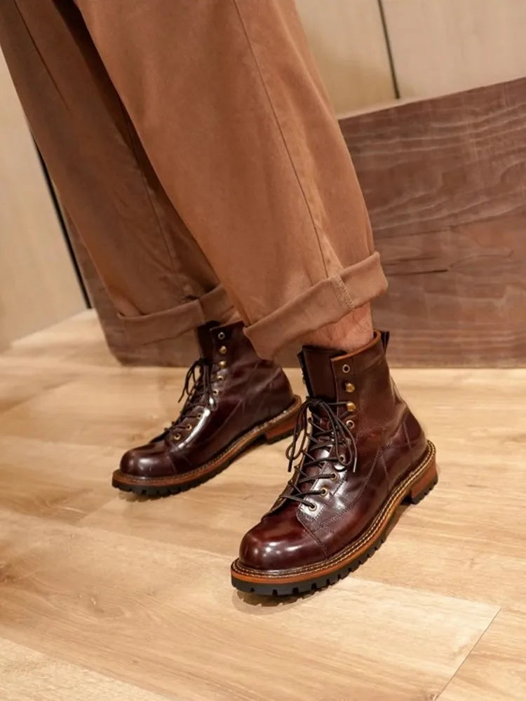 Men's Lace Up High Top Vintage Oil Wax Cowhide Genuine Leather Ankle Boots