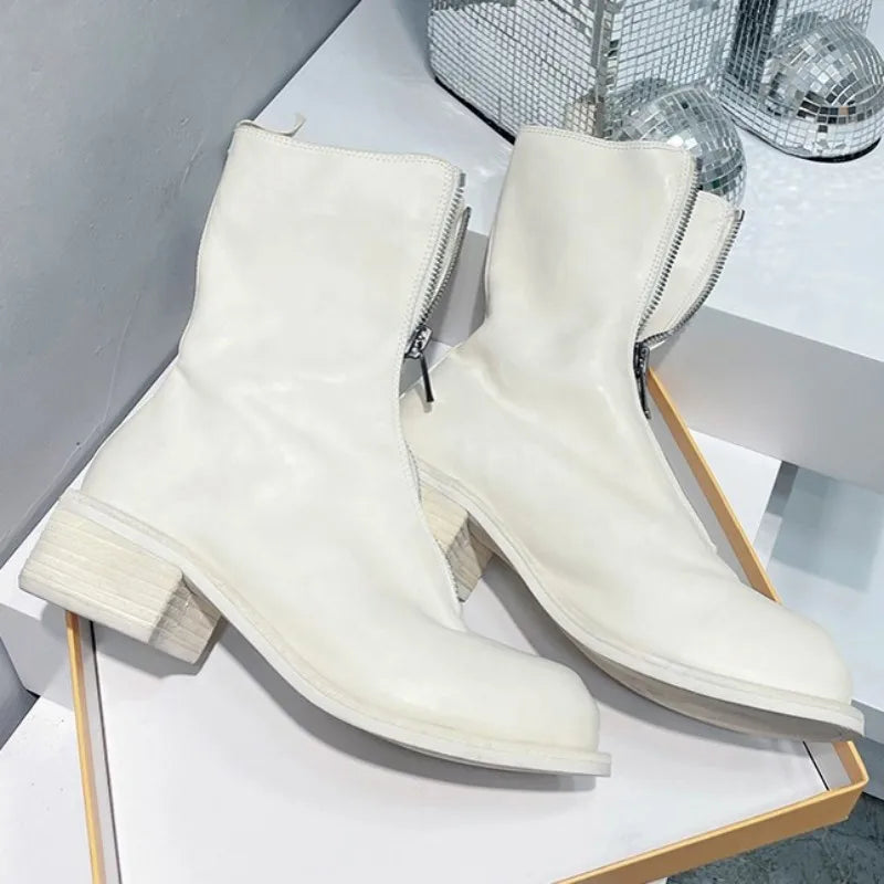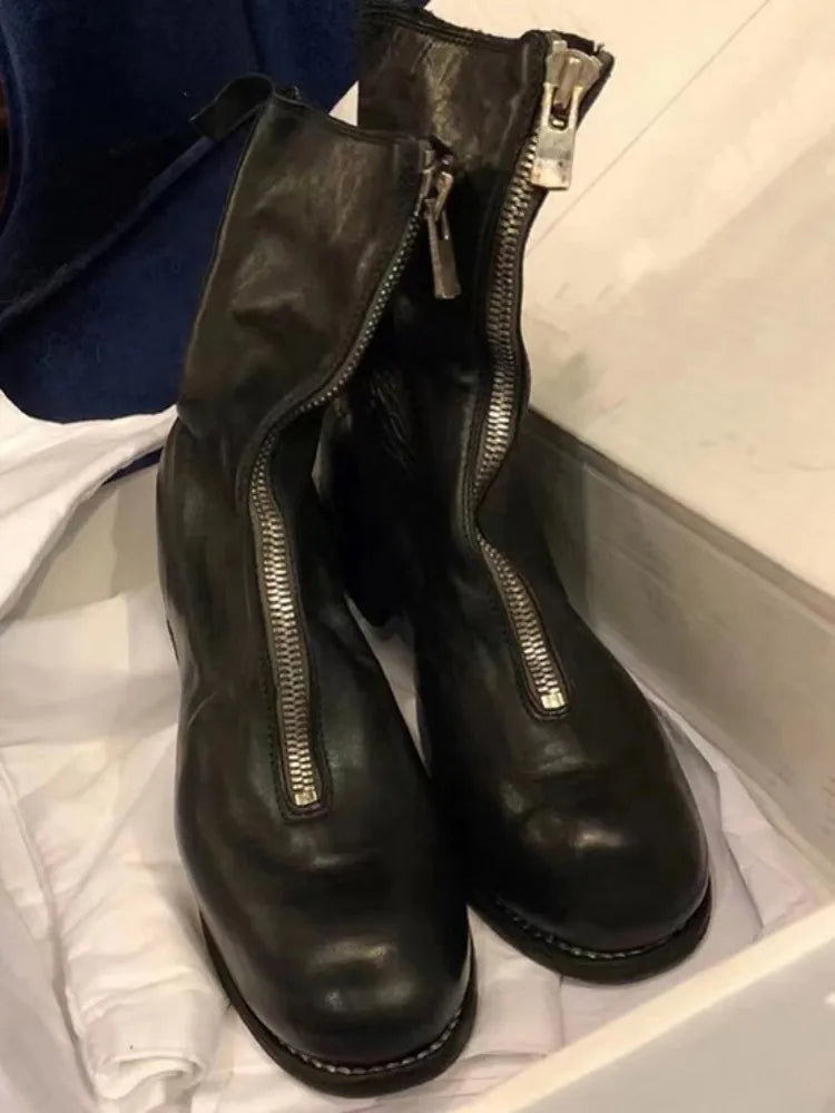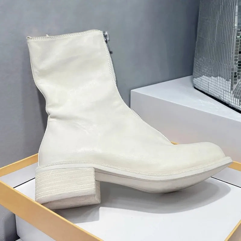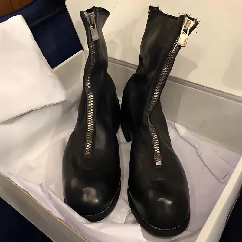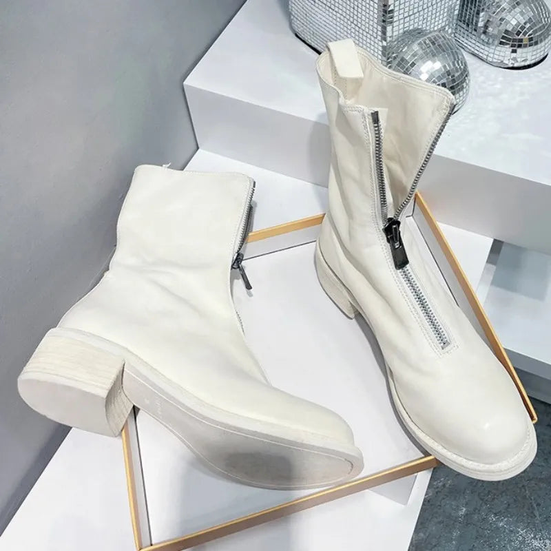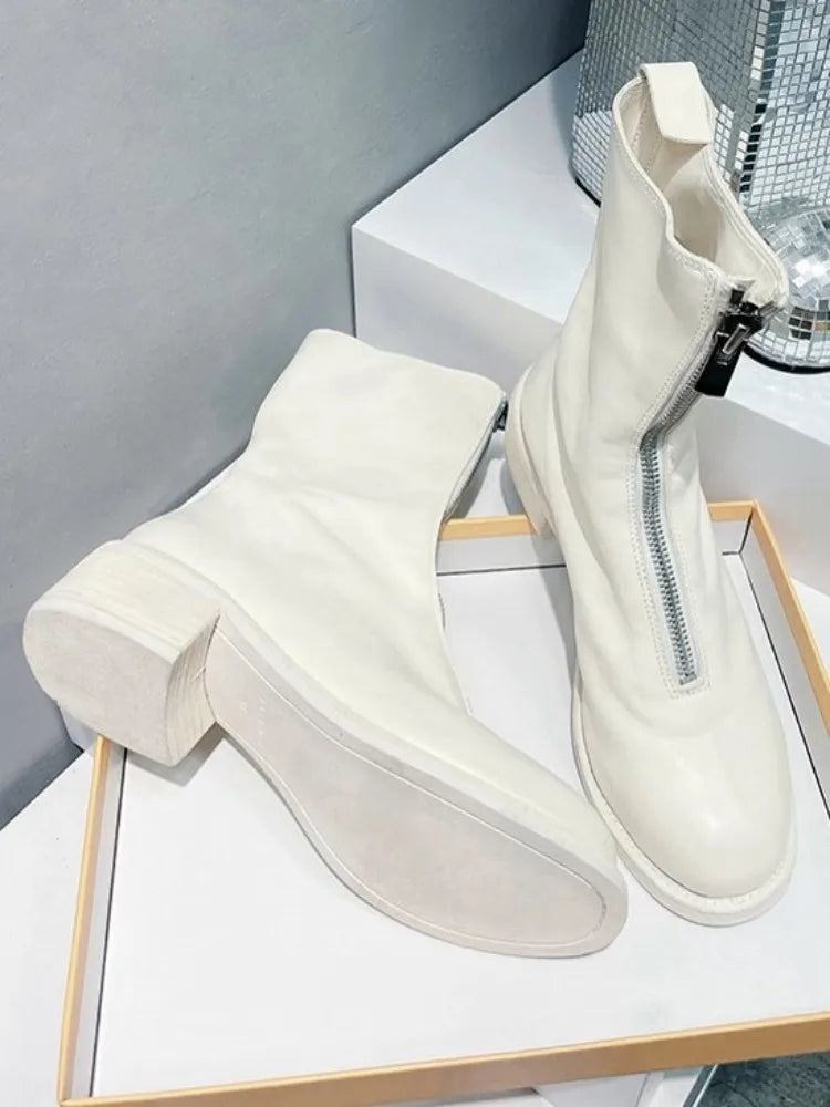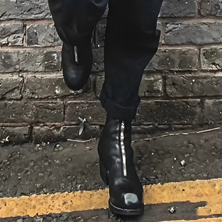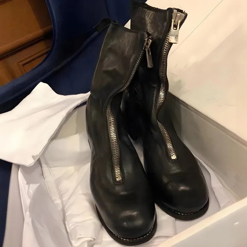 Men's Solid Color Genuine Leather Round Toe Cowhide Height Increasing Zipper Platform Boots