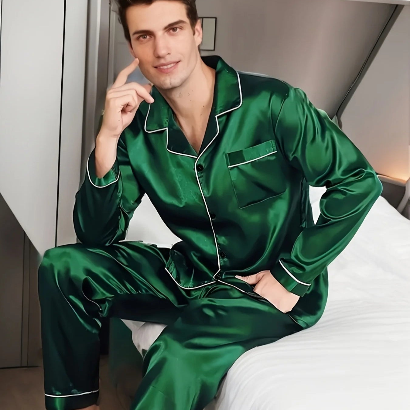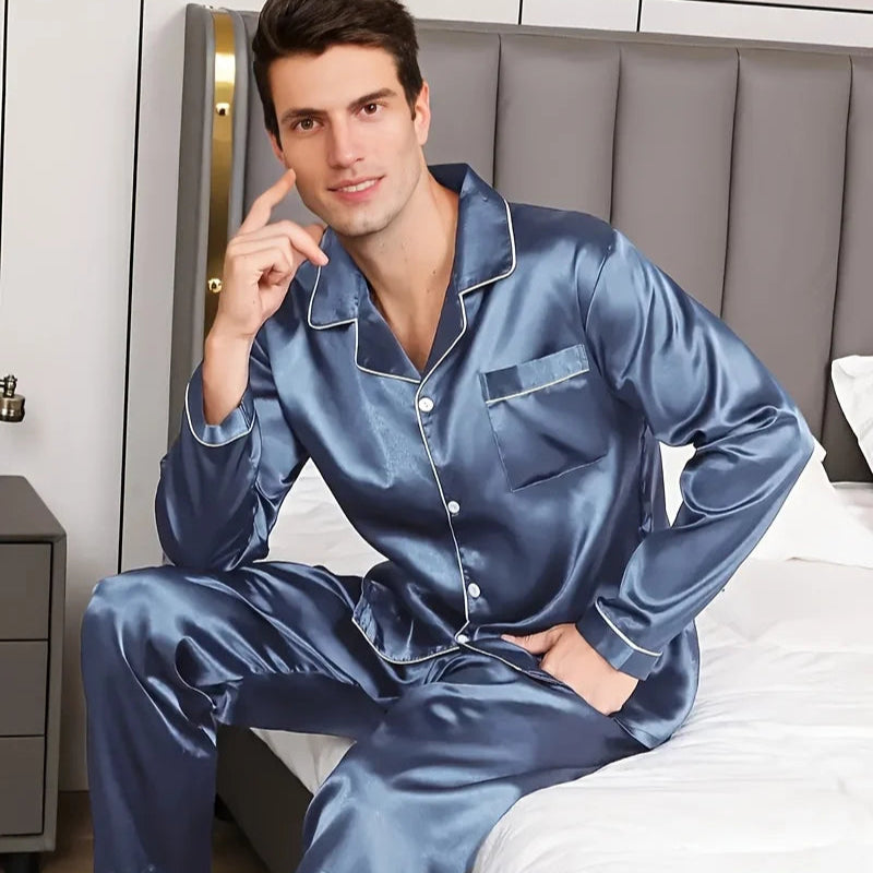 Men's Night Wear Silk Long Sleeve Shirt Plus Size Pajama Set Loungewear