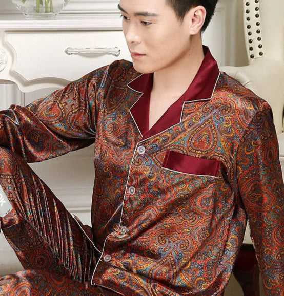 Spring Autumn Maroon Printed Thin Polyester Ice Silk Long-sleeved Pajama Set for Men