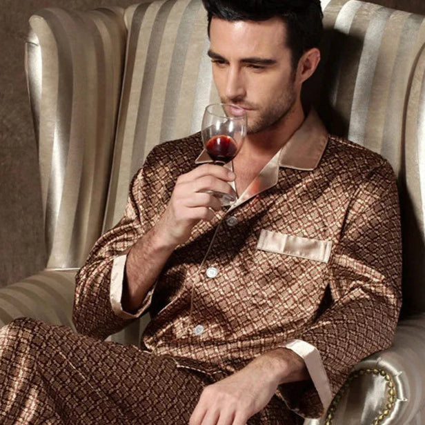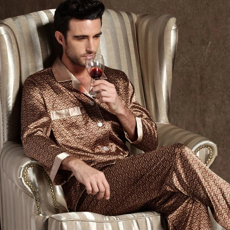 Spring Autumn Thin Polyester Ice Silk Brown Long-sleeved Sleepwear Pajama Set for Men