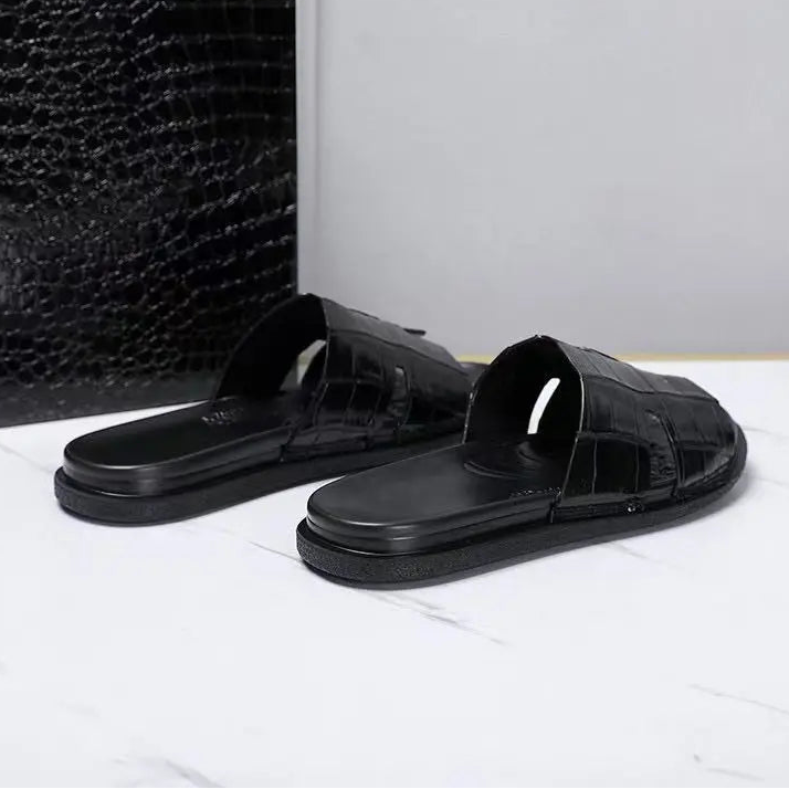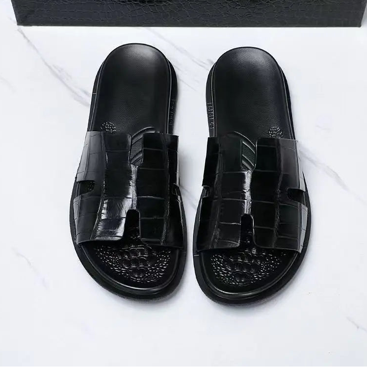 Whether you love frequent beach visits or casual strolls in the summer, consider adding these beautiful men's slippers to your collection. These footwear come with a genuine leather upper and a rubber outsole that gives an excellent look to it. The crocodile skin pattern in solid black color creates a fashion-forward statement. Order now!