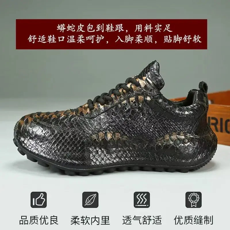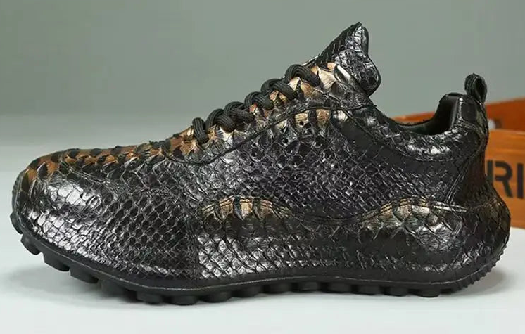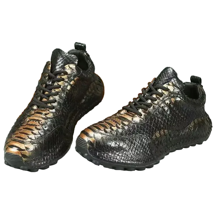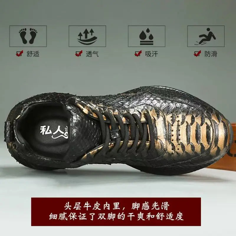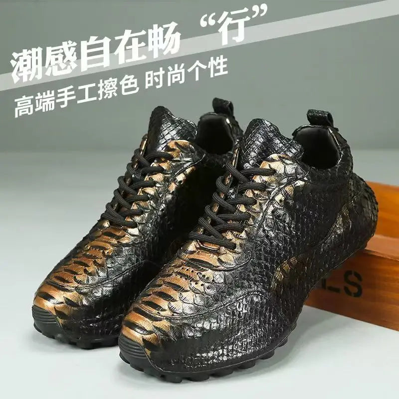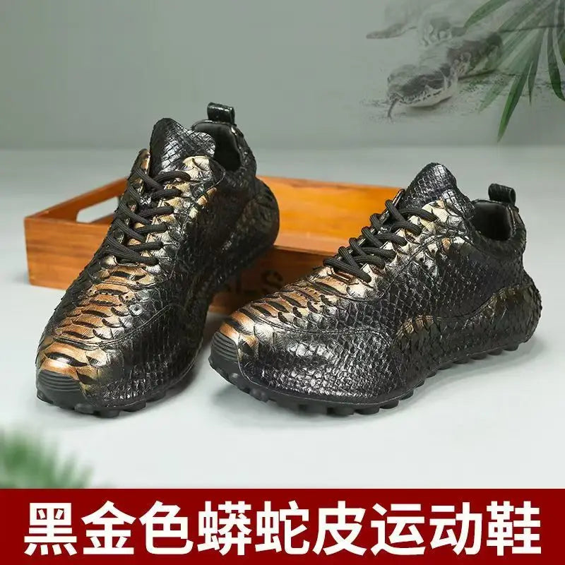 Casual Fashion Men's Black Gold Snake Skin Genuine Leather Sneakers