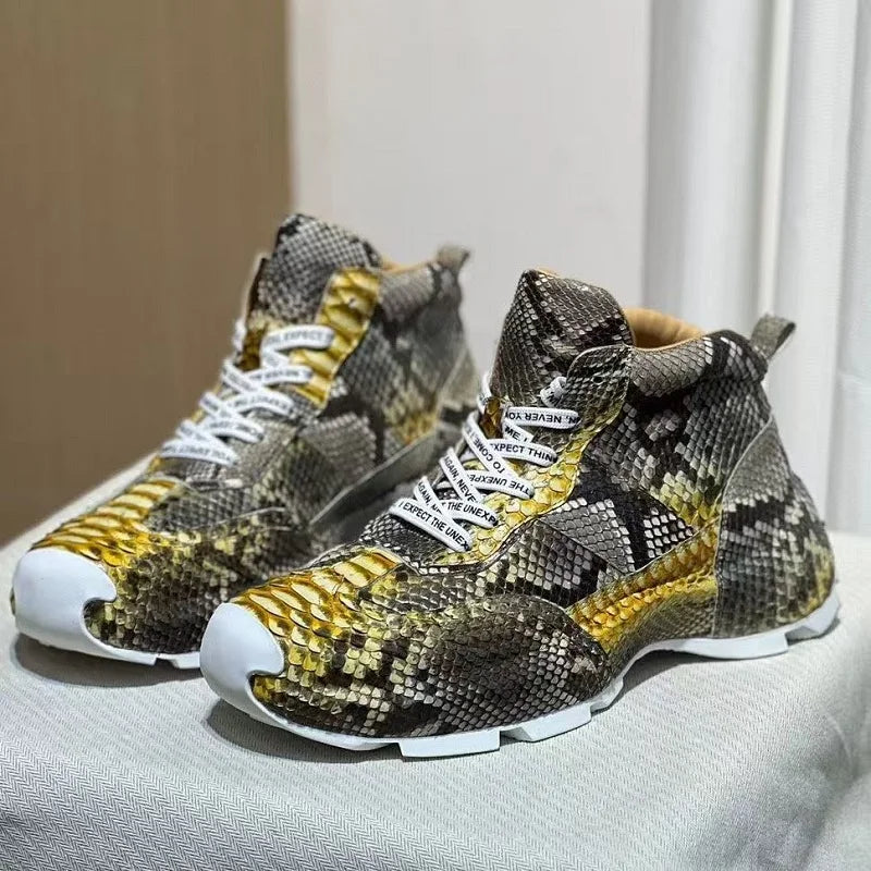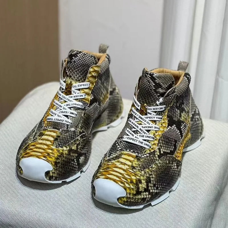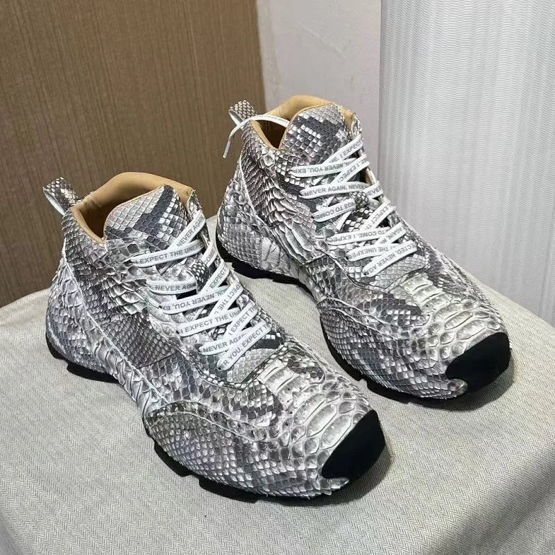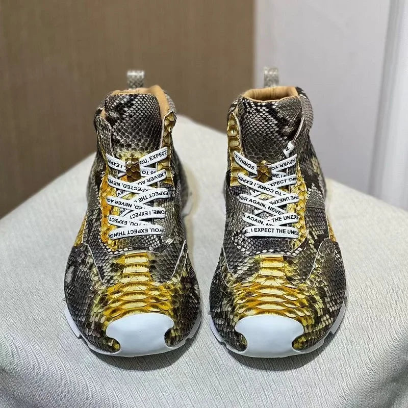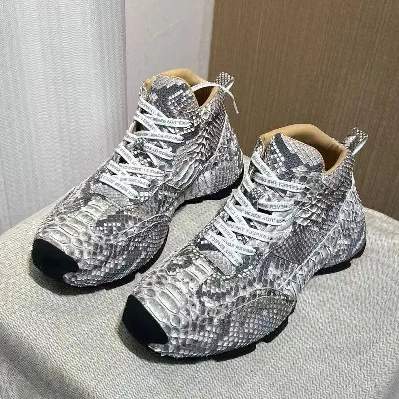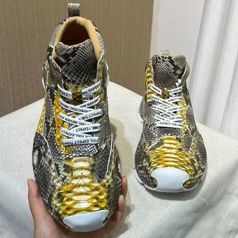 Men's Genuine Leather Python Skin Casual Sneakers with Letter Print Lace Up