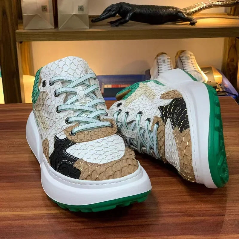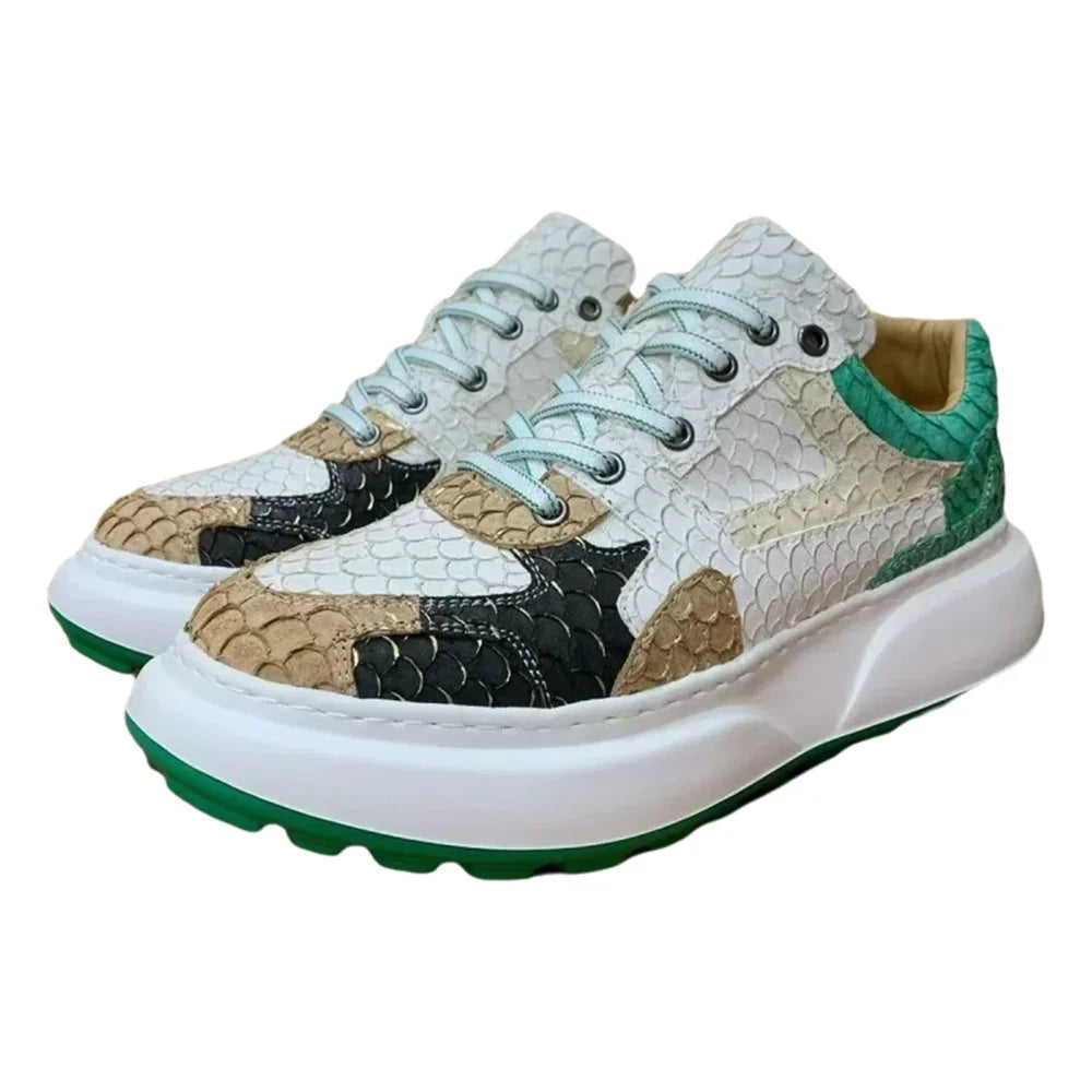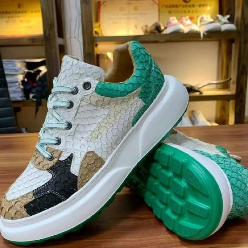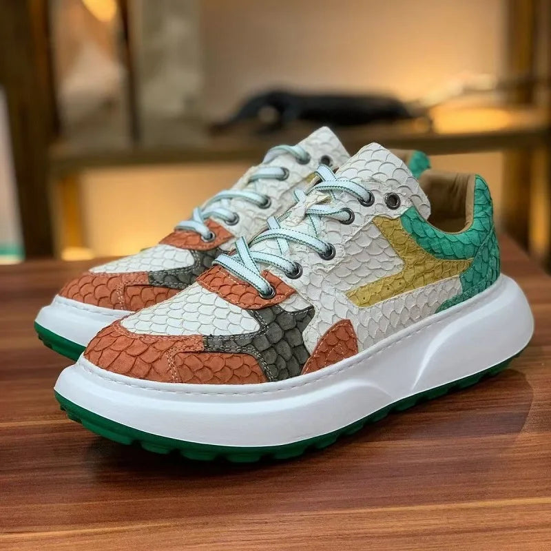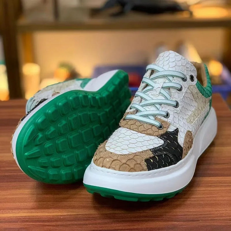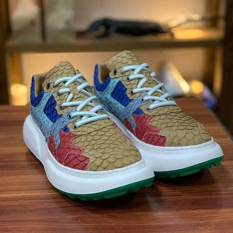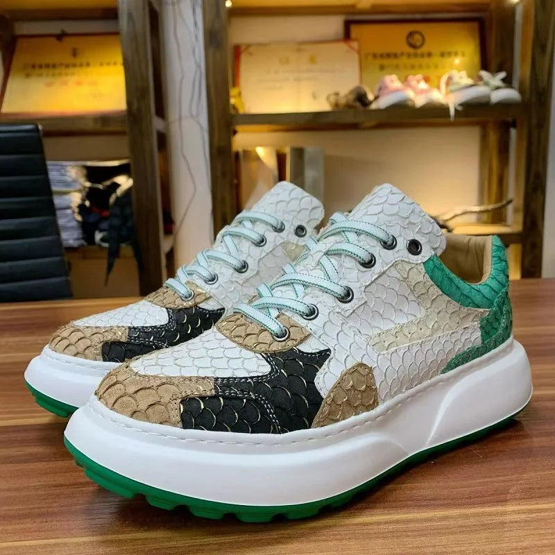 Multicolor Luofei Fish Skin Patchwork Pattern Genuine Leather Men's Sneakers
