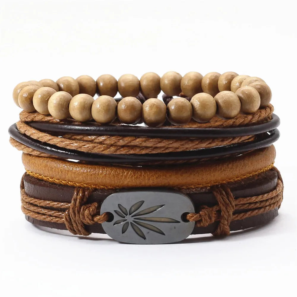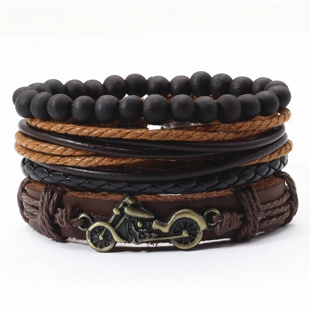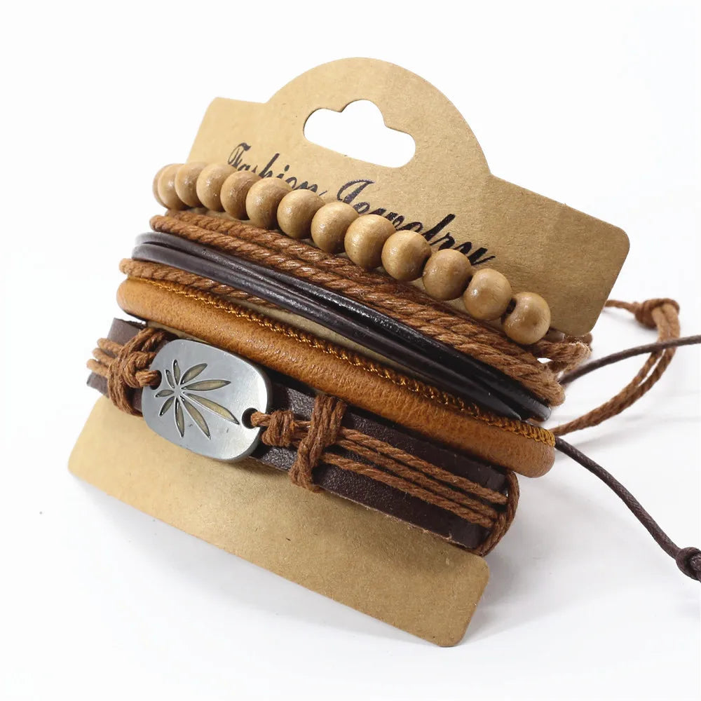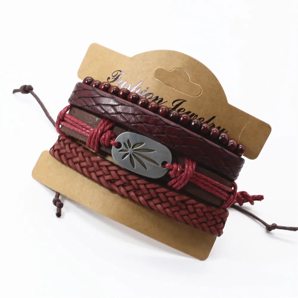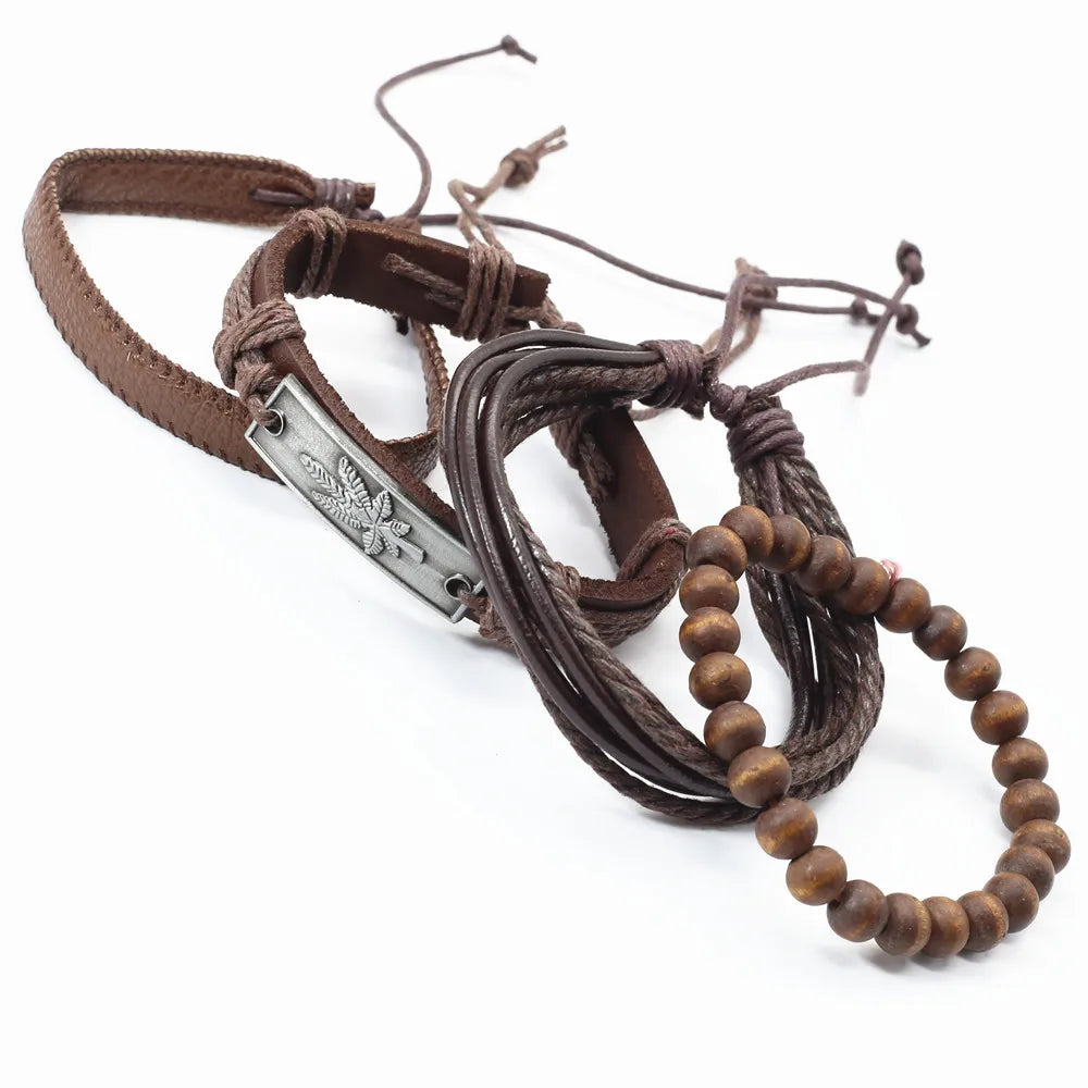 Unisex 3-4 Pcs-per-set Vintage Bronze Charm Beaded Leather Bracelet