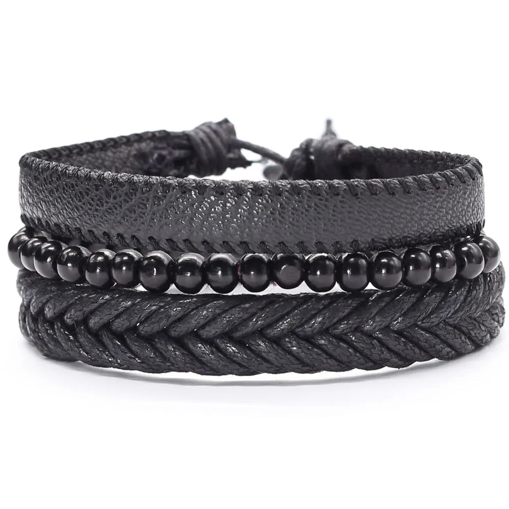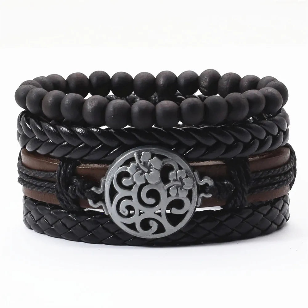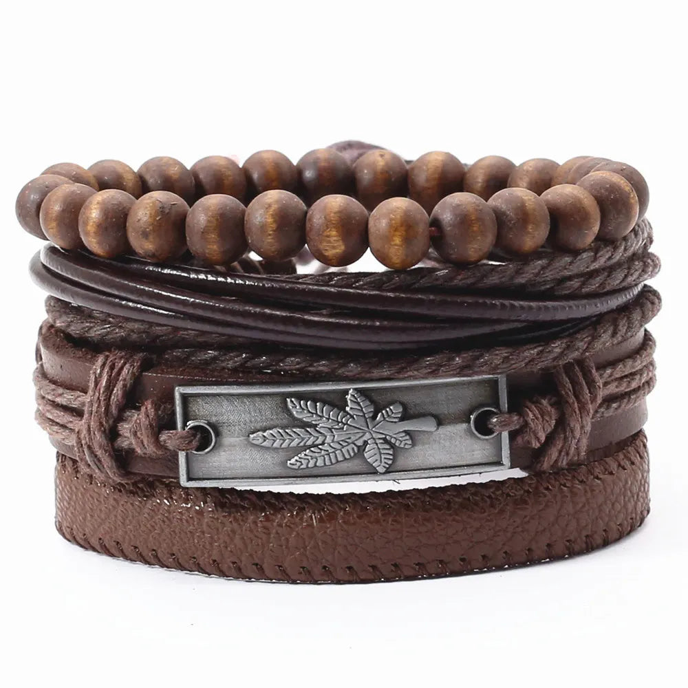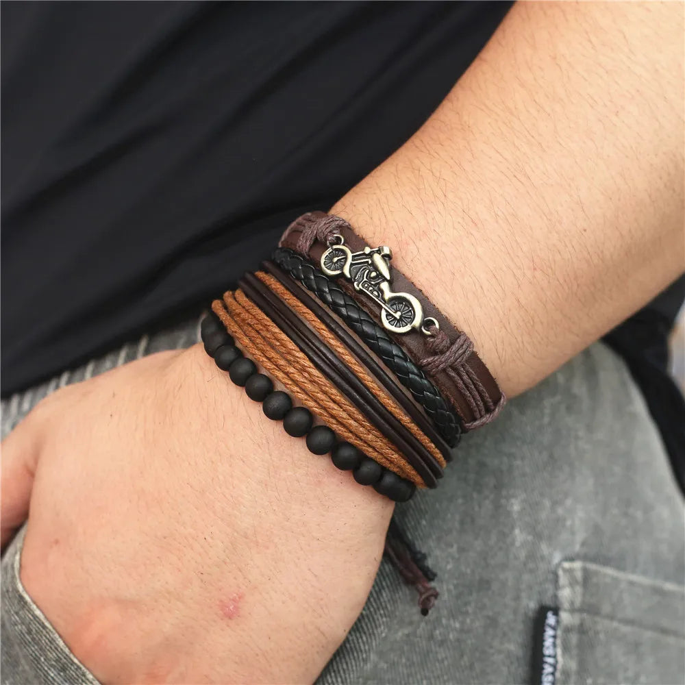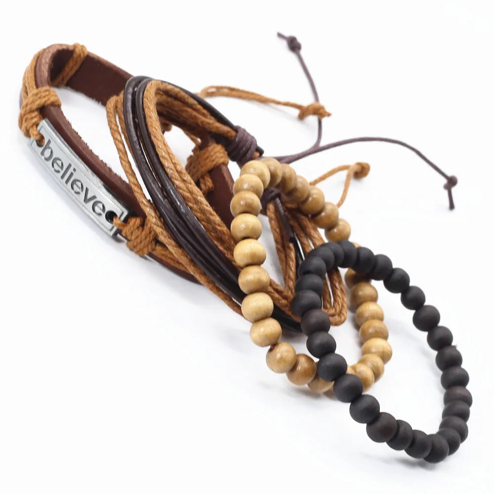 Unisex 3-4 Pcs-per-set Vintage Bronze Charm Beaded Leather Bracelet