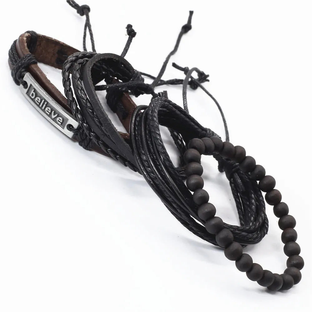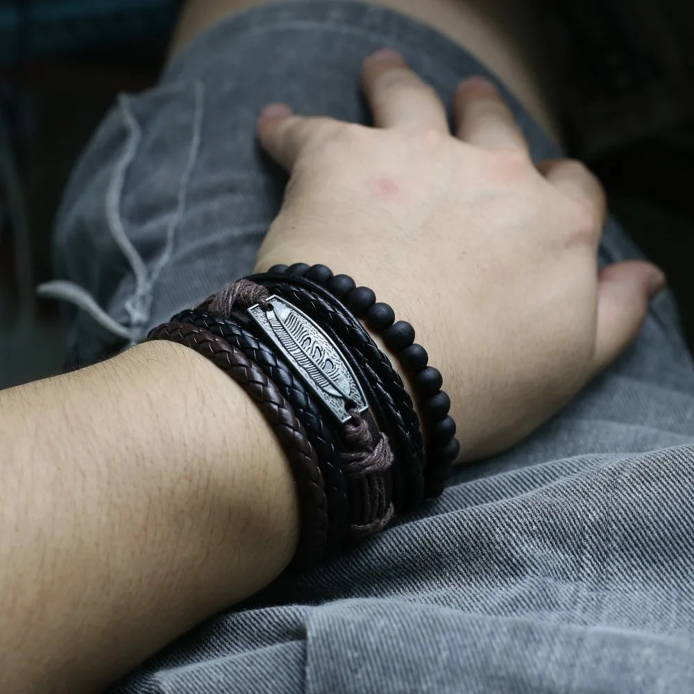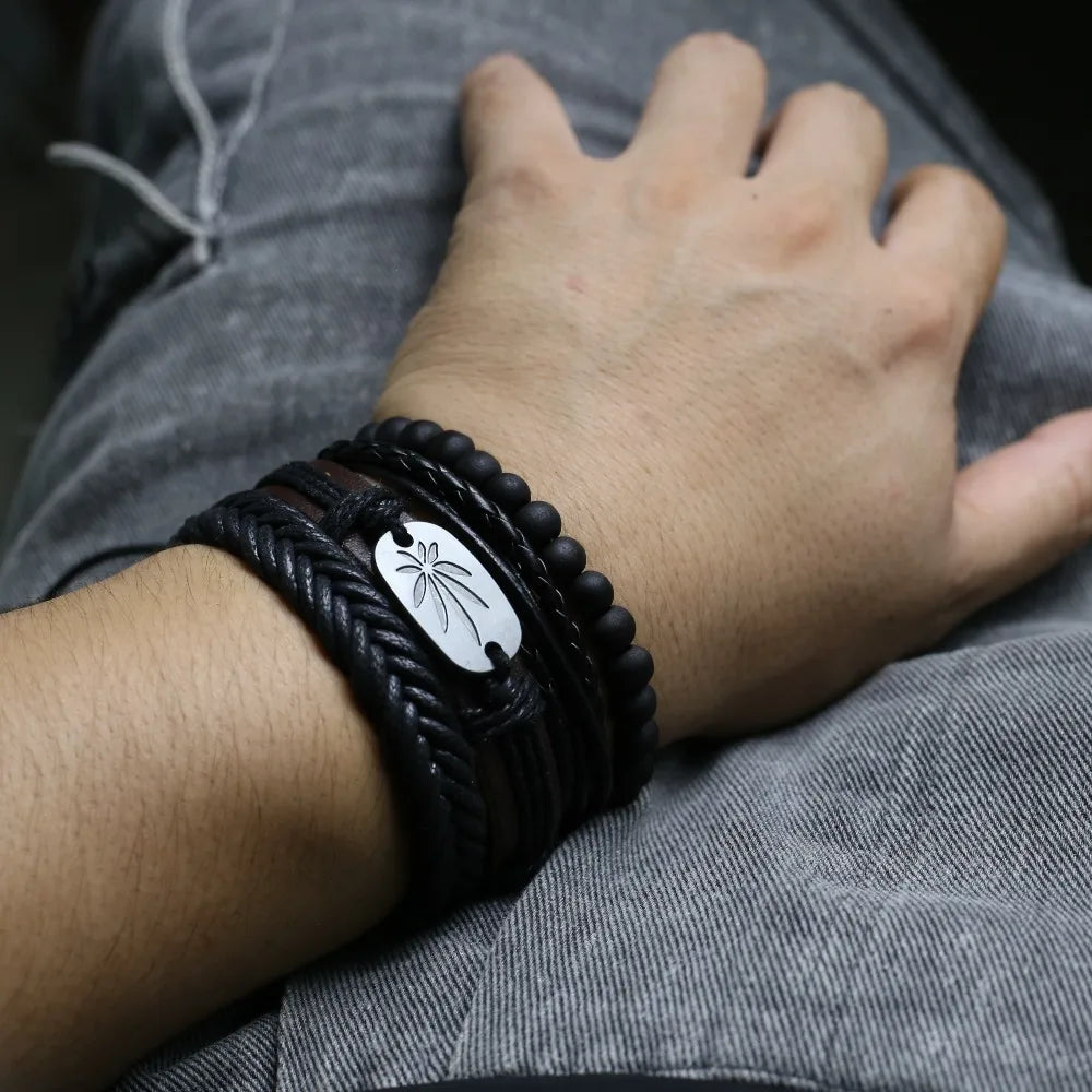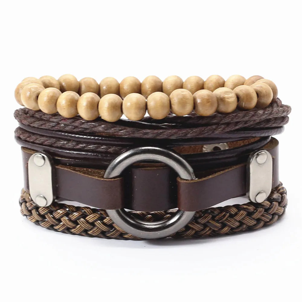 Unisex 3-4 Pcs-per-set Vintage Bronze Charm Beaded Leather Bracelet