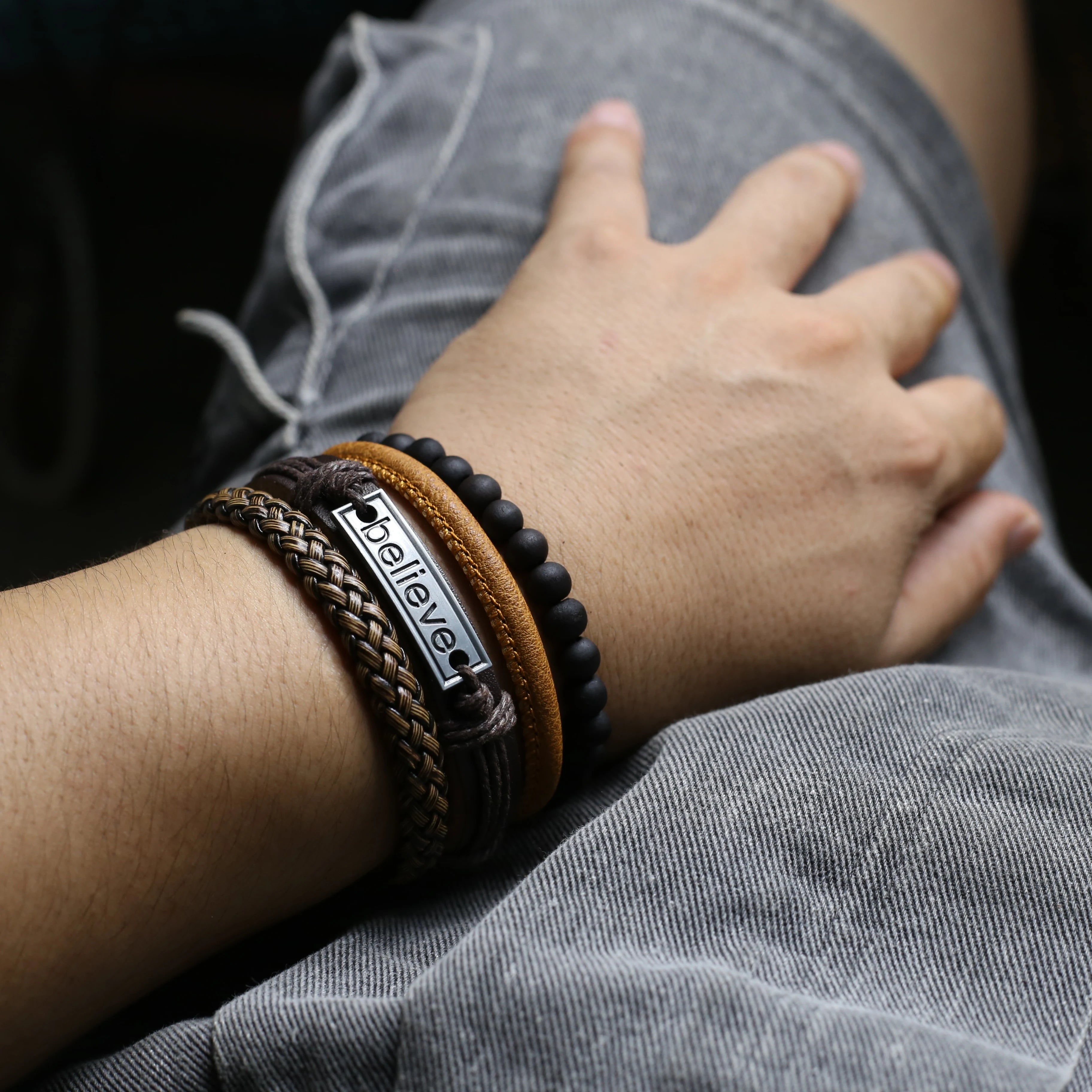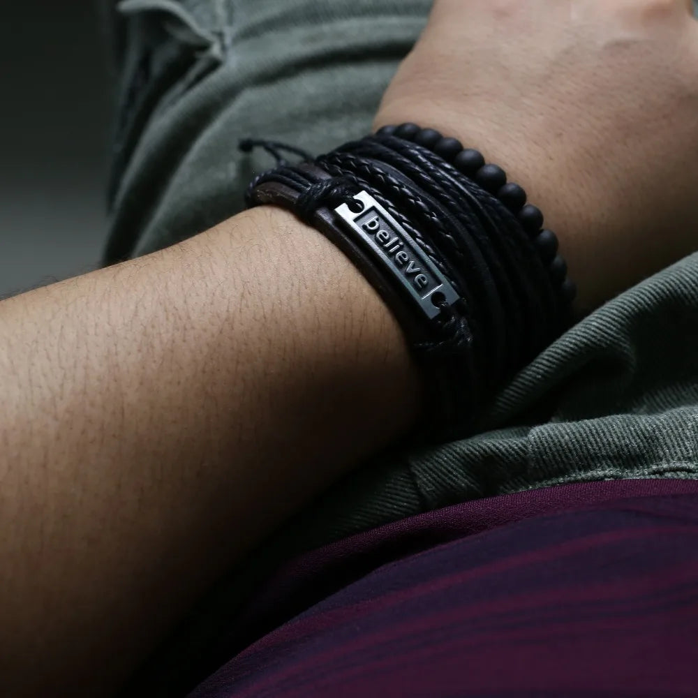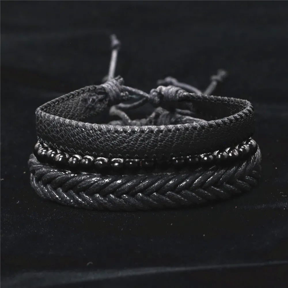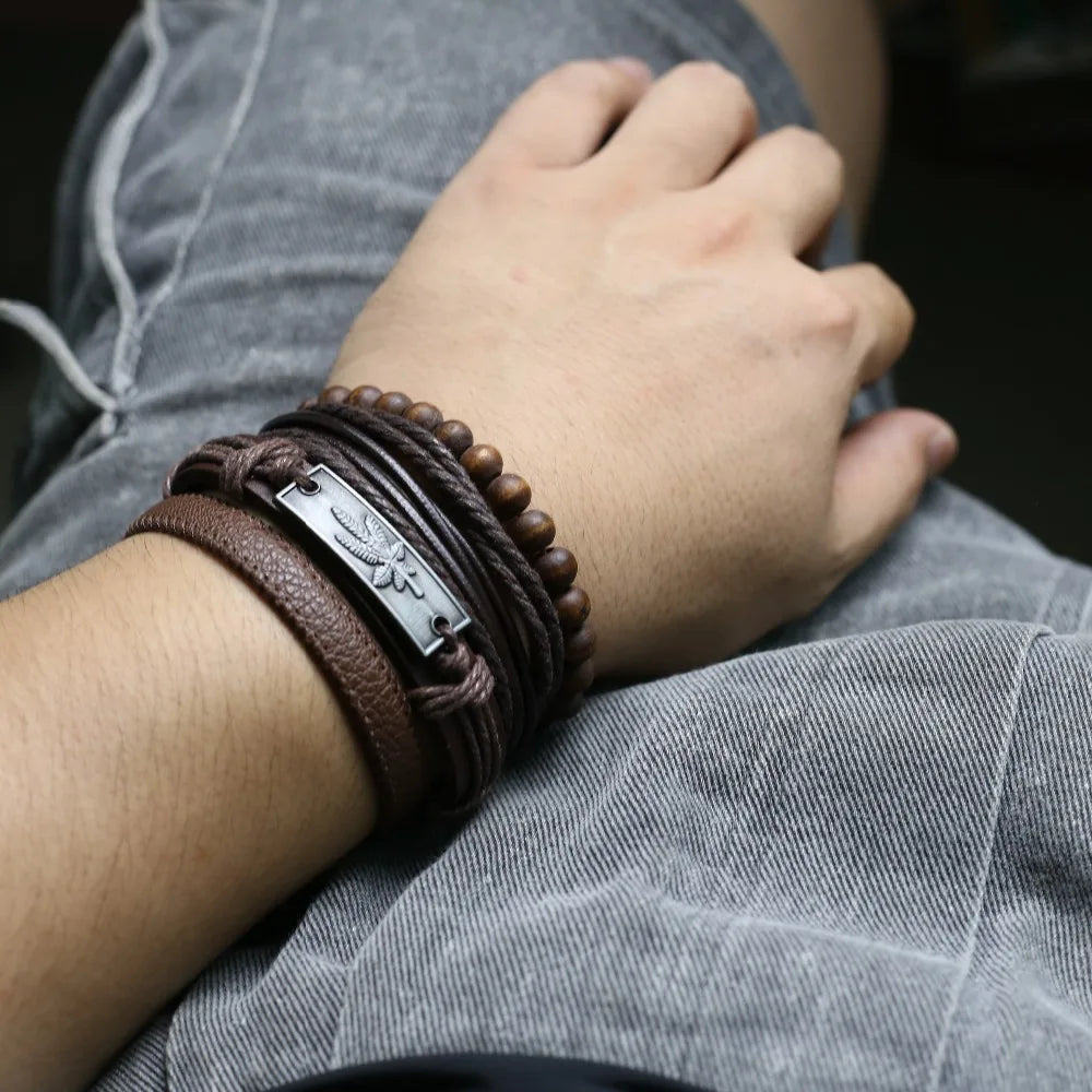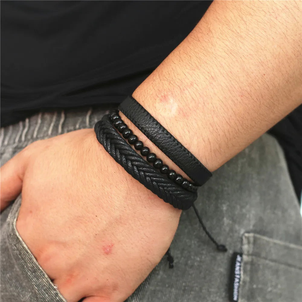 Unisex 3-4 Pcs-per-set Vintage Bronze Charm Beaded Leather Bracelet