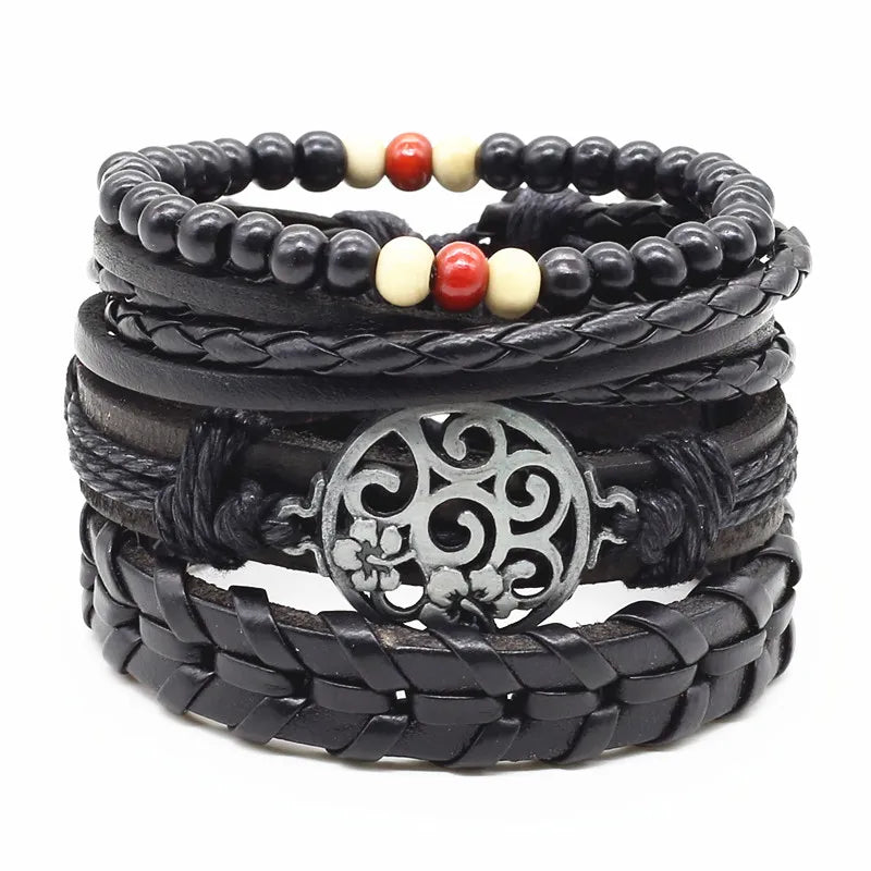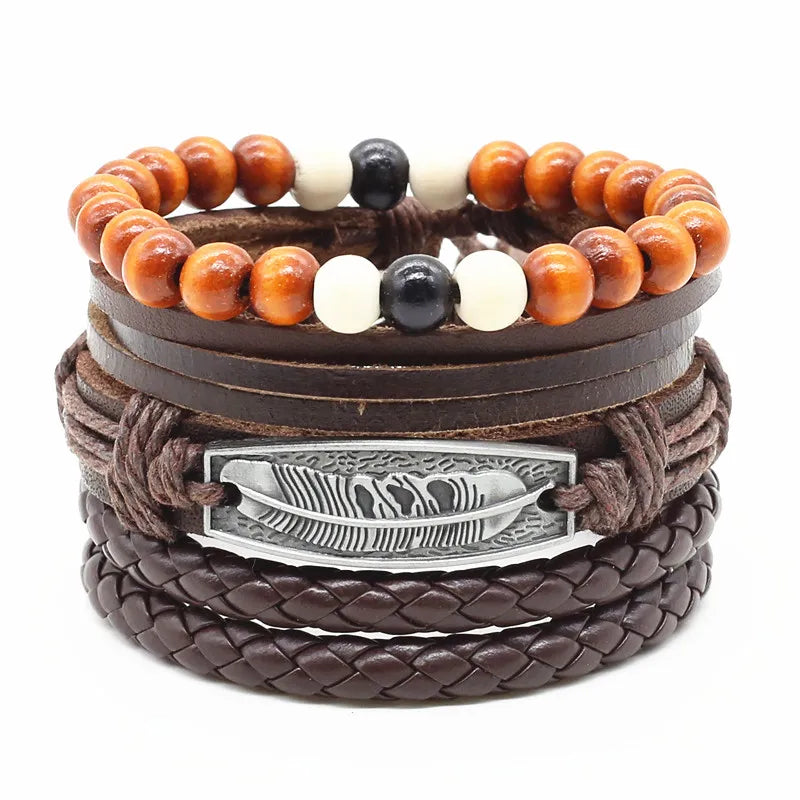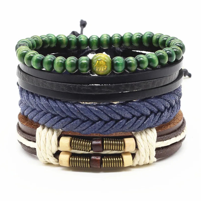 Unisex 4pcs-per-set Handmade Trendy Vintage Wood Bead Charm Leather Bracelet