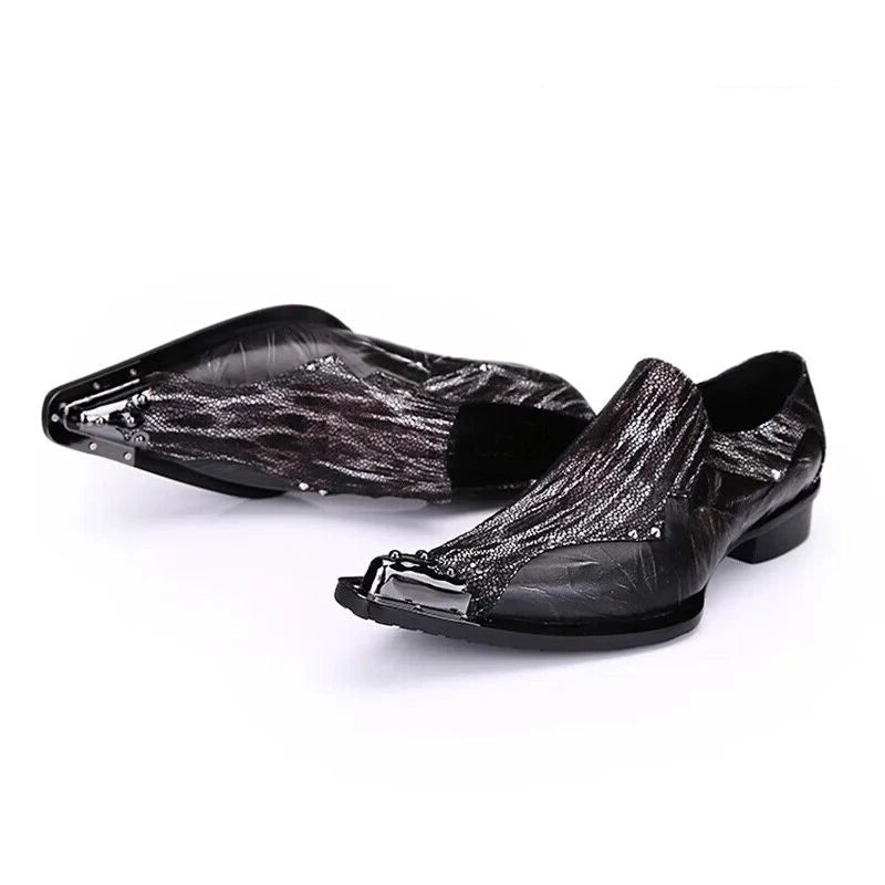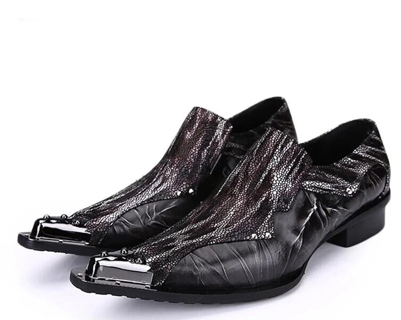 Men's Black Patchwork Metal Square Toe Slip On Genuine Leather Loafers