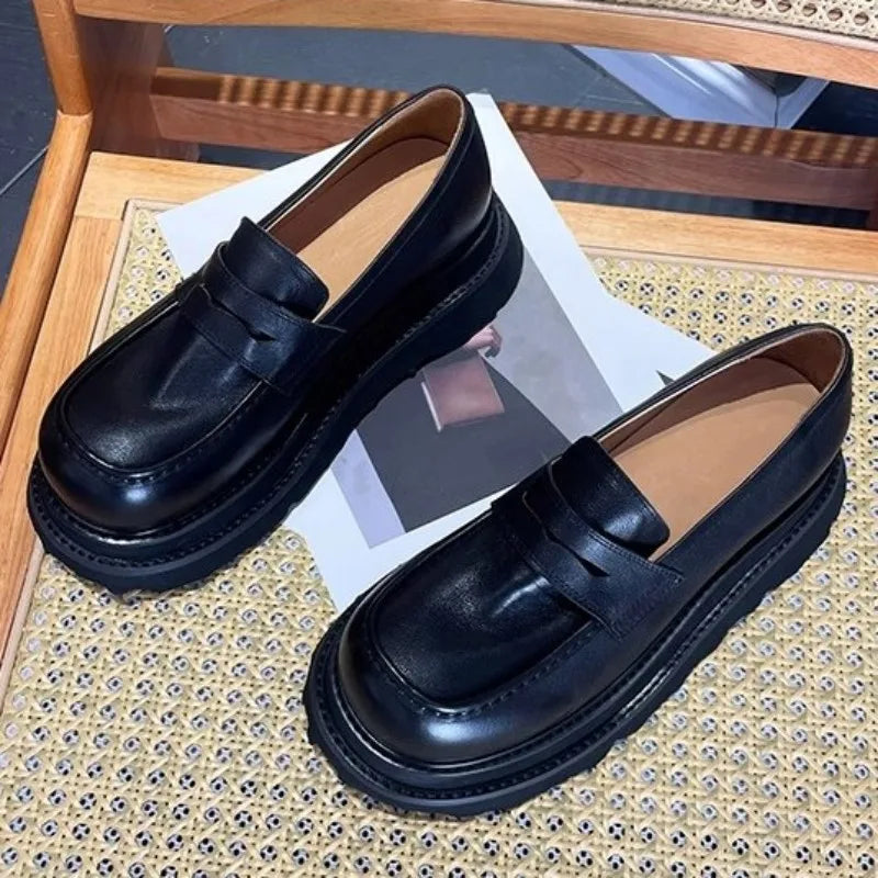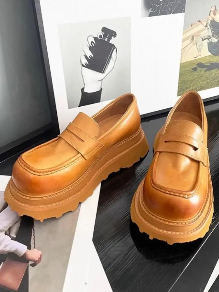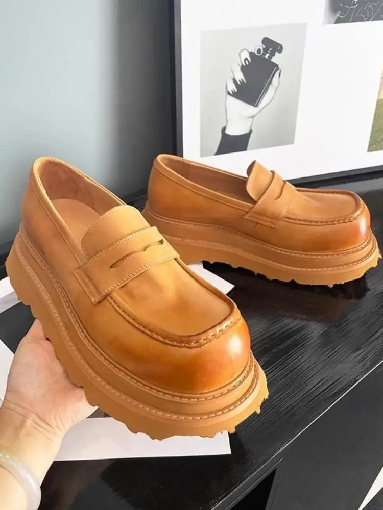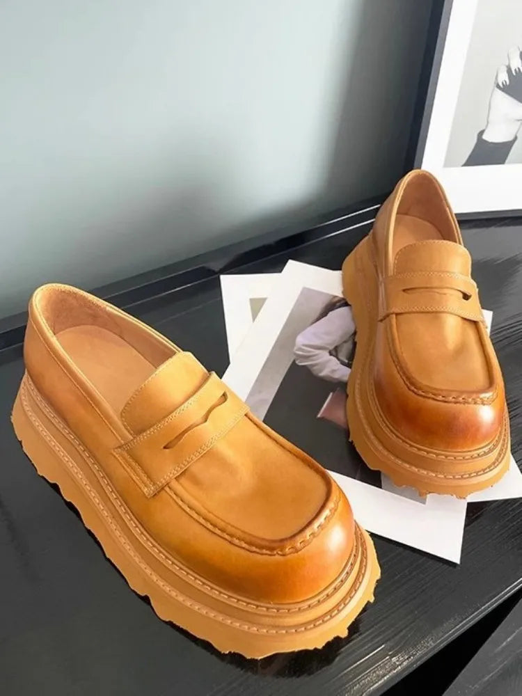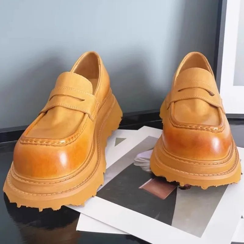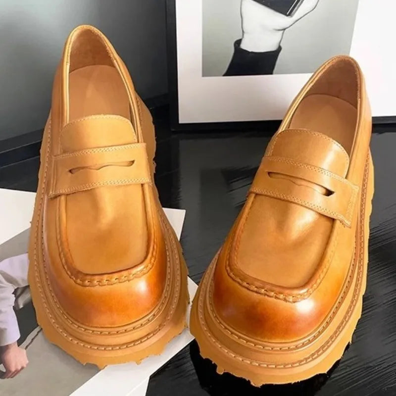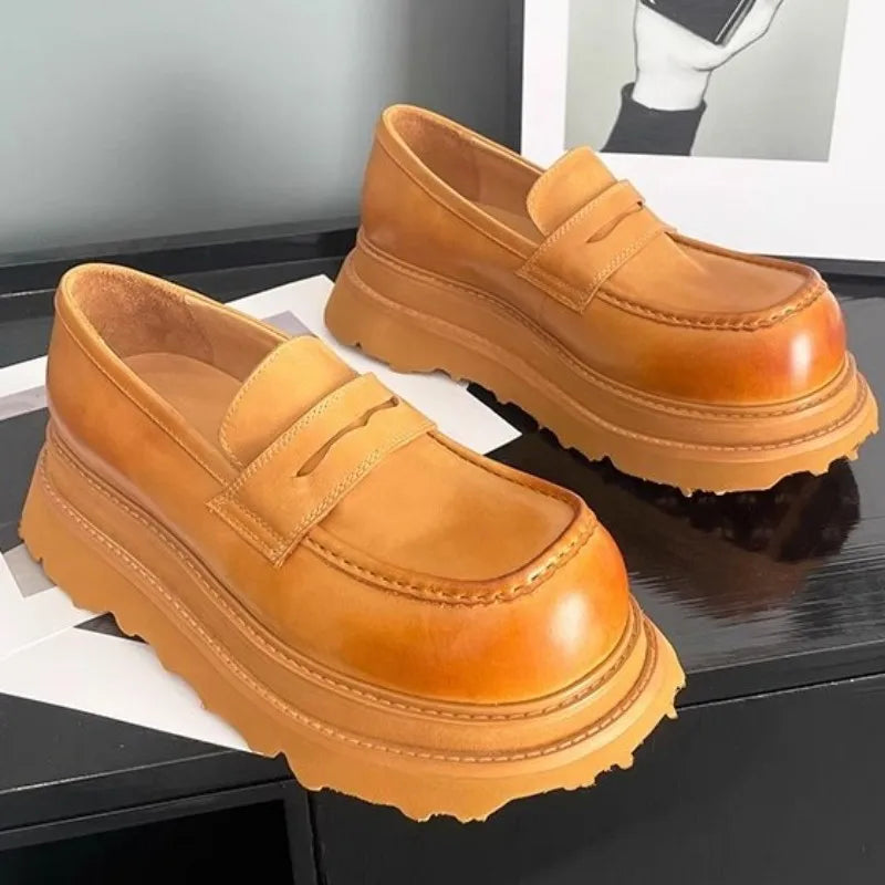 Men's Cowhide Solid Color Round Toe Height Increasing Designer Style Slip On Loafers