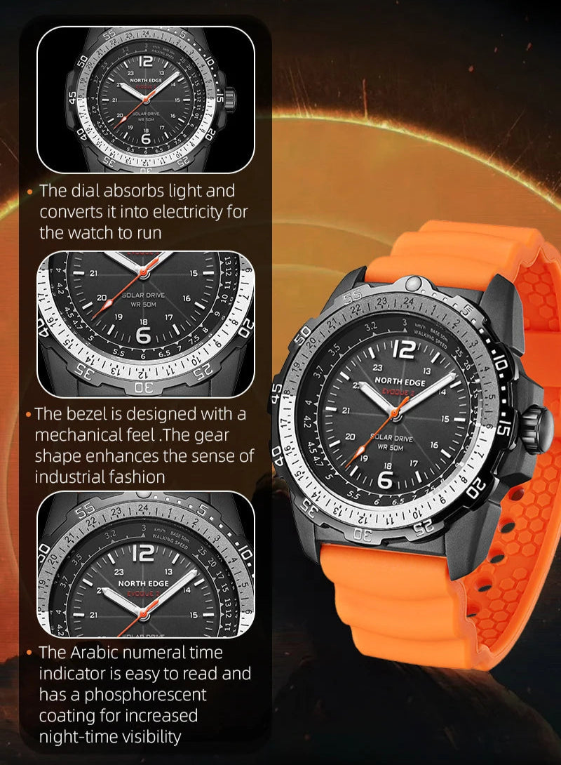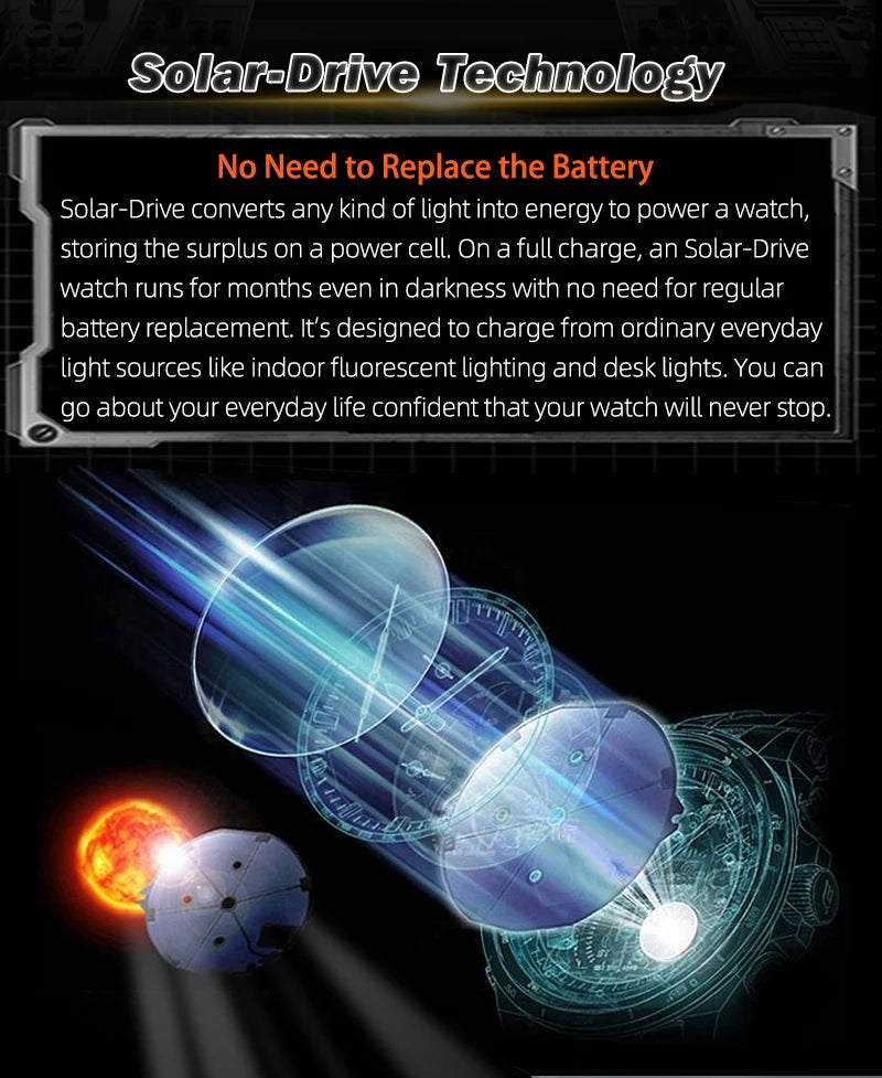 Designed with a silicone strap and alloy casing, offering both durability and style, this men's sports watch is solar powered. The luminous display makes it easy to read the time in the dark. This watch is water-resistant, making it suitable for daily activities and outdoor sports. Offers both practicality and elegance!