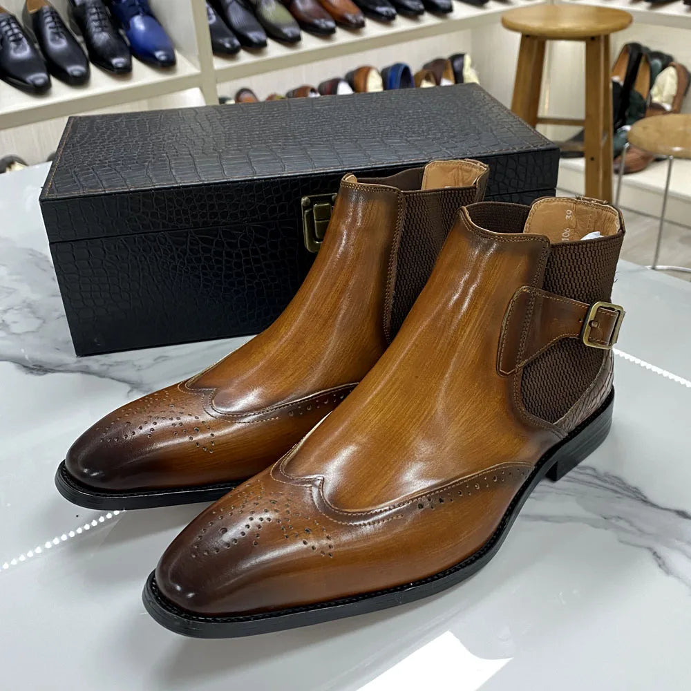Men's Genuine Leather Ankle High Slip-On Wingtip Chelsea Boots