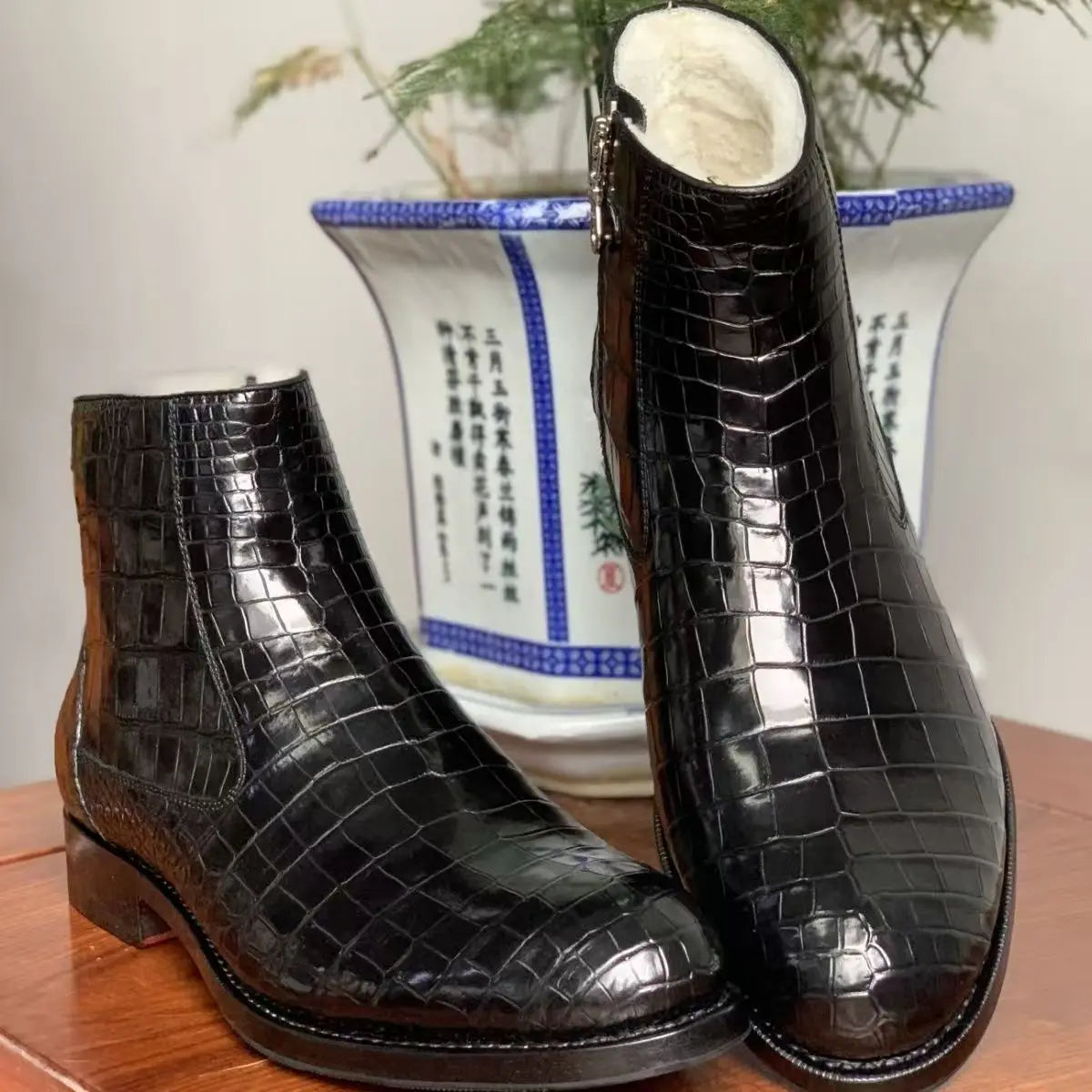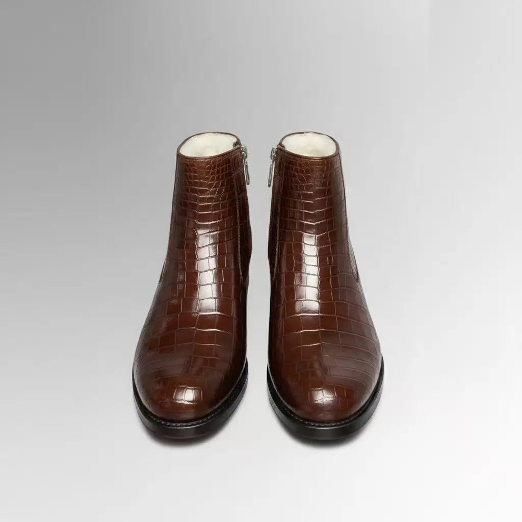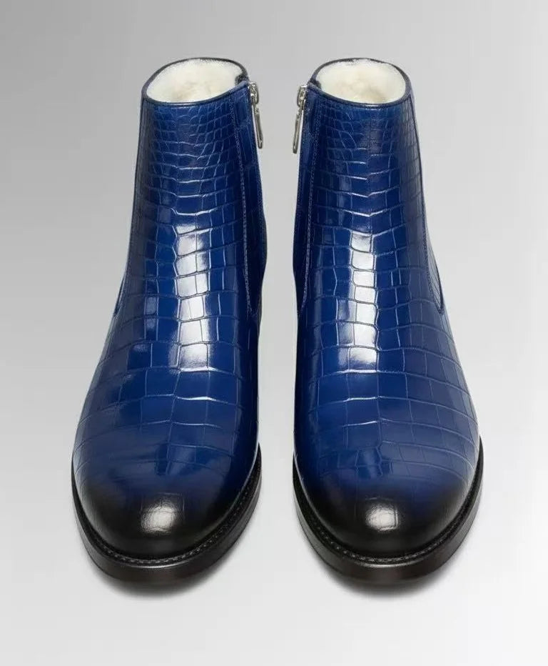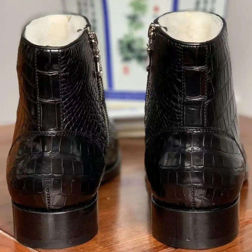 Men's Winter Glossy Solid Color Crocodile Skin Wool Liner Side Zipper Boots
