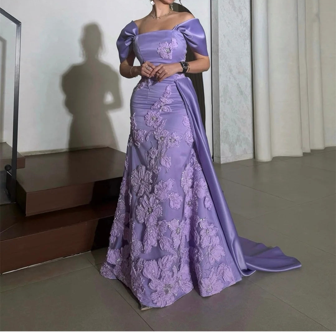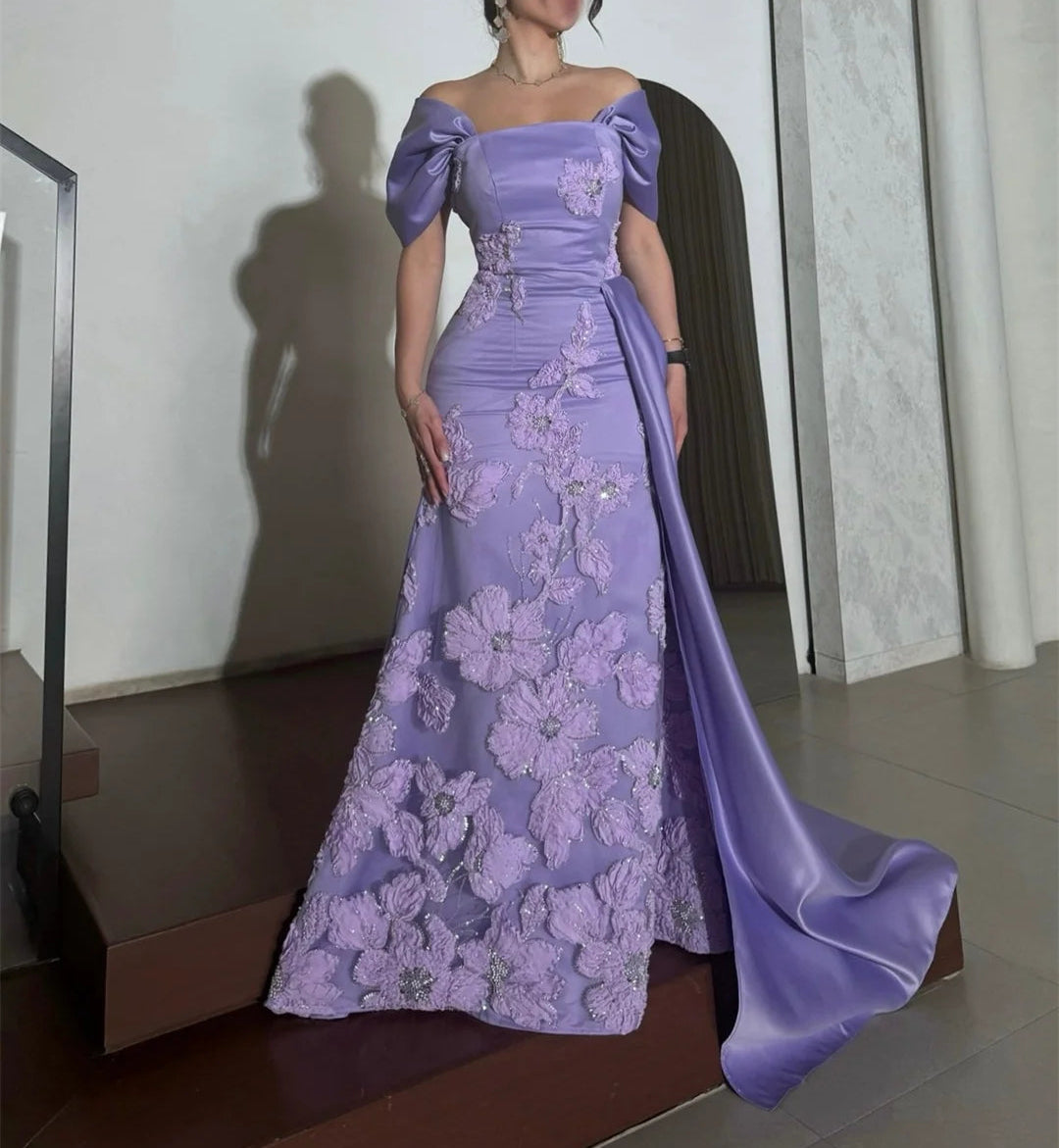 Women's Flower Embroidered Lace Fish Tail Shawl Ball Gown Evening Prom Dress