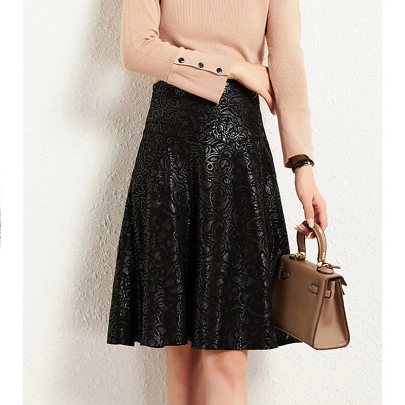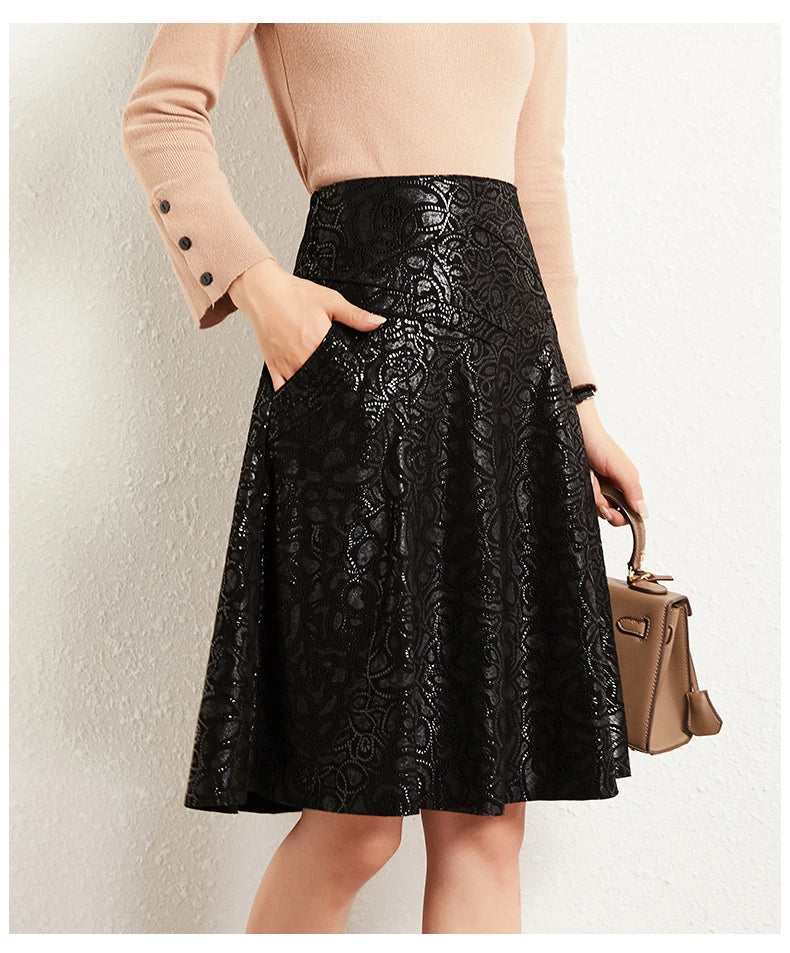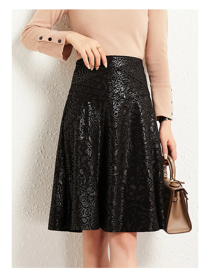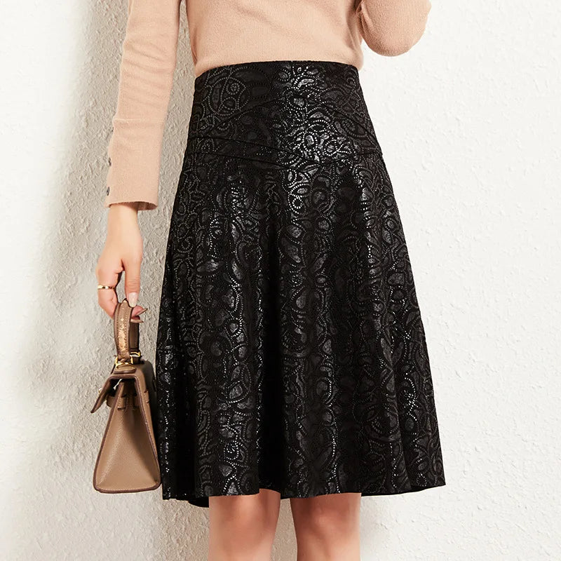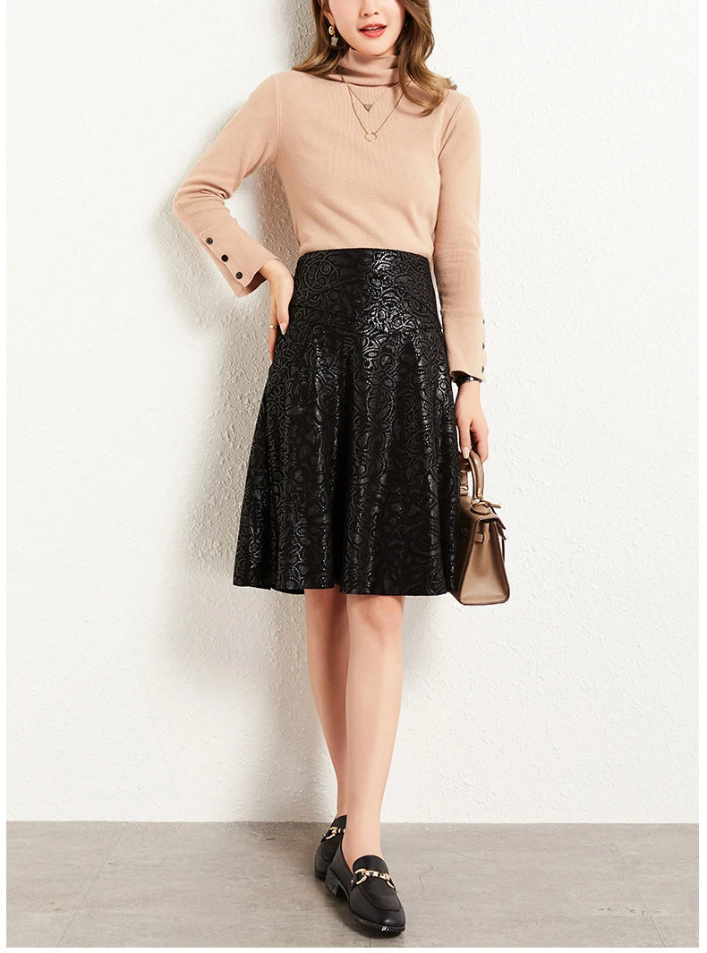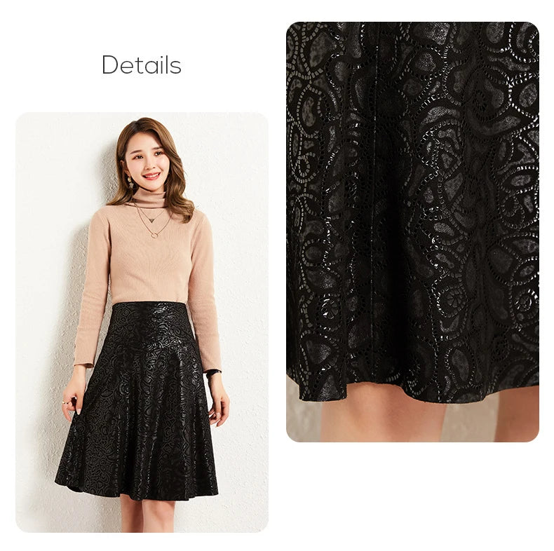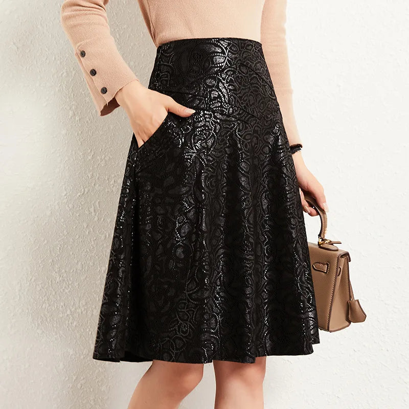 Harajuku Genuine Leather Mid-Length High Waist A-line Swing Skirt for Women