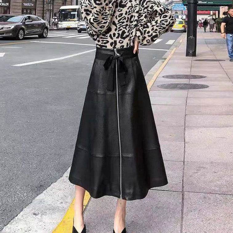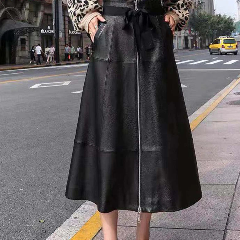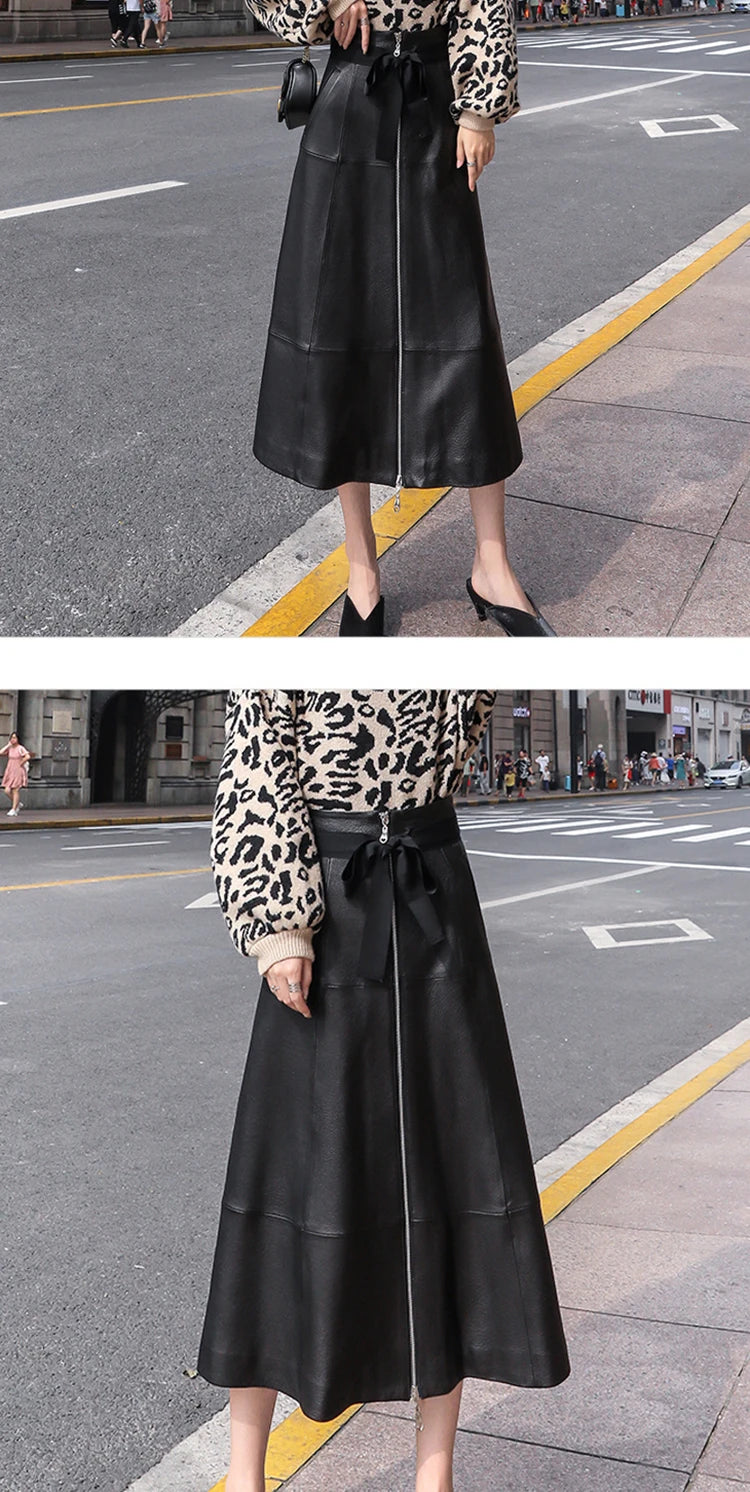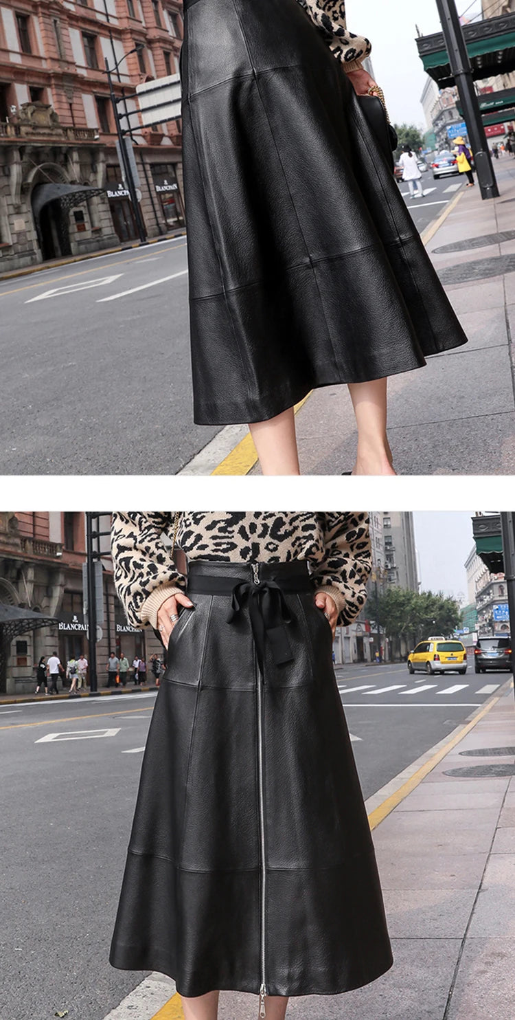 High Waist Bow Tie Large Swing Genuine Sheepskin Leather Skirt for Women
