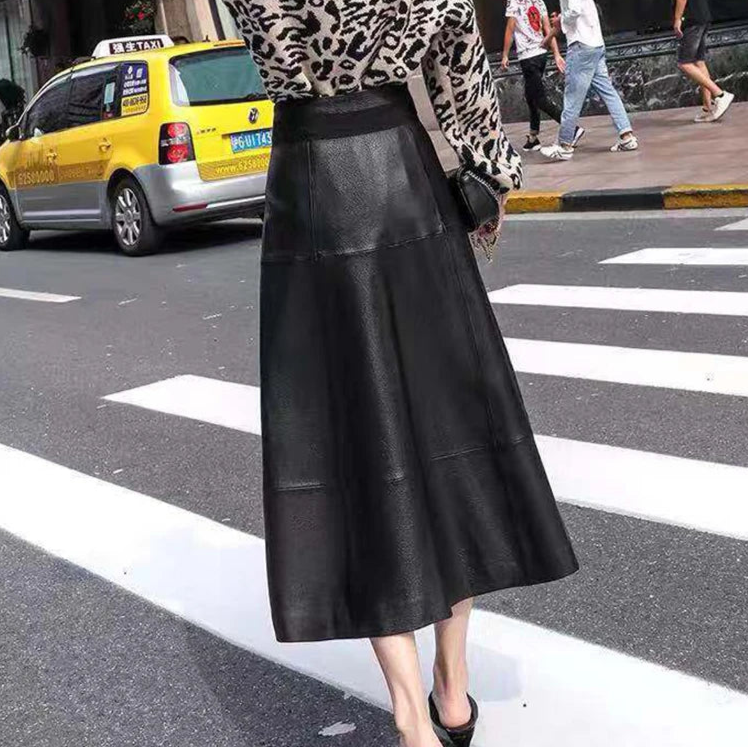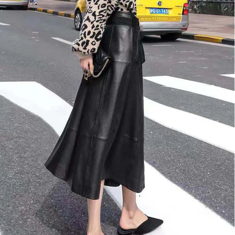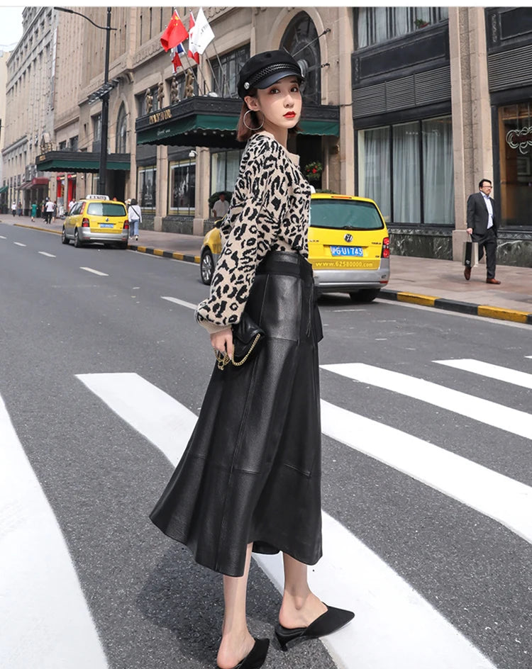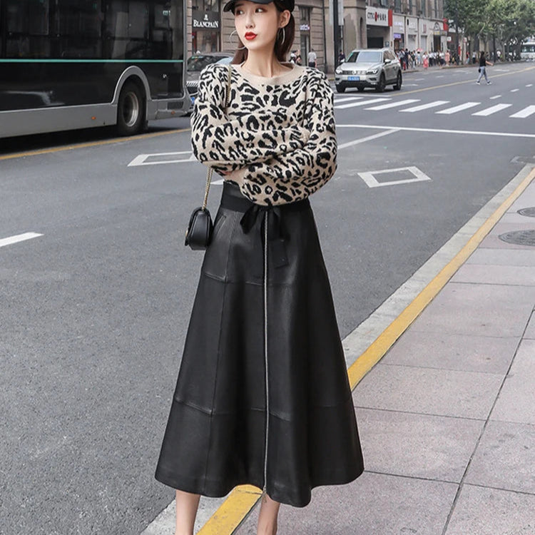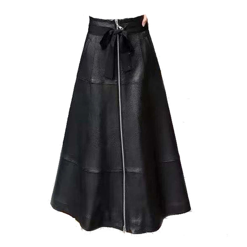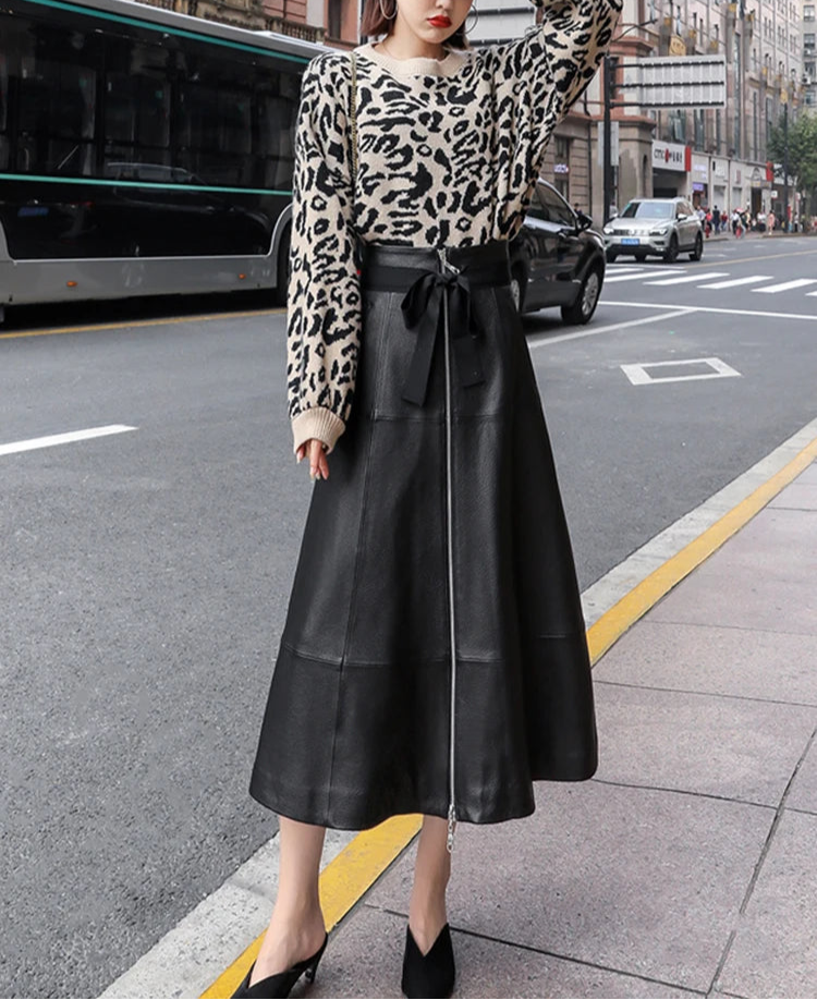 High Waist Bow Tie Large Swing Genuine Sheepskin Leather Skirt for Women