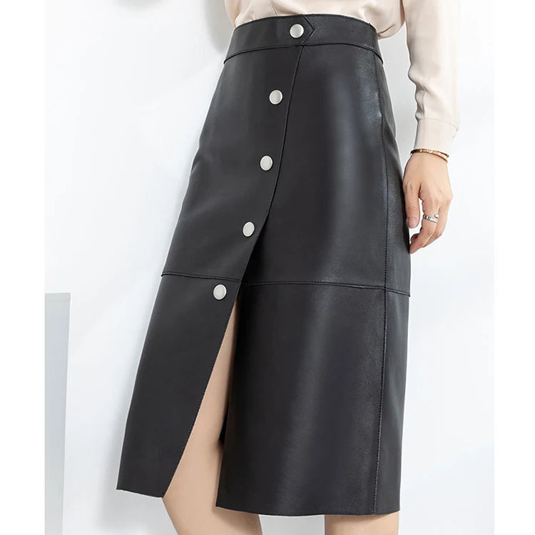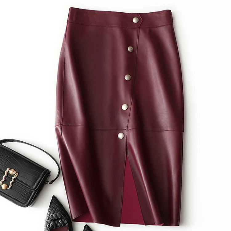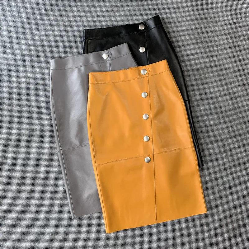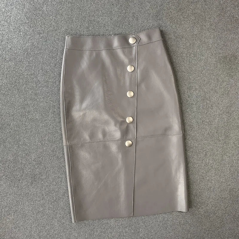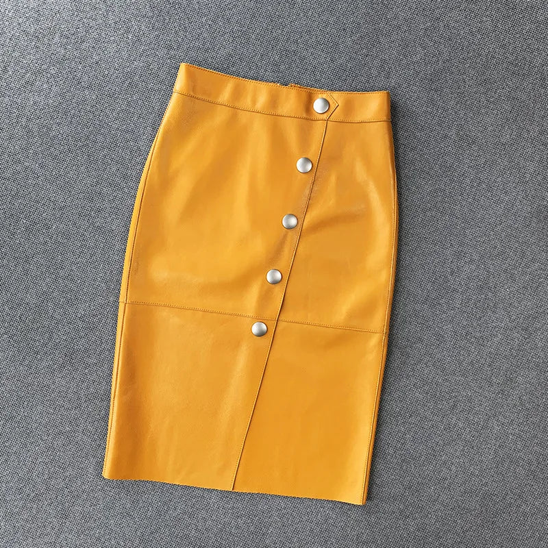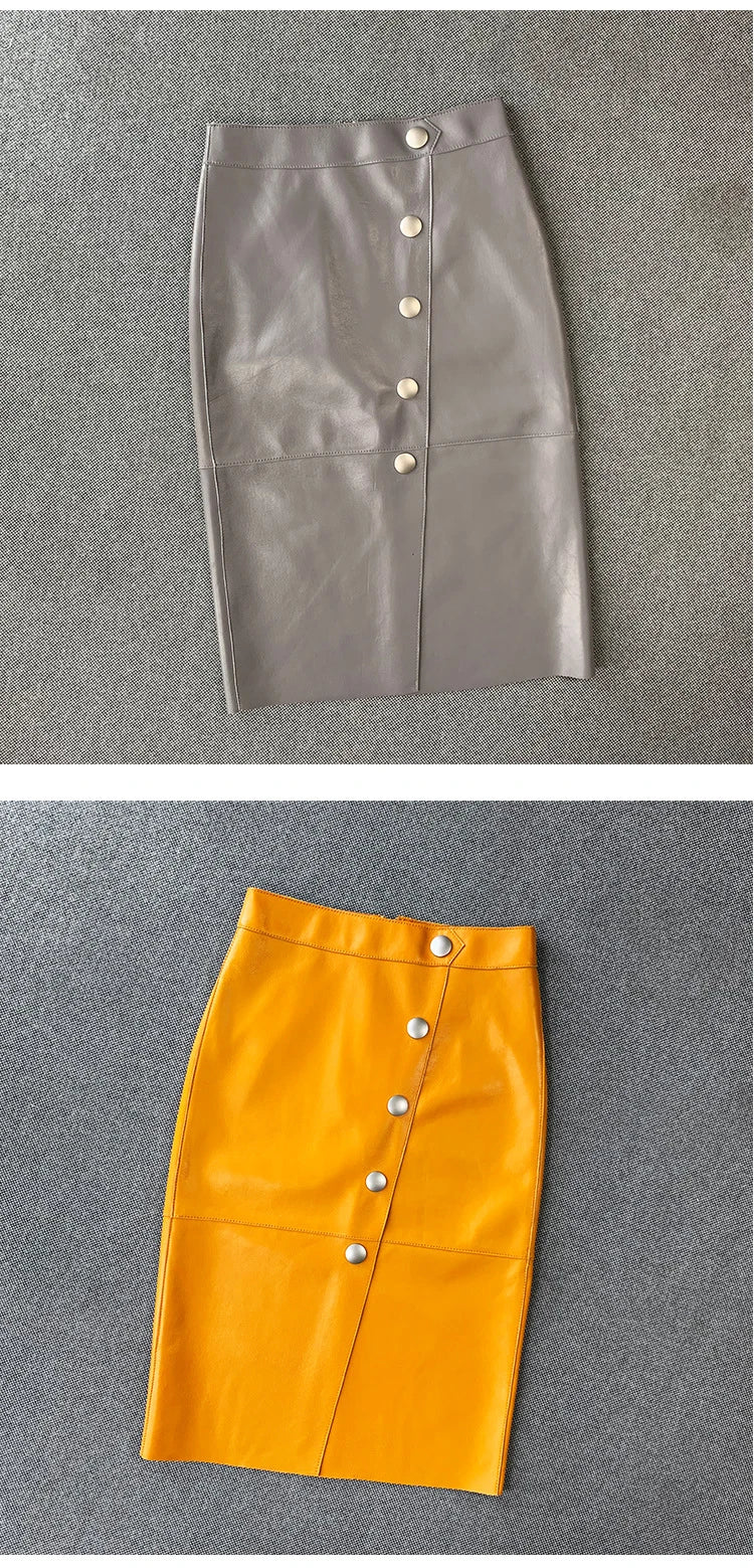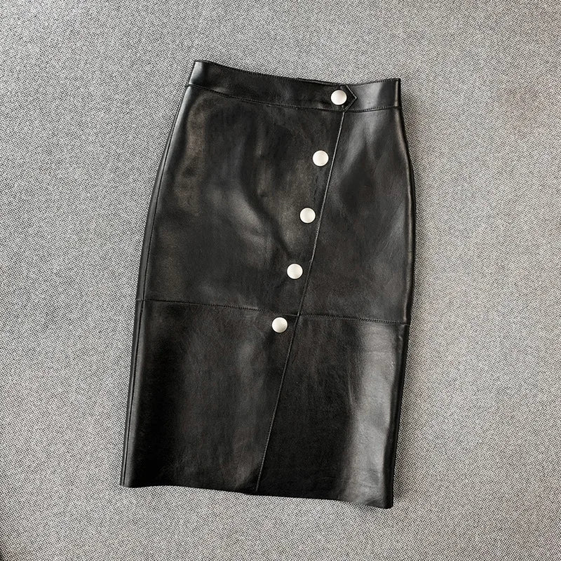 Women's Sheepskin Leather Four Metal Buttons Wrap Hip High Waist Skirt