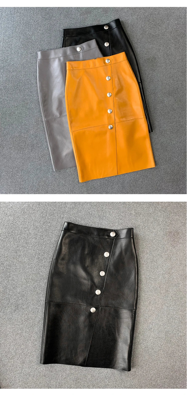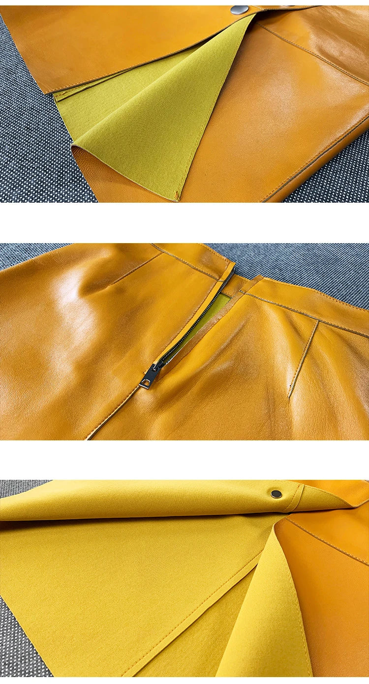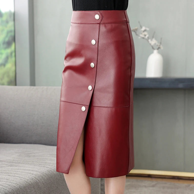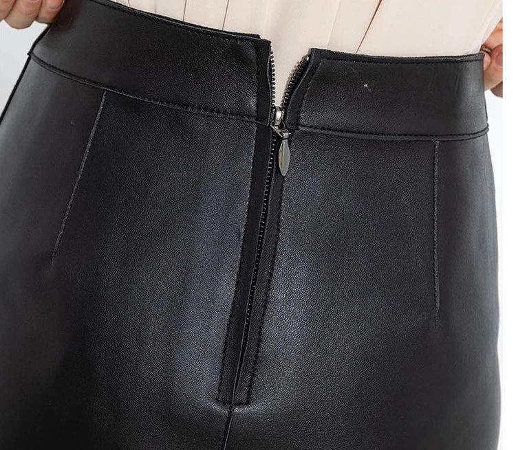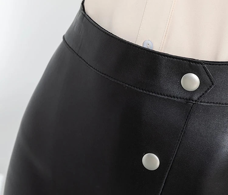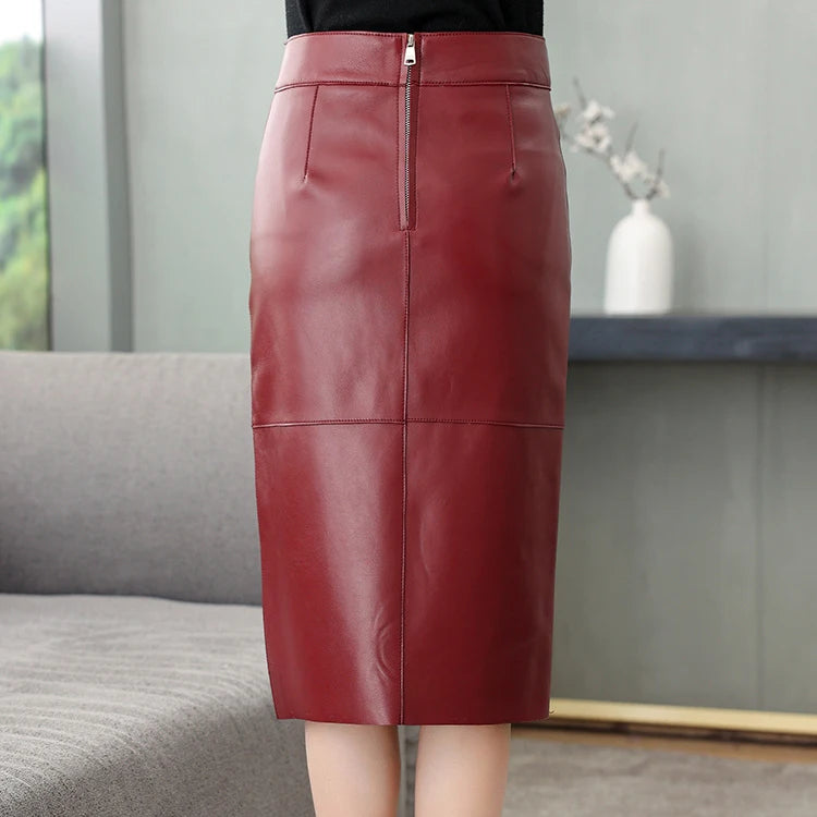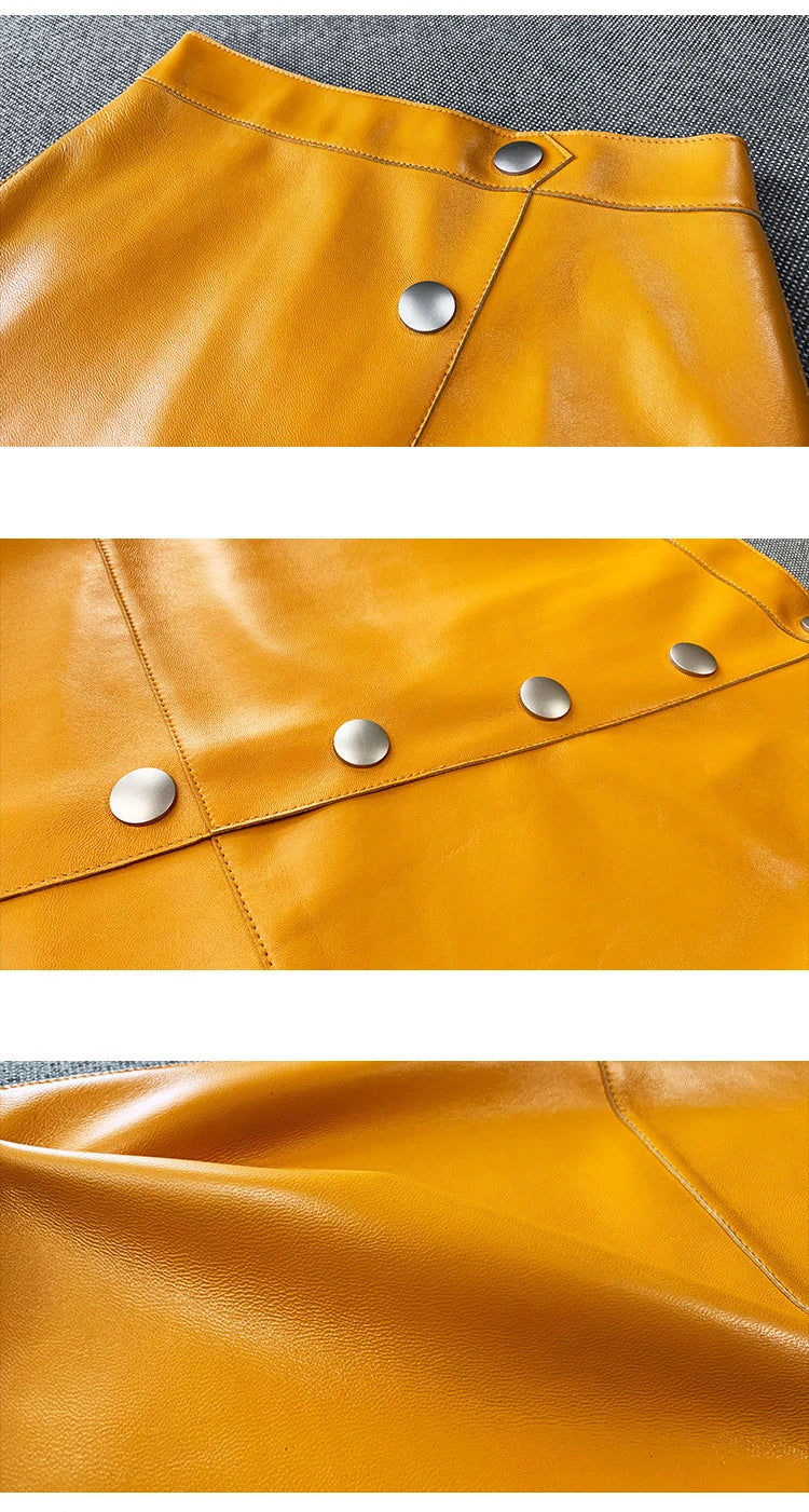 Women's Sheepskin Leather Four Metal Buttons Wrap Hip High Waist Skirt