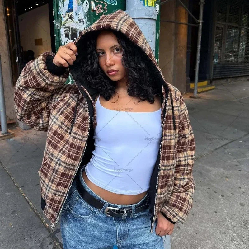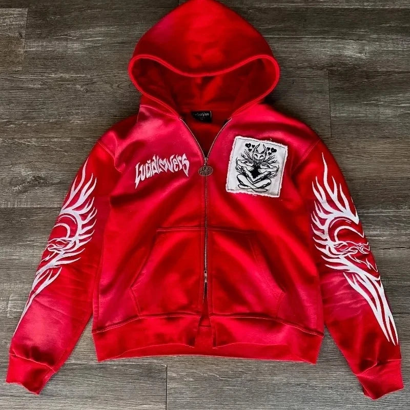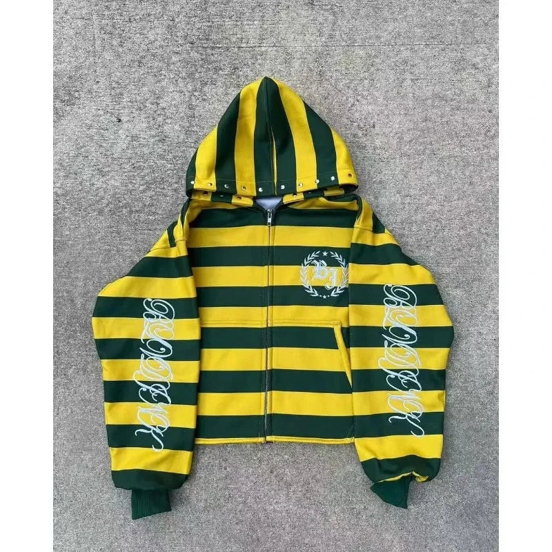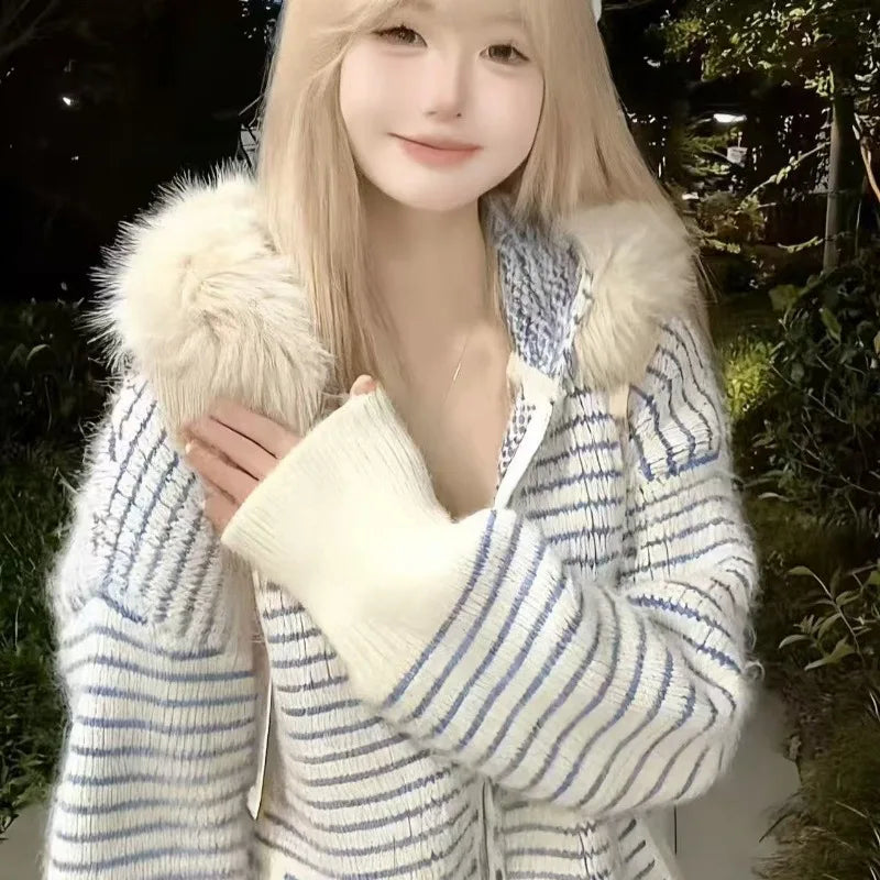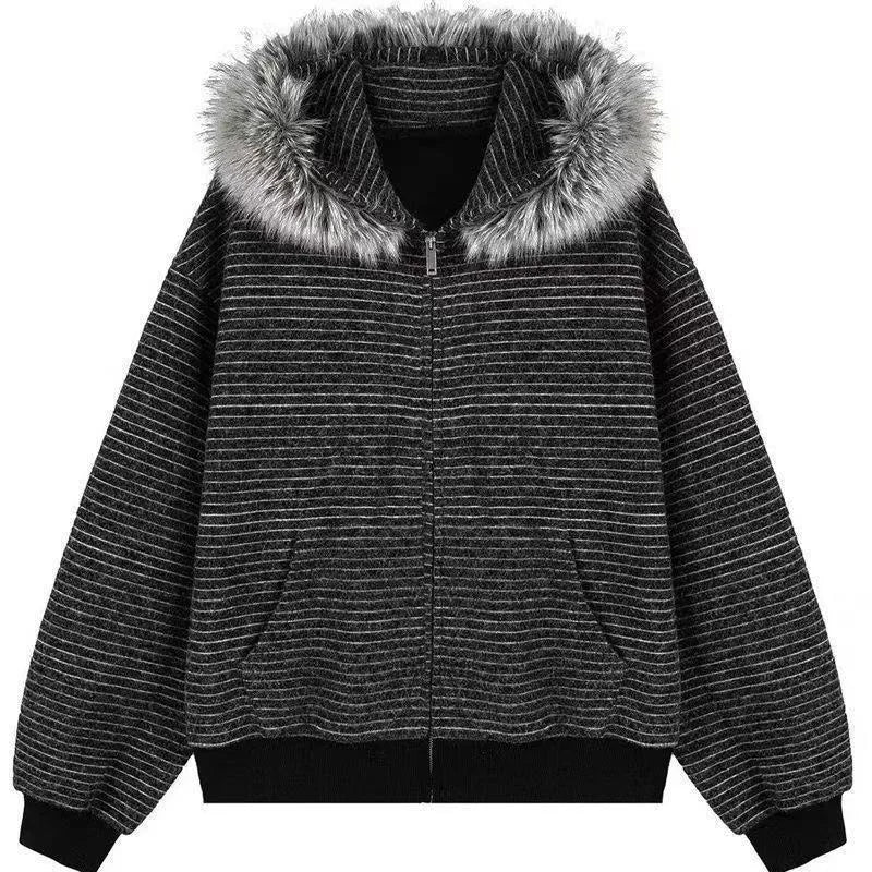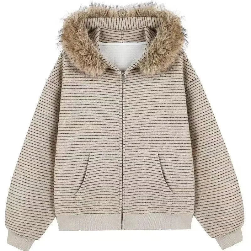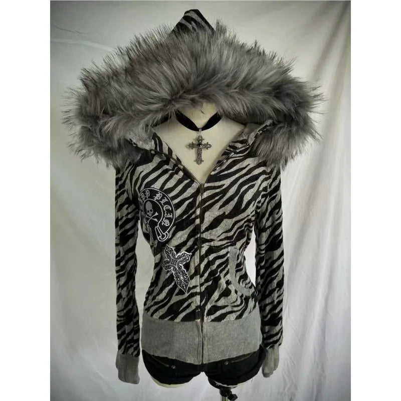 Women's Gothic Letter Skull Print Striped Fur Collar Slim Zip Up Hoodie