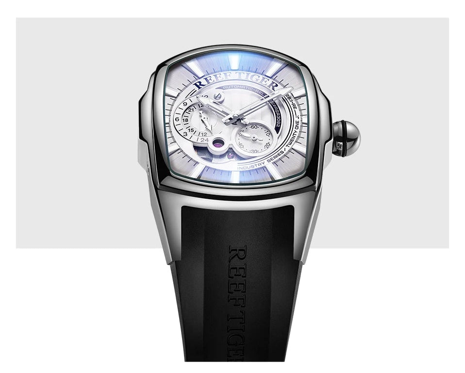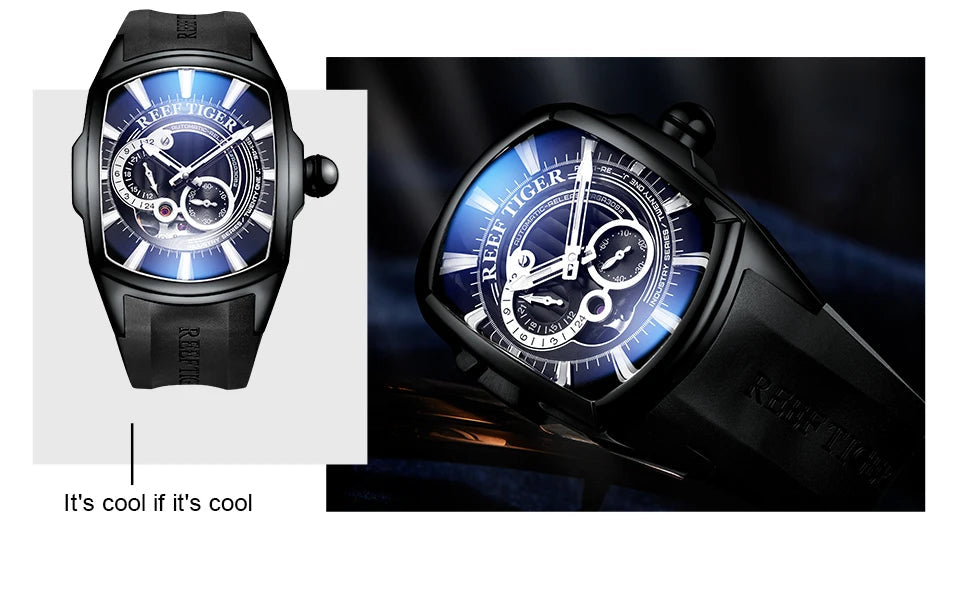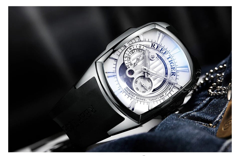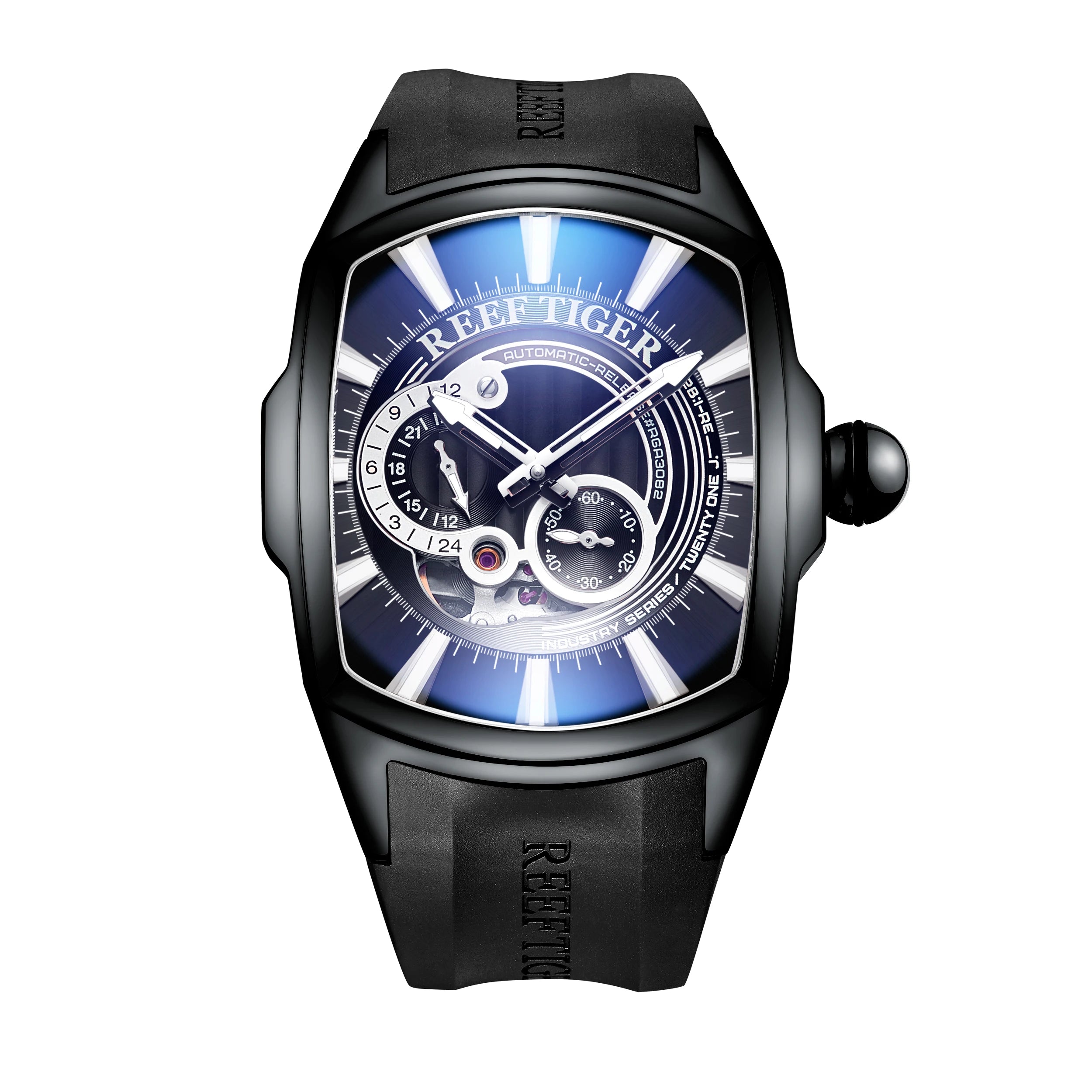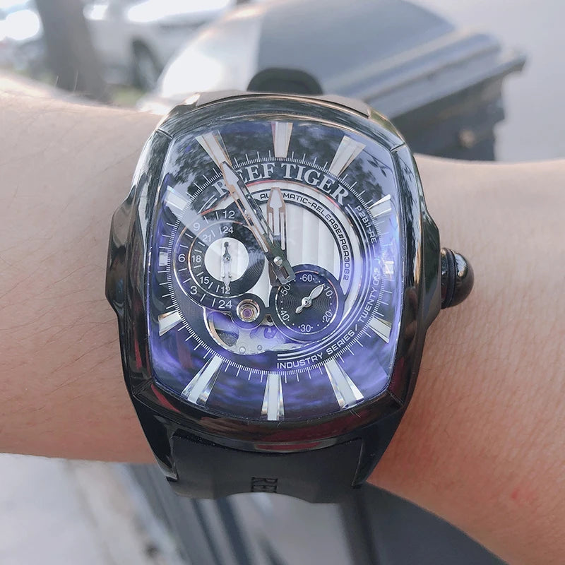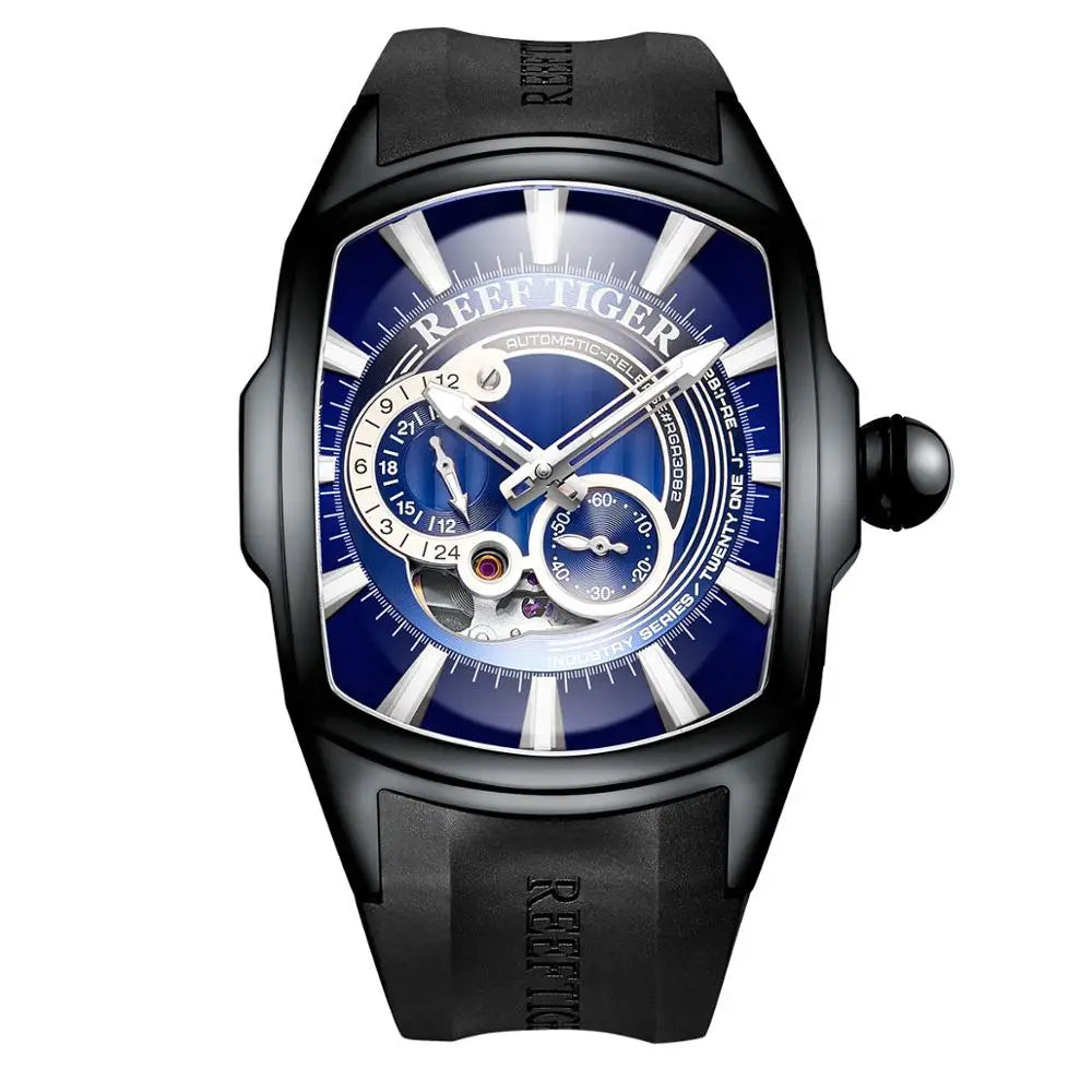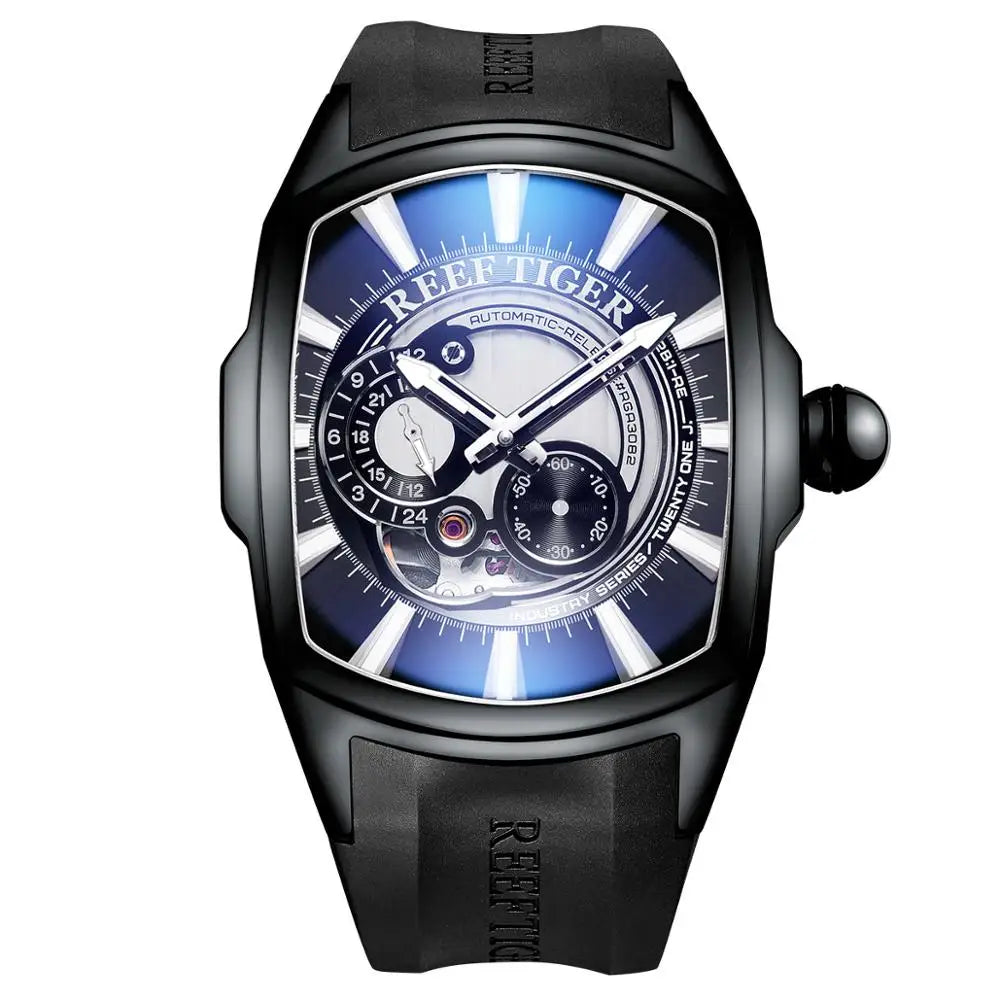 Men's Automatic All Black Rubber Strap Tonneau Case Waterproof Sports Watch