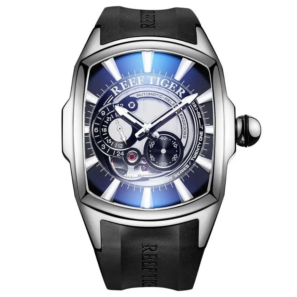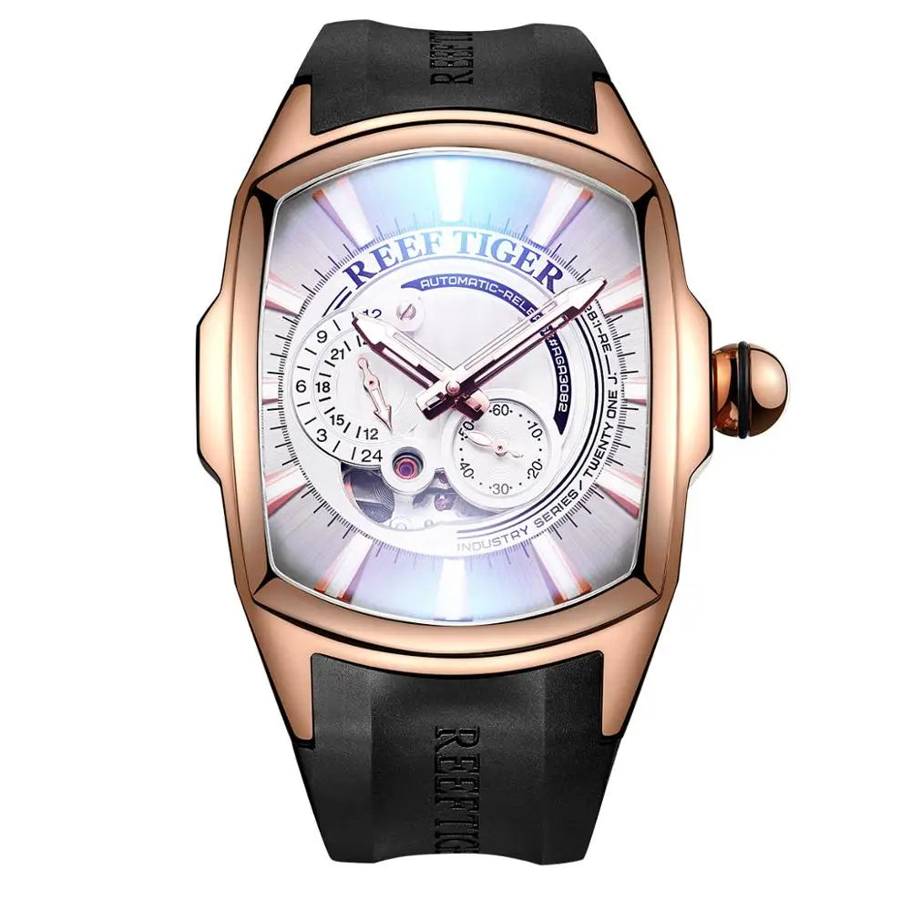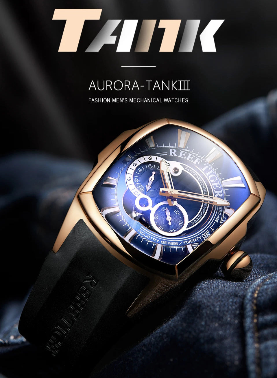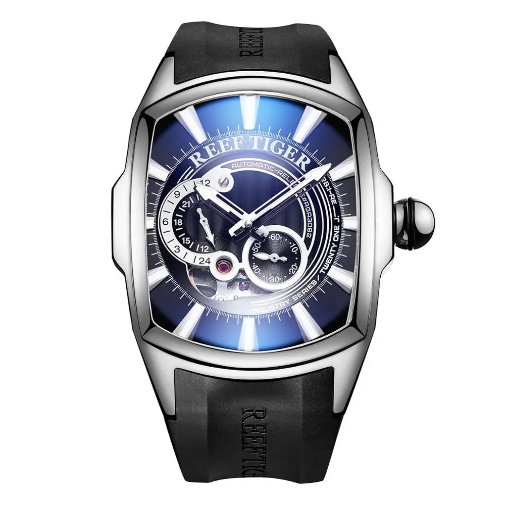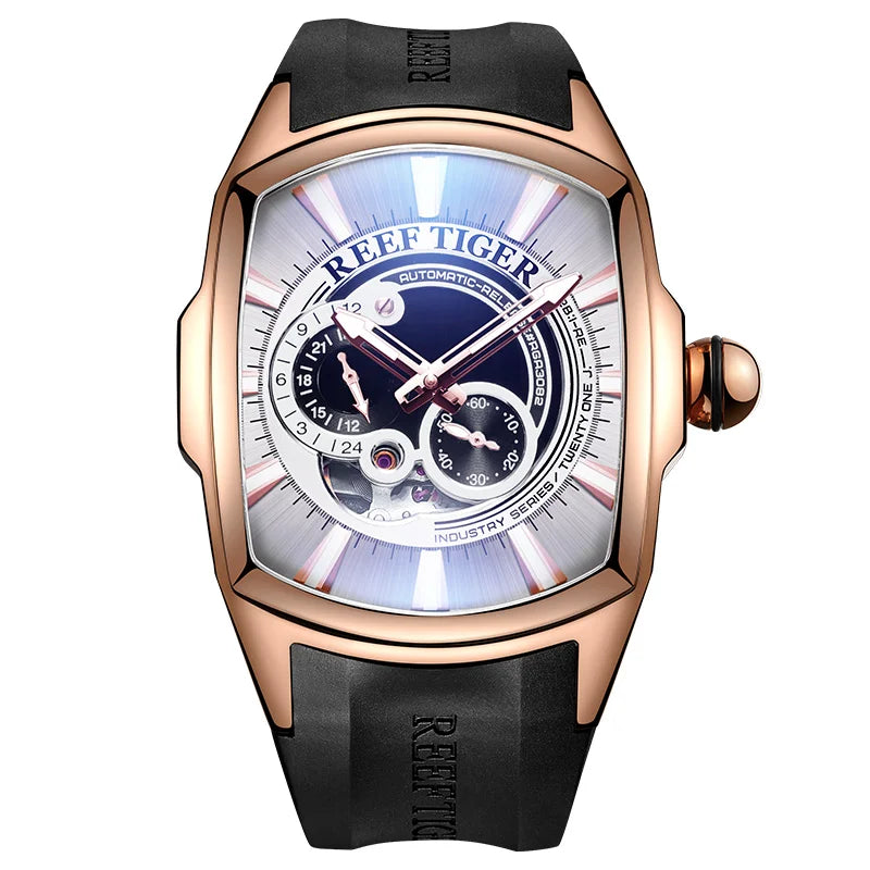 Men's Automatic All Black Rubber Strap Tonneau Case Waterproof Sports Watch