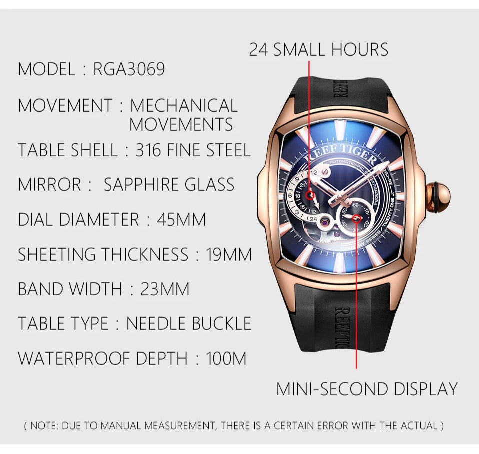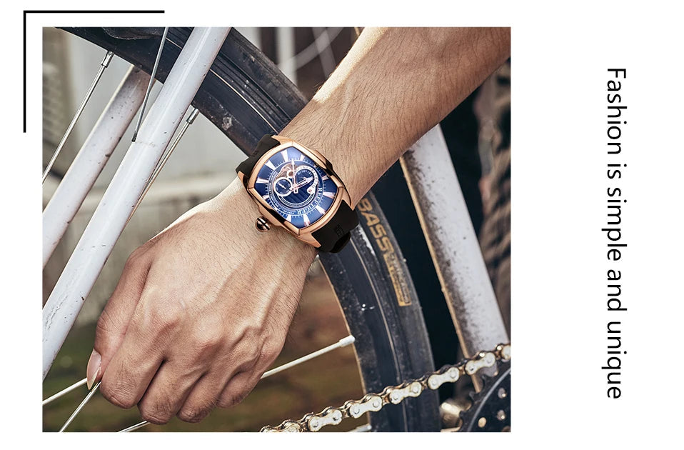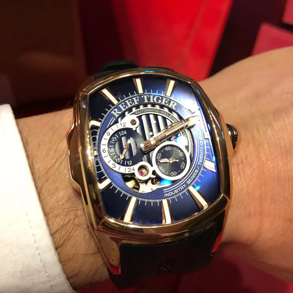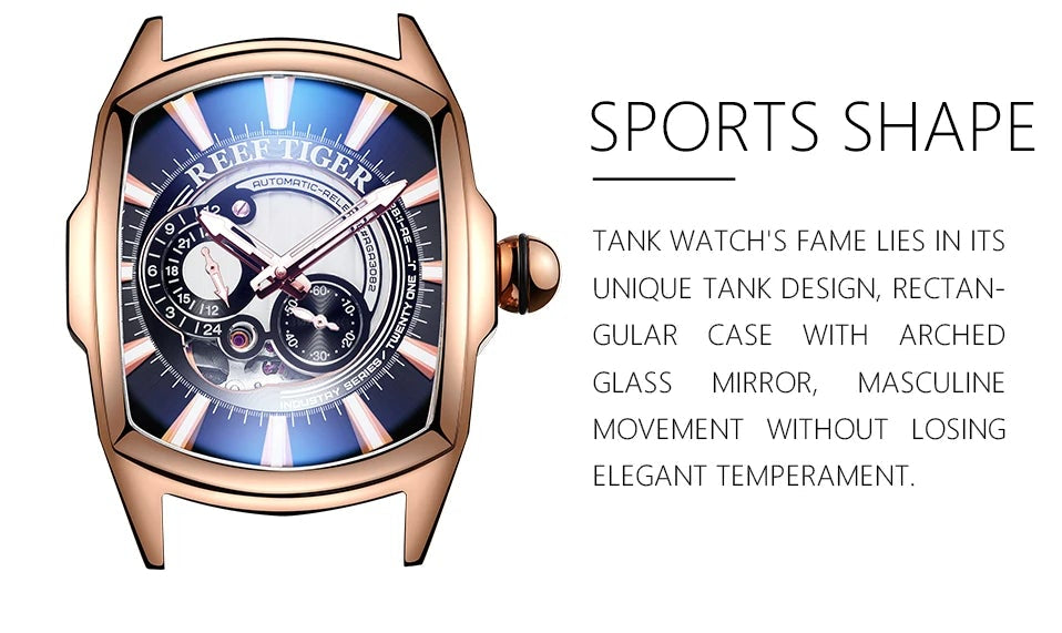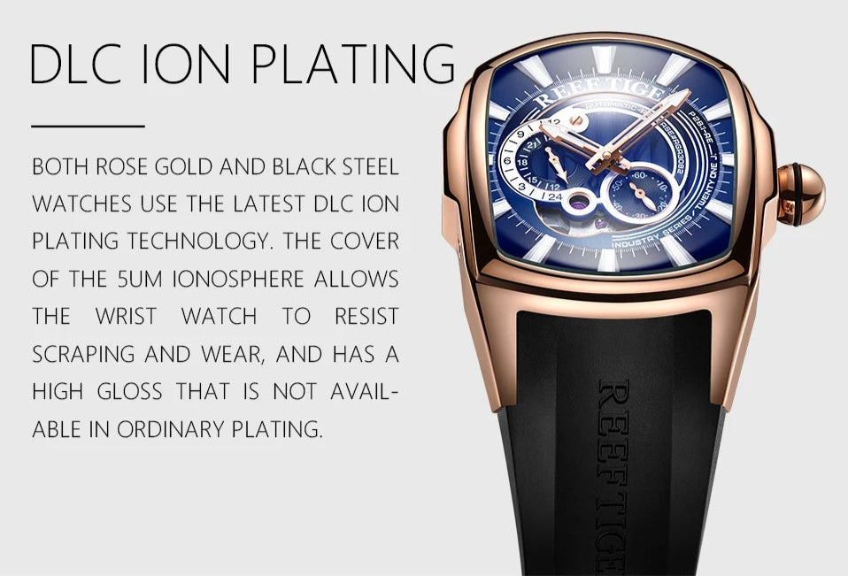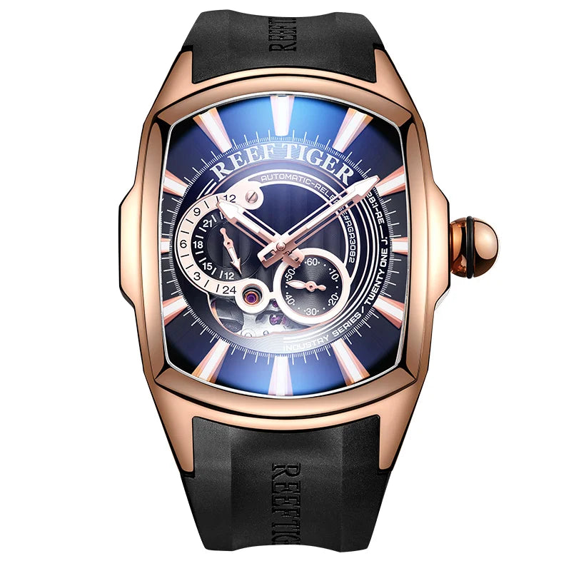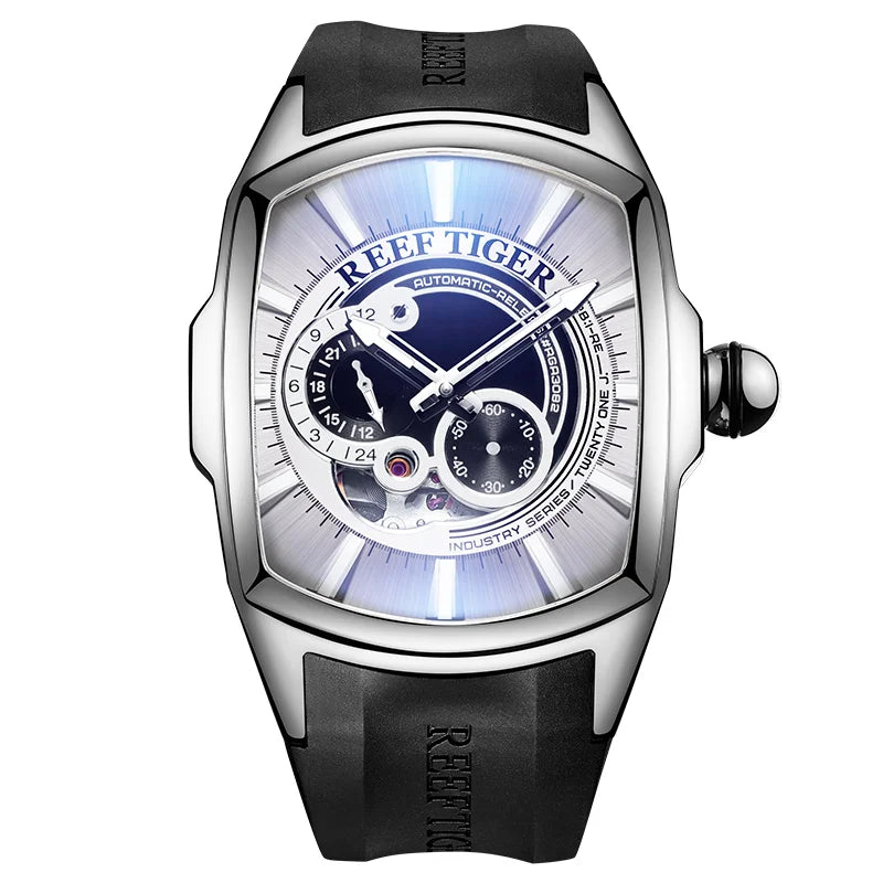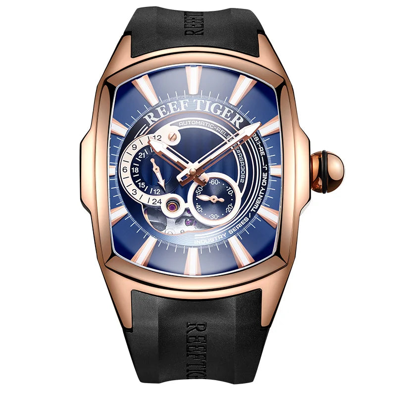 Men's Automatic All Black Rubber Strap Tonneau Case Waterproof Sports Watch