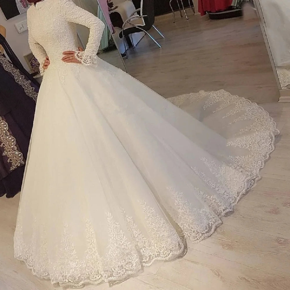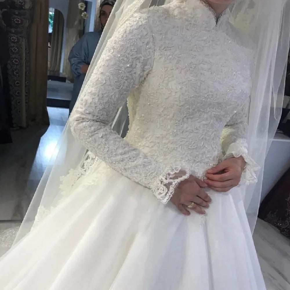 Arabic Luxury Sequin Lace Appliques Full Lining Stand Collar Wedding Dress