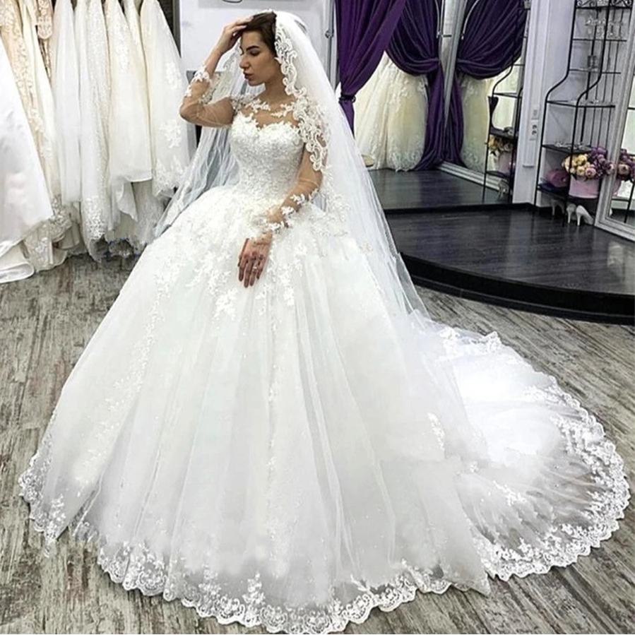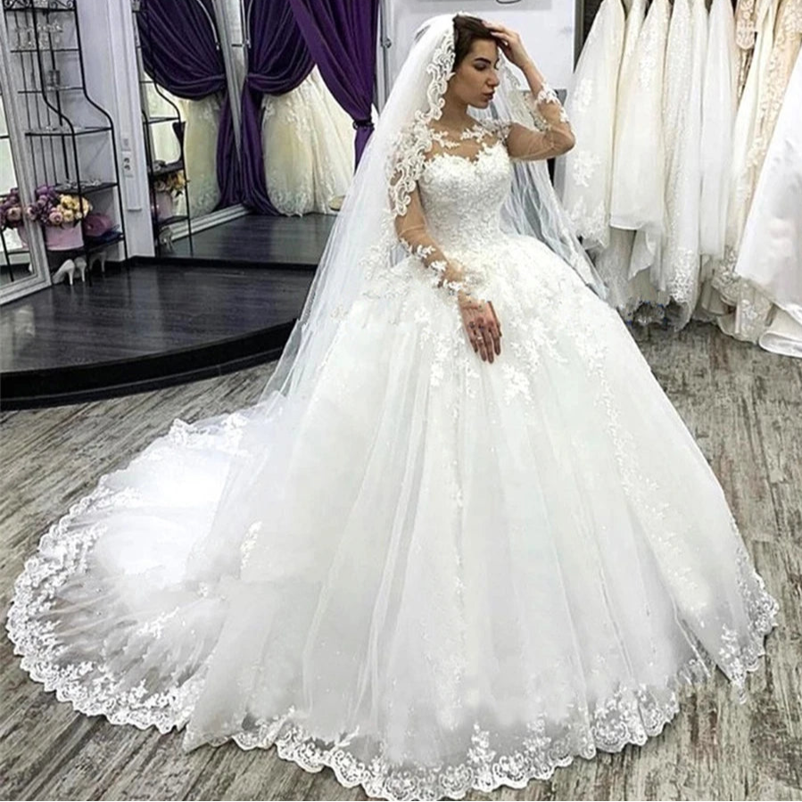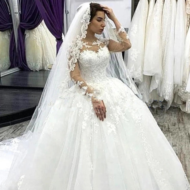 Fluffy Appliques Lace Illusion Ball Bridal Gown Wedding Dress With Long Sleeves