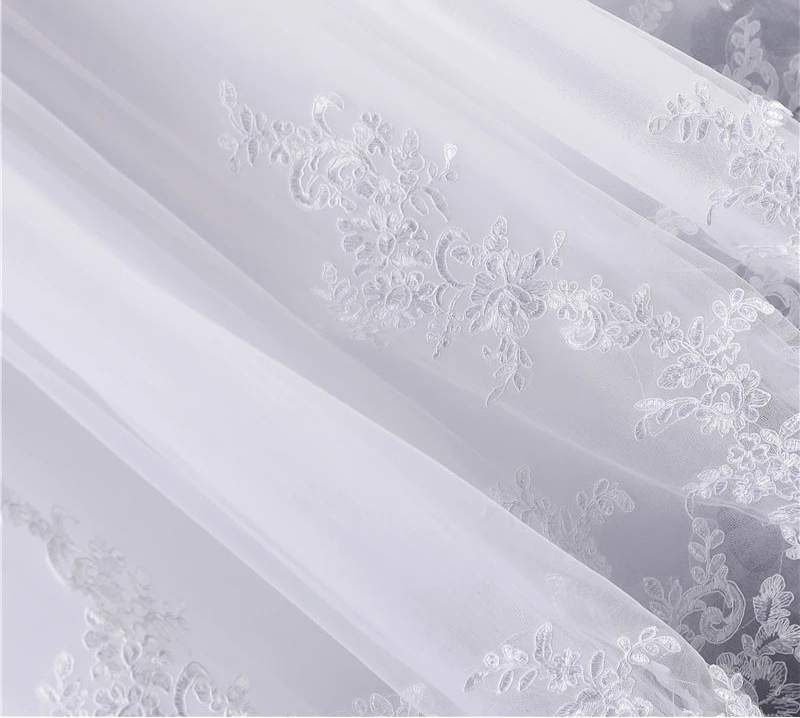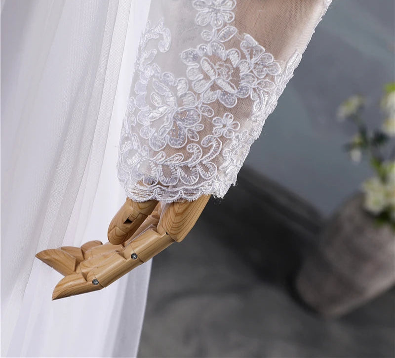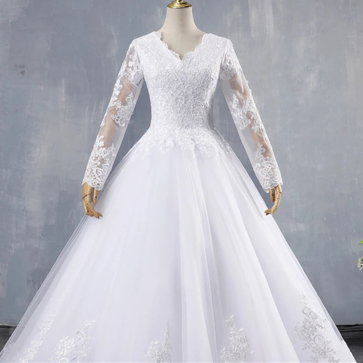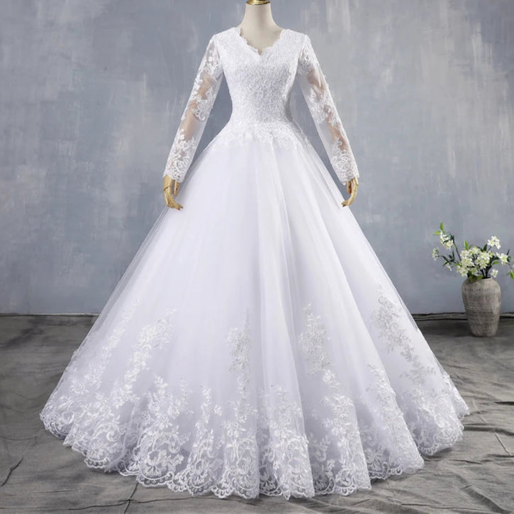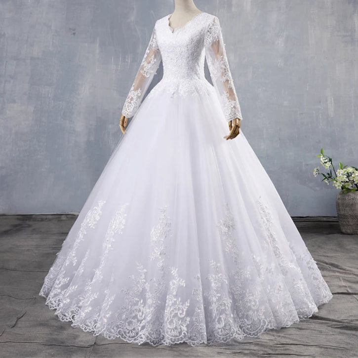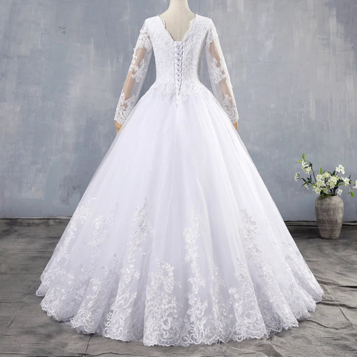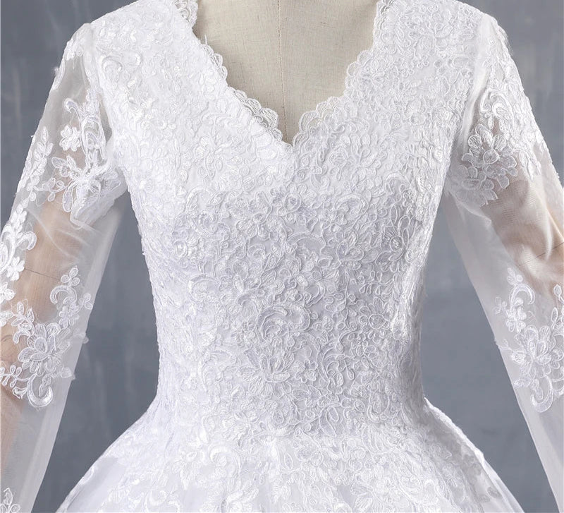 Lace Wedding Dress V Neck Long Sleeve White Ivory Ball Gown with Lace Edge