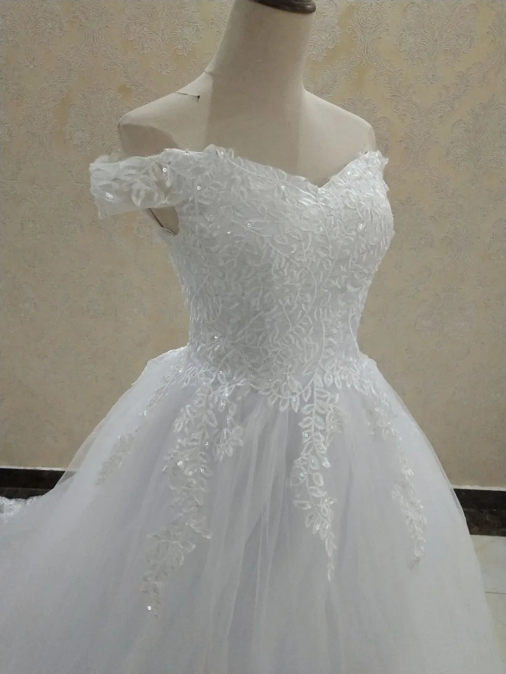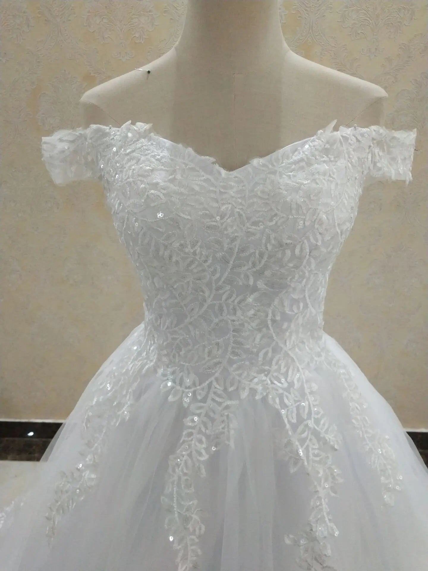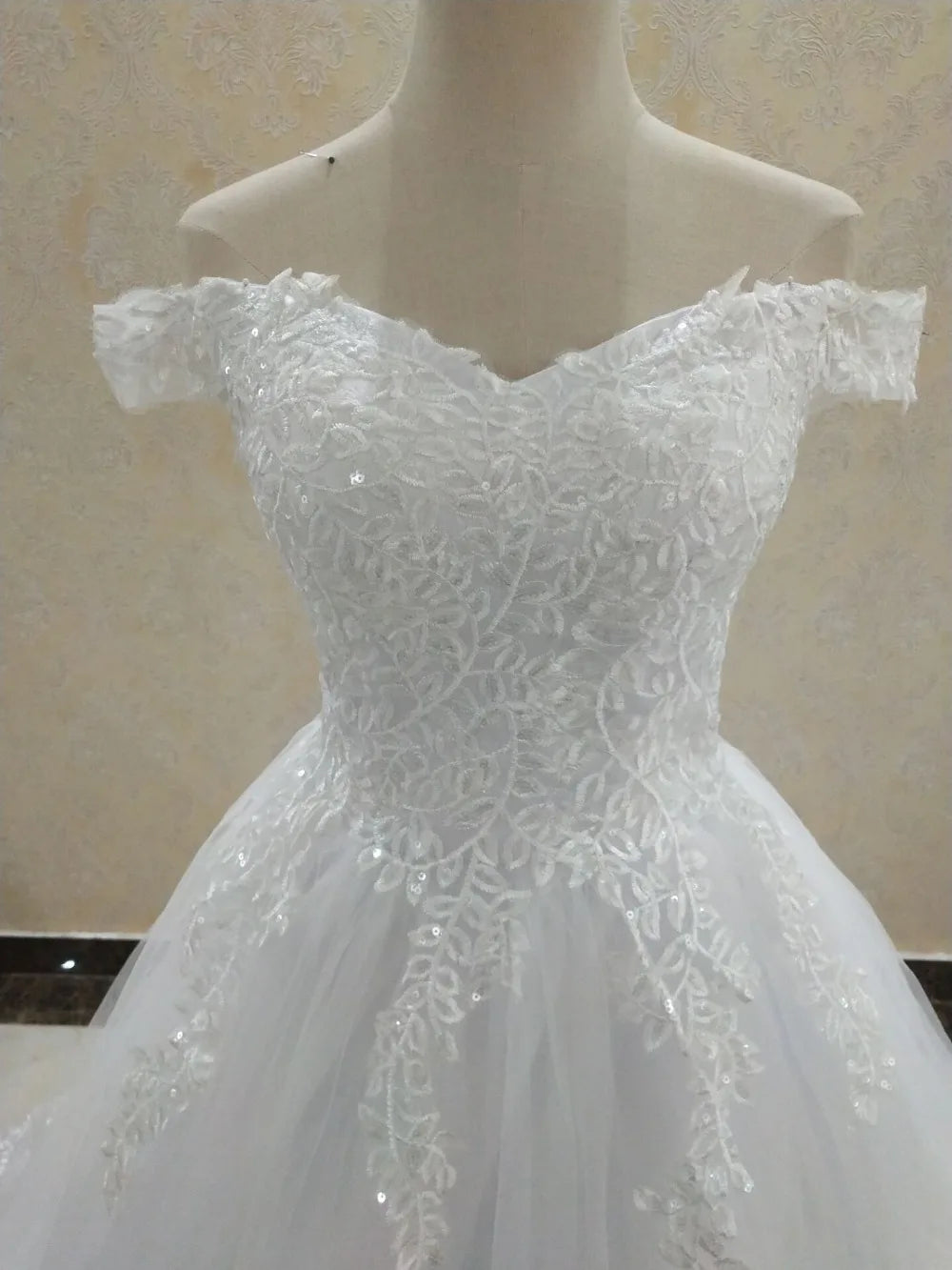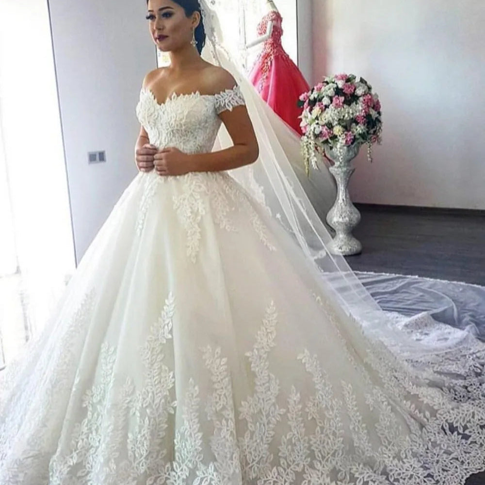 Off Shoulder Applique Lace Princess Wedding Gown Dress for Bride
