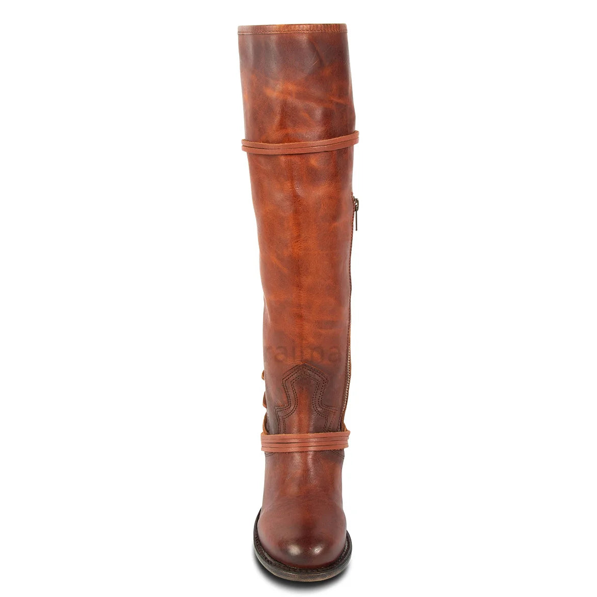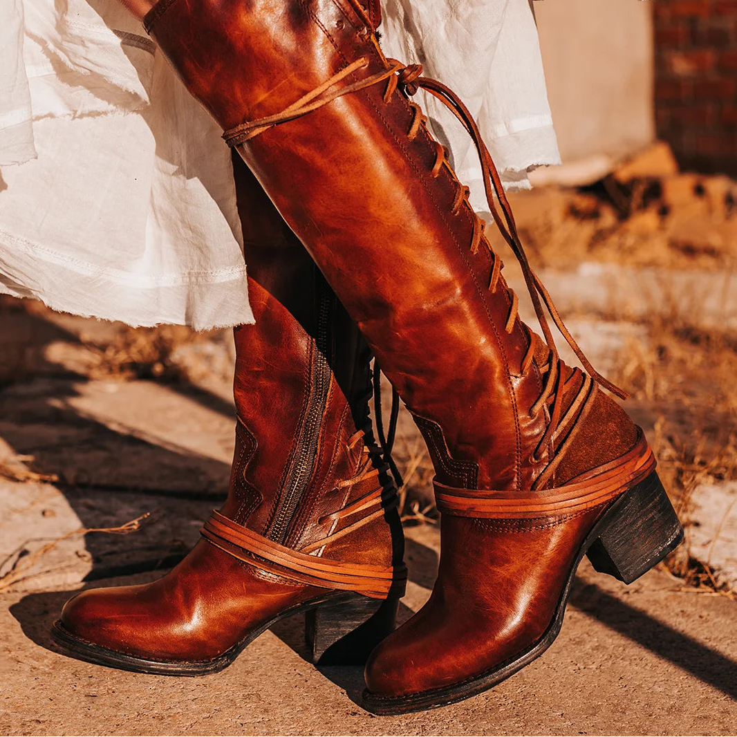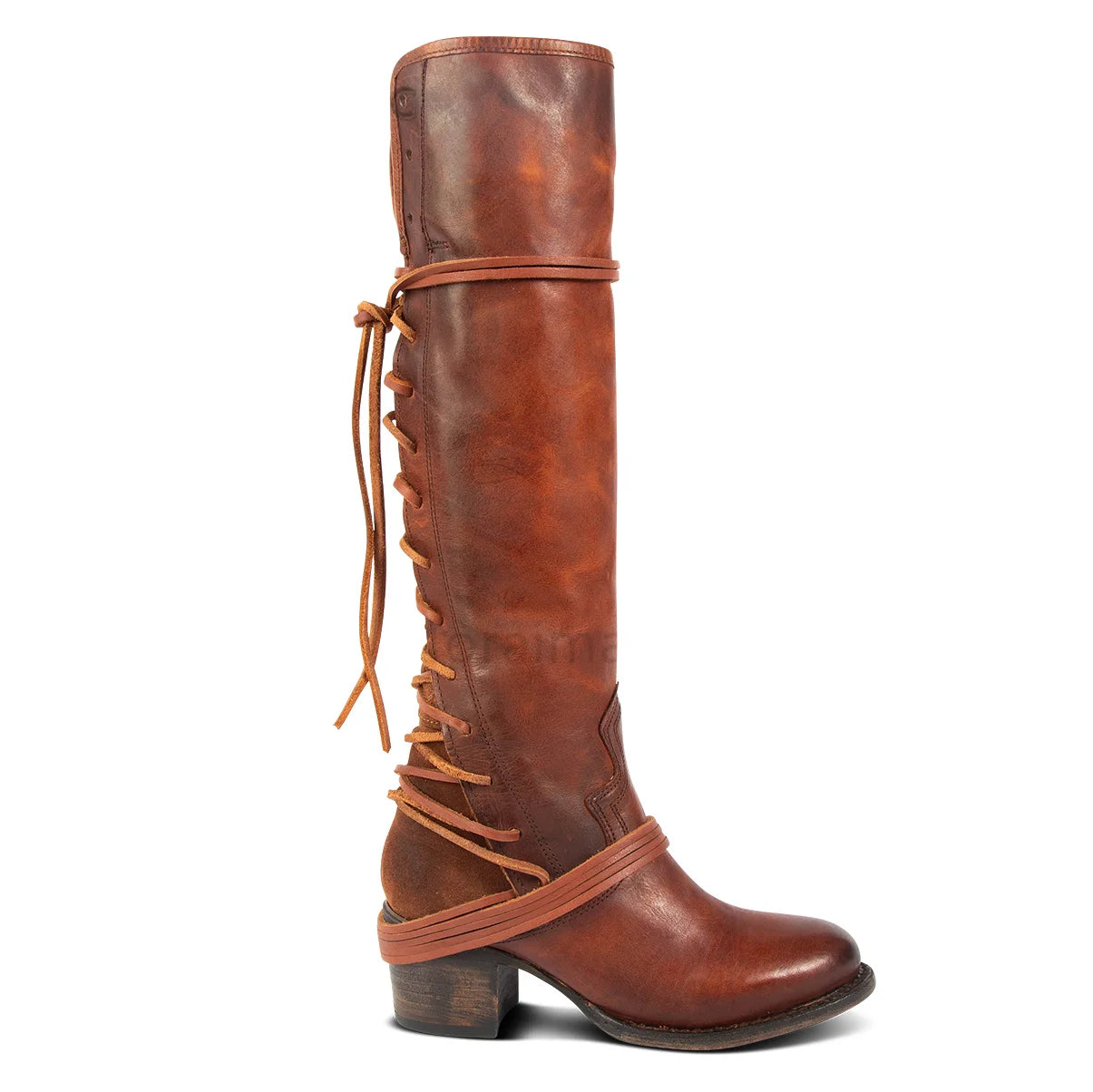 Looking for a stylish pair of boots for a cowboy look? Then this is for you. Available in a retro brown shade with chunky heels and lace-up closure, these knee-high boots are made with a genuine leather upper and rubber outsole. For the fashionable women!