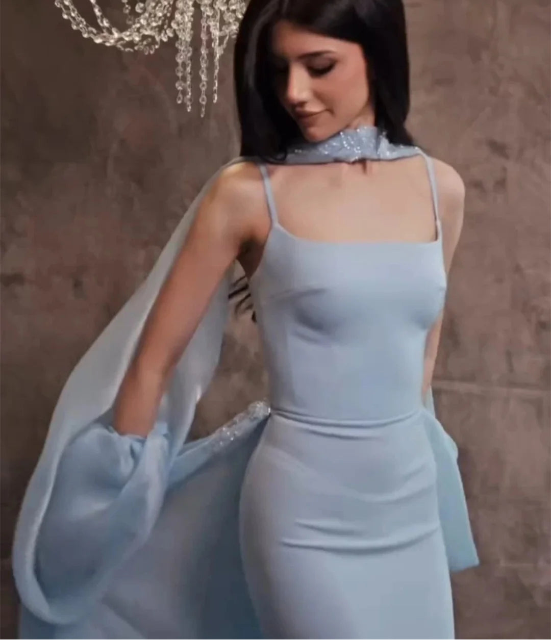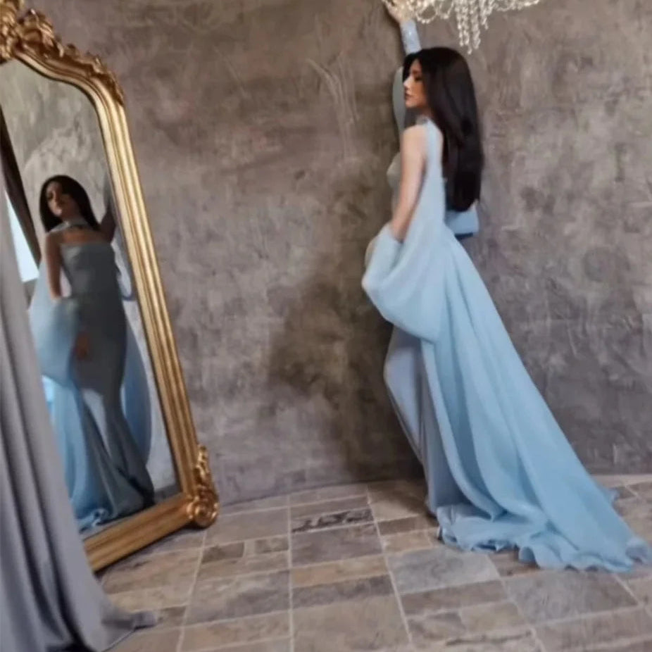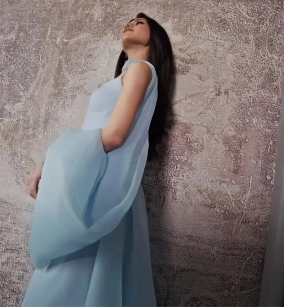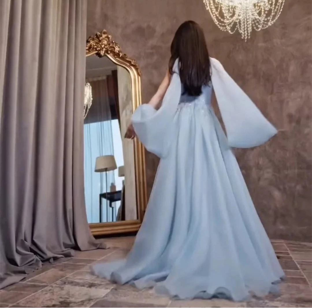 Elegant Chiffon Sky Blue Shawl Ball Gown Prom Dress for Women