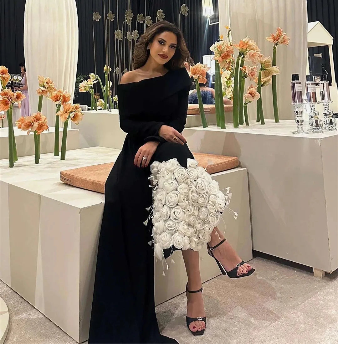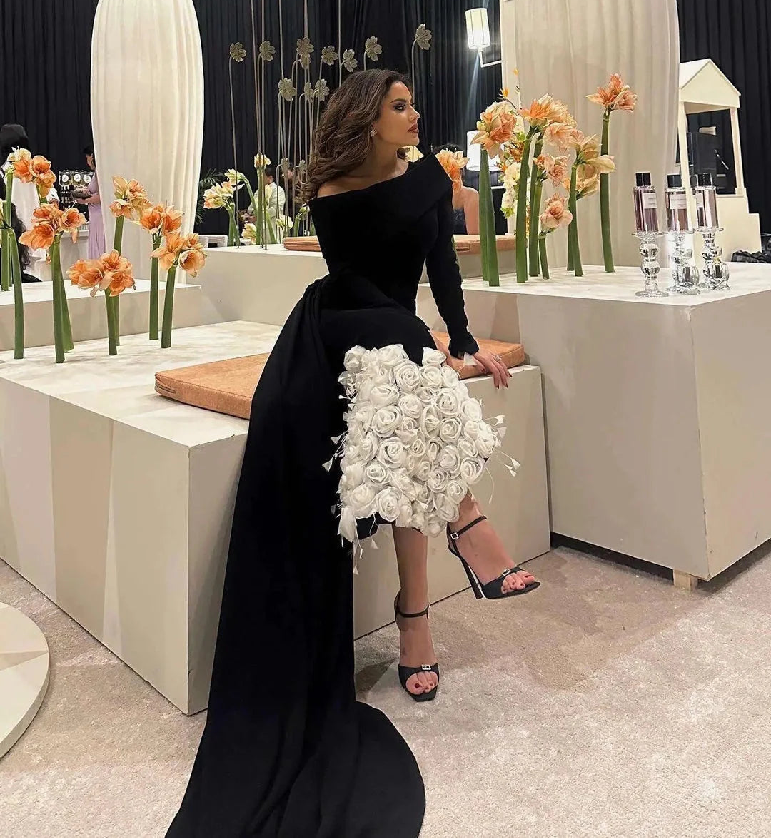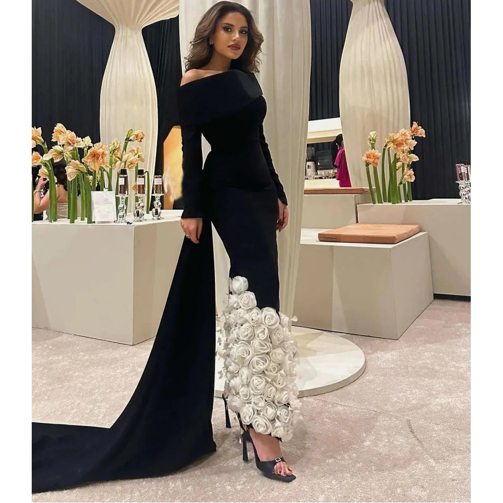Women's 3D Flowers Fish Tail Black Long Sleeve Evening Prom Dress
