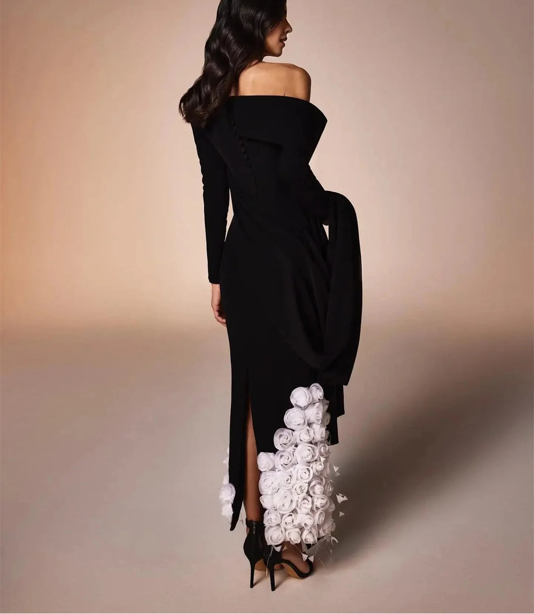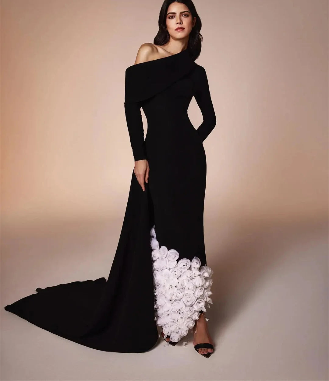 This fish-tail long prom dress is designed in a classic black and white color combo and finished with 3D flowers for a modern twist. The polyester fabric makes it perfect for long-time wear and the long sleeves add elegance to the dress. This dress is your go-to choice for comfort and style. Don't miss it!