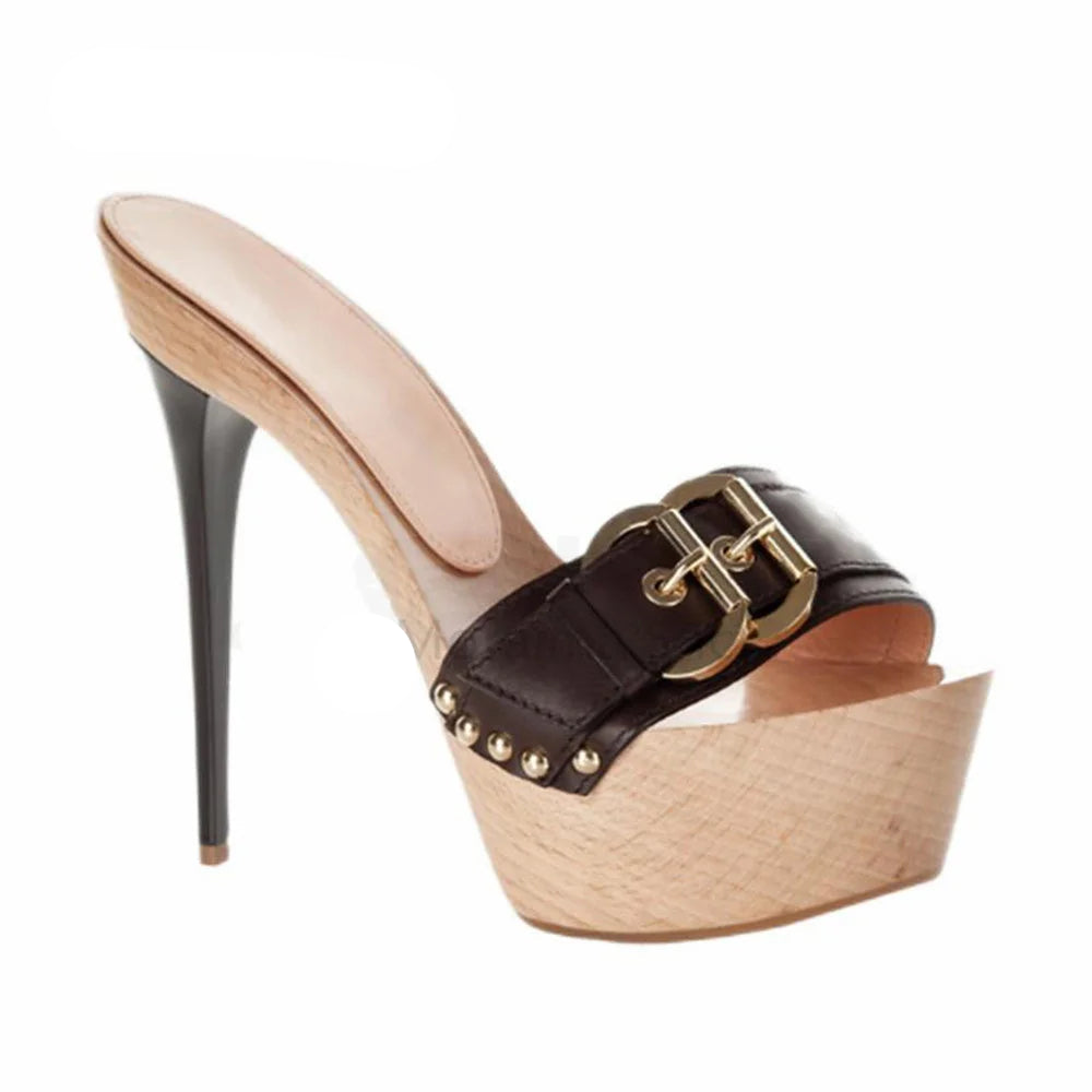 Metal Decorative Belt Buckle Platform Stiletto High Heel Slippers for Women