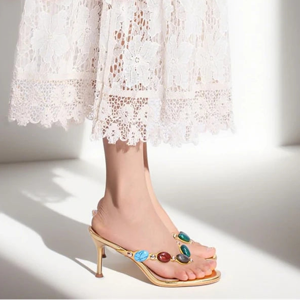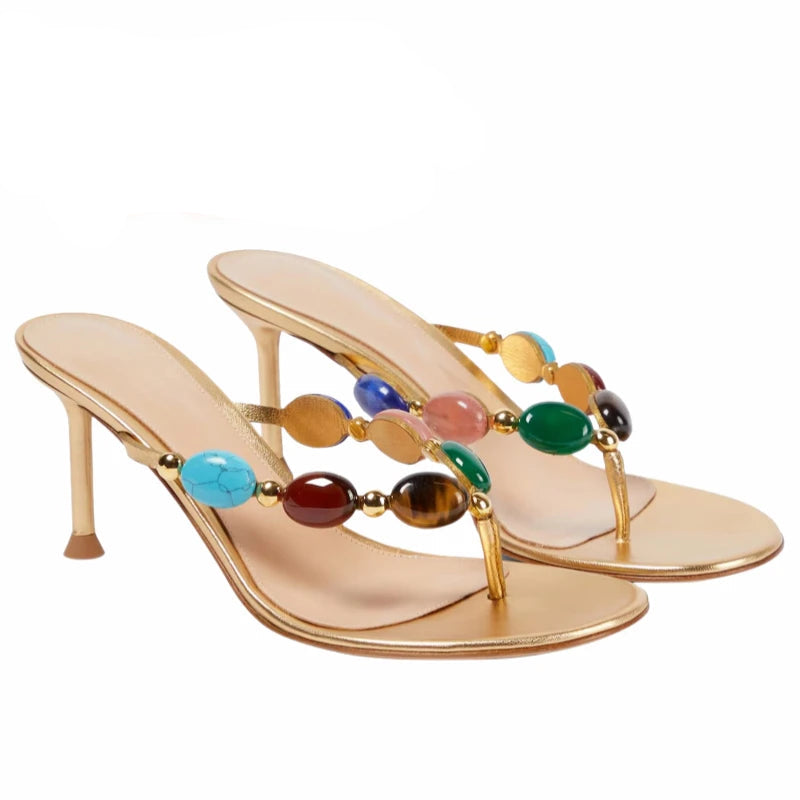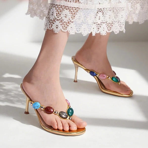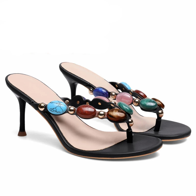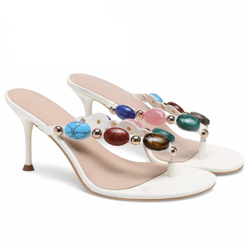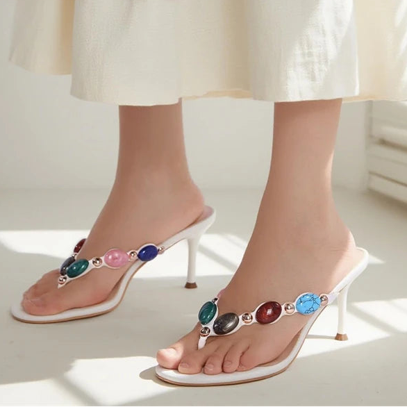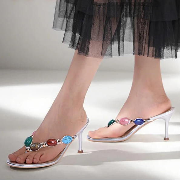 Women's Kitten Heels Round Open Toe Jeweled Strappy Flipflop Mules for Summer