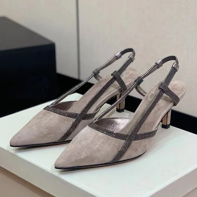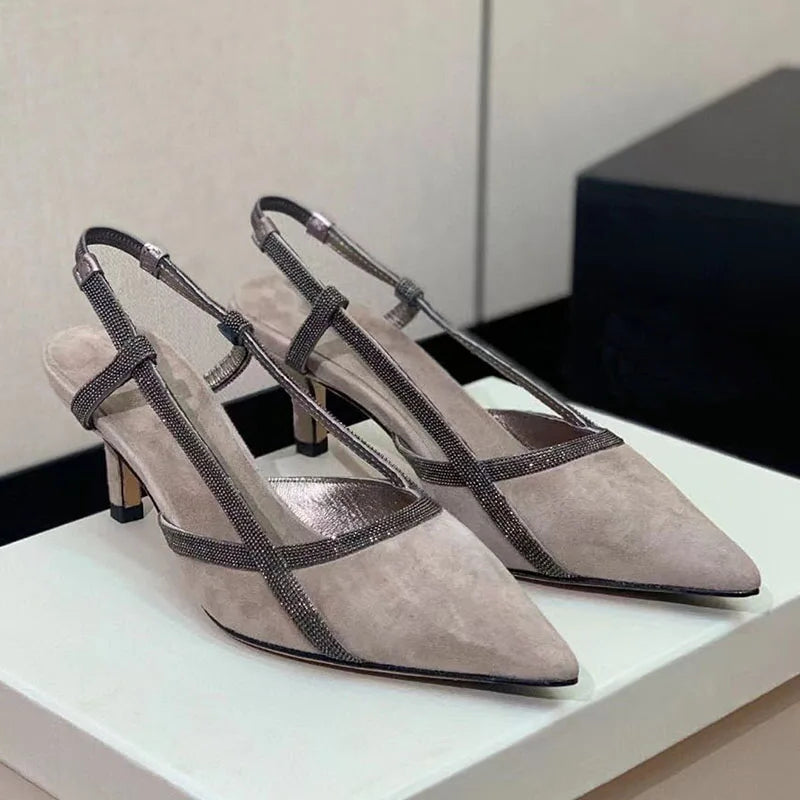 Women's Gray 5cm High Heels Pointed Toe Slingbacks Suede Leather Runway Shoes