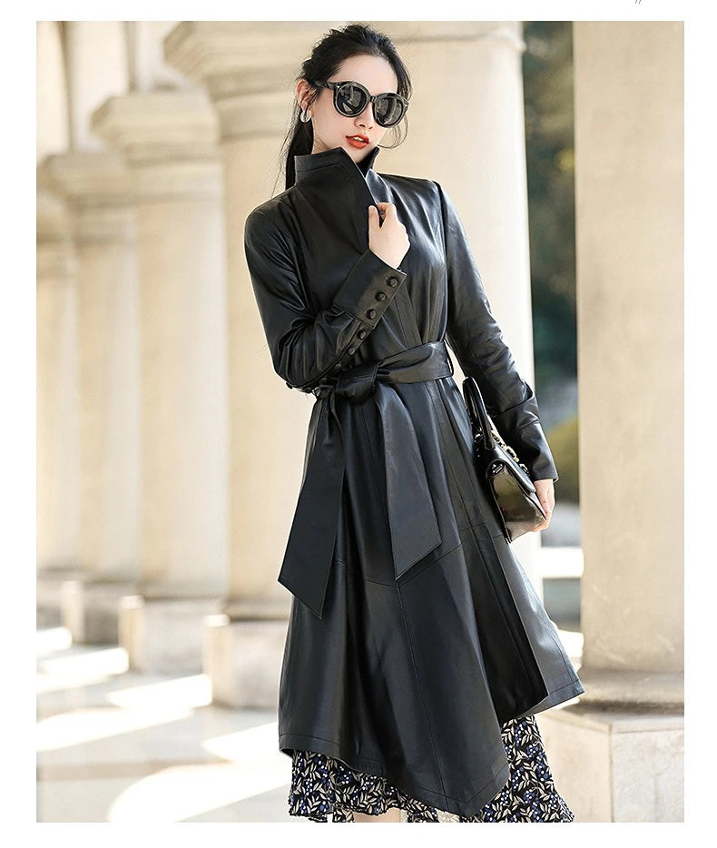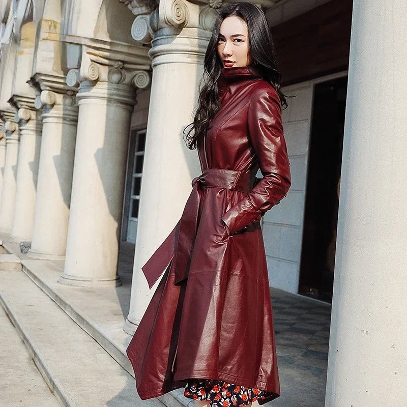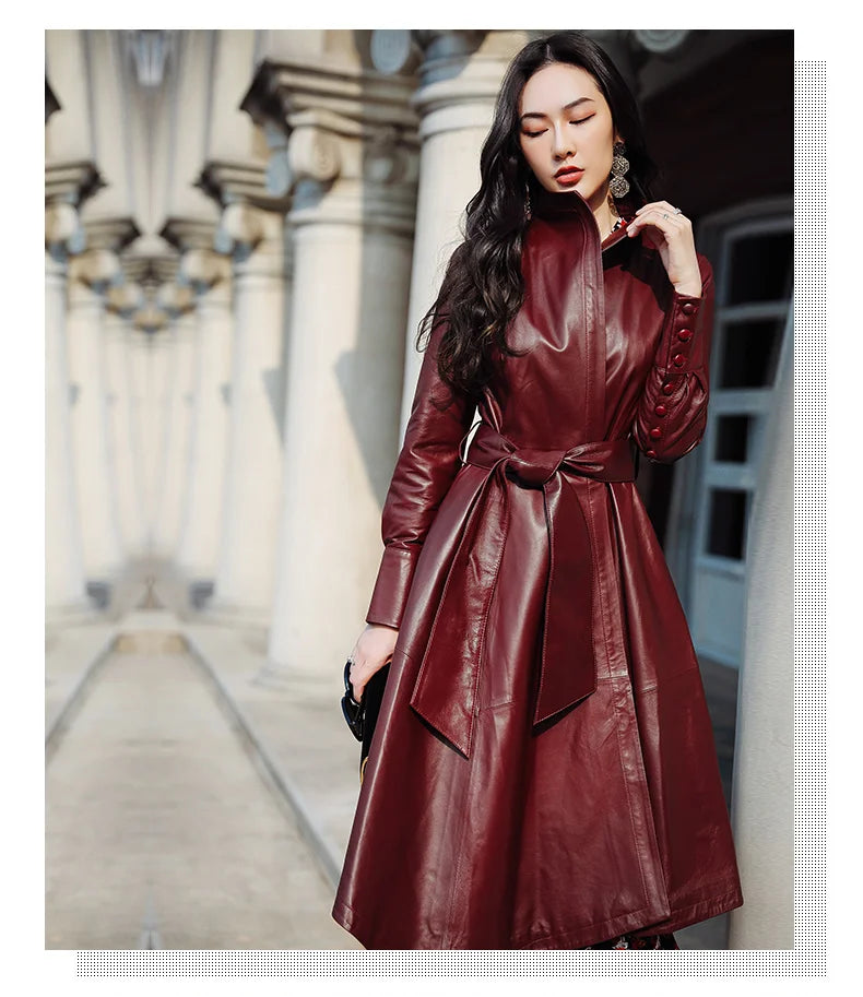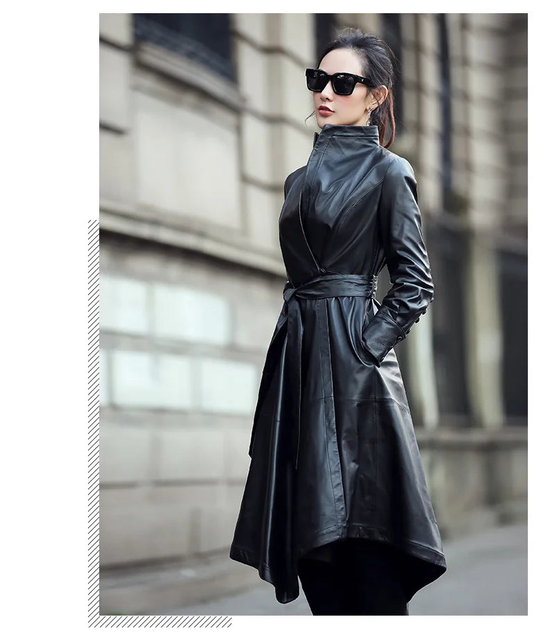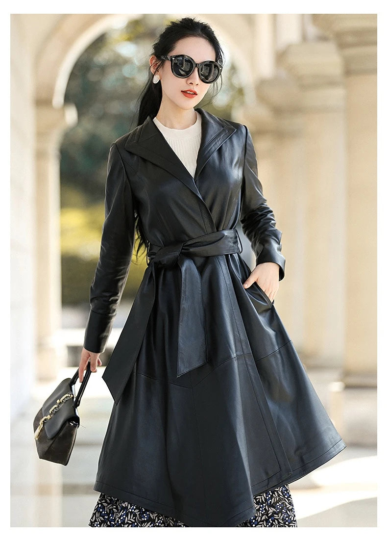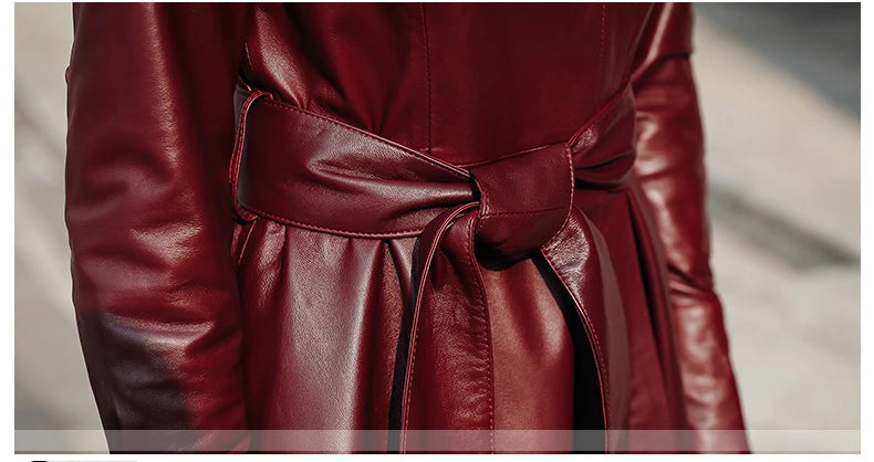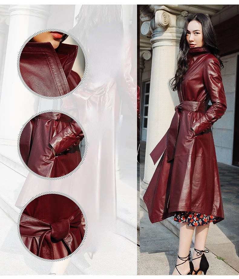 Autumn Fashion Genuine Leather Long Trench Coat for Women